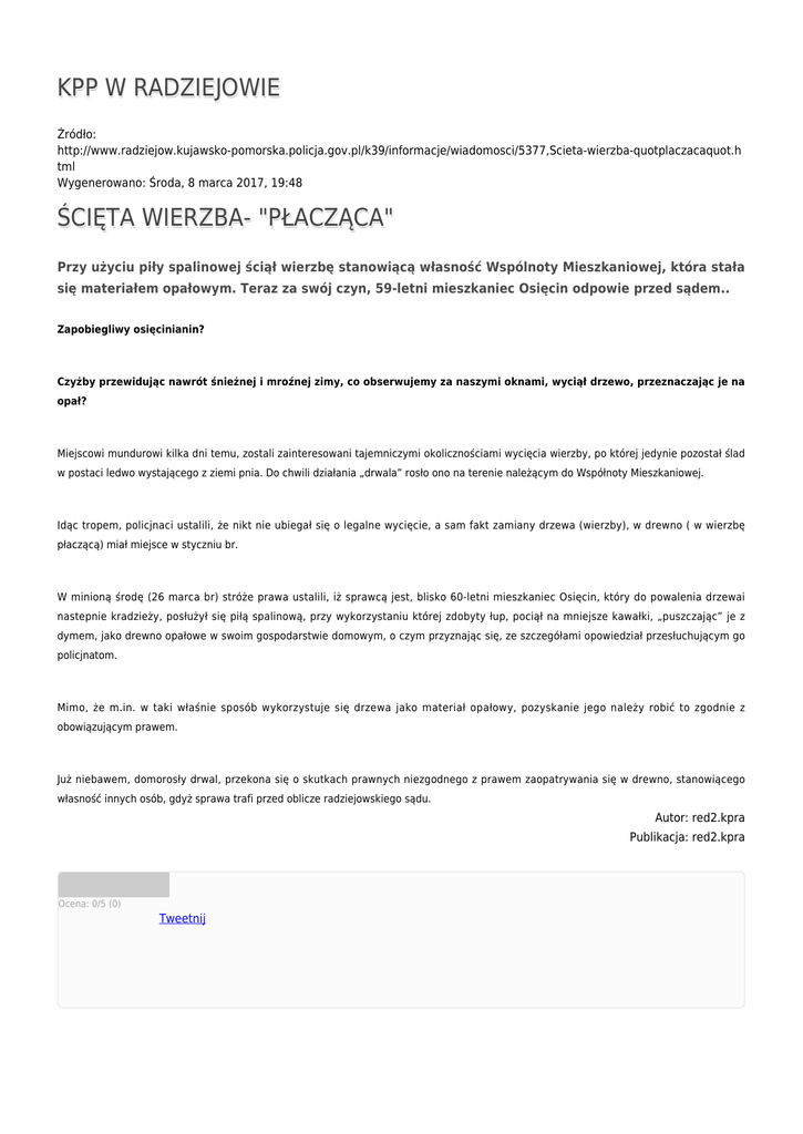 KPP W RADZIEJOWIE Źródło: http://www.radziejow.kujawsko-pomorska.policja.gov.pl/k39/informacje/wiadomosci/5377,Scieta-wierzba-quotplaczacaquot.h tml Wygenerowano: Środa, 8 marca 2017, 19:48 ŚCIĘTA WIERZBA- "PŁACZĄCA" Przy użyciu piły spalinowej ściął wierzbę stanowiącą własność Wspólnoty Mieszkaniowej, która stała się materiałem opałowym. Teraz za swój czyn, 59-letni mieszkaniec Osięcin odpowie przed sądem.. Zapobiegliwy osięcinianin? Czyżby przewidując nawrót śnieżnej i mroźnej zimy, co obserwujemy za naszymi oknami, wyciął drzewo, przeznaczając je na opał? Miejscowi mundurowi kilka dni temu, zostali zainteresowani tajemniczymi okolicznościami wycięcia wierzby, po której jedynie pozostał ślad w postaci ledwo wystającego z ziemi pnia. Do chwili działania „drwala” rosło ono na terenie należącym do Współnoty Mieszkaniowej. Idąc tropem, policjnaci ustalili, że nikt nie ubiegał się o legalne wycięcie, a sam fakt zamiany drzewa (wierzby), w drewno ( w wierzbę płaczącą) miał miejsce w styczniu br. W minioną środę (26 marca br) stróże prawa ustalili, iż sprawcą jest, blisko 60-letni mieszkaniec Osięcin, który do powalenia drzewai nastepnie kradzieży, posłużył się piłą spalinową, przy wykorzystaniu której zdobyty łup, pociął na mniejsze kawałki, „puszczając” je z dymem, jako drewno opałowe w swoim gospodarstwie domowym, o czym przyznając się, ze szczegółami opowiedział przesłuchującym go policjnatom. Mimo, że m.in. w taki właśnie sposób wykorzystuje się drzewa jako materiał opałowy, pozyskanie jego należy robić to zgodnie z obowiązującym prawem. Już niebawem, domorosły drwal, przekona się o skutkach prawnych niezgodnego z prawem zaopatrywania się w drewno, stanowiącego własność innych osób, gdyż sprawa trafi przed oblicze radziejowskiego sądu. Autor: red2.kpra Publikacja: red2.kpra Ocena: 0/5 (0) Tweetnij