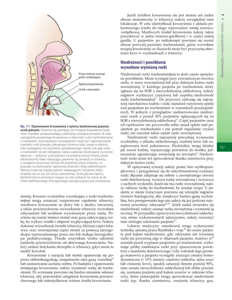 Niedrożność i powikłania wywołane wymianą rurki Przez stomię wsunąć palec wskazujący Tętnica bezimienna Ucisk z zewnątrz Ryc. 7-1 Opanowanie krwawienia z tętnicy bezimiennej poprzez ucisk palcami. Powinno się pamiętać, że mniejsze krwawienie może mieć charakter przepowiadający późniejszy poważny krwotok. W razie wystąpienia poważnego krwawienia w obecności rurki tracheotomijnej z mankietem, tymczasowym rozwiązaniem może być napompowanie mankietu rurki powyżej zalecanego ciśnienia (zob. uwagi w tekście). Gdy rozwiązanie nie przyniesie spodziewanego wyniku lub gdy rurka z mankietem nie jest dostępna, należy wykonać zilustrowany na rycinie rękoczyn – wykonać ucisk palcami na przednią ścianę tchawicy przez tracheostomię. Palec wskazujący powinno się umieścić w tchawicy, a następnie przycisnąć od tyłu do przedniej ściany tchawicy, co pozwala na zachowanie częściowej drożności dróg oddechowych. Tętnicę ściska się między palcem wskazującym i kciukiem, który znajduje się na szyi od strony zewnętrznej. Ucisk palcami tętnicy bezimiennej to procedura mająca na celu zyskanie na czasie aż do chwili definitywnego chirurgicznego usunięcia przyczyny krwawienia. stomię. Krwawe wydzieliny wyciekające z rurki tracheotomijnej mogą oznaczać rozproszone zapalenie tchawicy, resztkowe krwawienie ze skóry lub z okolicy tarczowej, a także powierzchowne owrzodzenie tchawicy wywołane odsysaniem lub uciskiem wywieranym przez rurkę. Powinno się ocenić miejsce stomii oraz gazę zakrywającą rurkę, by wykryć źródło i objętość wypływającej krwi. Należy dokonać wizualizacji światła tchawicy, bliższej części tchawicy oraz wewnętrznej części stomii za pomocą laryngoskopu wprowadzanego przez nos lub małego laryngoskopu pediatrycznego. Przede wszystkim trzeba odróżnić nadżerki powierzchowne od aktywnego krwawienia. Należy unikać dotykania skrzeplin w tchawicy, gdyż może to nasilić krwotok. Krwawienie z nacięcia lub stomii opanowuje się poprzez elektrokoagulację, zaopatrzenie rany gazą, wazeliną14 lub zastosowanie azotanu srebra. Po badaniu i opanowaniu mniejszego krwawienia, należy wymienić rurkę do tracheotomii. Po wymianie powinno się bardzo starannie odessać tchawicę, aby potwierdzić ustąpienie krwawienia powierzchownego lub zidentyfikować wtórne źródła krwawienia. Niedrożność rurki tracheotomijnej to dość często spotykane powikłanie. Może wystąpić przy zewnętrznym otworze rurki, w rurce wewnętrznej lub przy dalszym końcu rurki zewnętrznej. U każdego pacjenta po tracheotomii, który zgłasza się na SOR z niewydolnością oddechową, należy najpierw wykluczyć częściową lub zupełną niedrożność rurki tracheotomijnej17. Do przyczyn zaliczają się najczęściej niewłaściwa toaleta i niski standard rutynowej opieki nad pacjentem po tracheotomii w warunkach pozaszpitalnych. W jednym z przeglądów zaobserwowano niedrożność rurek u ponad 30% pacjentów zgłaszających się na SOR z niewydolnością oddechową13. Część pacjentów oraz ich opiekunów nie przyswoiła sobie zasad opieki nad pacjentem po tracheotomii i nie potrafi regularnie czyścić rurki, nie rozumie także zadań rurki wewnętrznej. Niedrożność rurki najczęściej powodują wysuszone wydzieliny z układu oddechowego, rzadziej krew lub zaaspirowana treść pokarmowa. Wydzieliny mogą działać jak zawór kulisty, wpuszczając powietrze do środka, jednocześnie ograniczając wentylację na zewnątrz5. Niedrożność rurki może też spowodować tkanka ziarninowa przy dalszym końcu rurki. W opisywanej sytuacji należy podać tlen szybkoprzepływowy i przygotować się do natychmiastowej wymiany rurki. Ręcznie zdejmuje się osłony z zewnętrznego otworu rurki dotchawiczej, wysuwa rurkę wewnętrzną i oczyszcza z suchych wydzielin. Jeżeli nie ma rurki wewnętrznej, należy odessać rurkę do tracheotomii, by usunąć czopy. U pacjenta w stanie krytycznym powinno się wkroplić najpierw roztwór fizjologiczny, aby zmiękczyć bardzo gęstą wydzielinę, lecz postępowania tego nie zaleca się już podczas rutynowej procedury odsysania18,19. Jeżeli nadal stwierdza się niedrożność, należy usunąć rurkę zewnętrzną i wymienić ją na inną. W przypadku uporczywej niewydolności oddechowej, mimo wykonywanych rękoczynów, należy rozważyć inne etiologie schorzenia pacjenta17. Lekarze medycyny ratunkowej mogą wykorzystać technikę opisaną przez Rumbaka i wsp.20 do oceny pacjenta pod kątem niedrożności, gdy odsysanie ani wymiana rurki nie przyniosą ulgi w objawach pacjenta. Autorzy ci20 oceniali przed wypisem pacjentów po tracheotomii, wykonując próbę zamknięcia rurki przy spuszczonym powietrzu z mankietu dotchawiczego. Gdy wskutek tego prostego manewru u pacjenta wystąpiły znaczące zmiany hemodynamiczne (> 15% zmiany częstości oddechu, tętna oraz/ lub ciśnienia krwi), spadek saturacji tlenem poniżej 90%, inne oznaki niewydolności oddechowej lub obfite pocenie się, oceniano pacjenta pod kątem urazów w zakresie tchawicy, które potencjalnie mogą spowodować niedrożność rurki (np. tkanka ziarninowa, zwężenie tchawicy, guz, 7 Opieka nad pacjentem z tracheostomią Jeżeli źródłem krwawienia nie jest stomia ani żaden obszar anatomiczny w tchawicy, należy uwzględnić inne lokalizacje. W celu identyfikacji krwawienia z układu pokarmowego trzeba do niego wprowadzić sondę nosowo-żołądkową. Możliwych źródeł krwawienia należy także poszukiwać w jamie nosowo-gardłowej i w części ustnej gardła. U pacjentów po radioterapii powinno się ocenić obszar powyżej poziomu tracheostomii, gdzie wywołane terapią krwawienie ze śluzówki może być przyczyną obecności krwi w wydzielinach z tchawicy. 167
