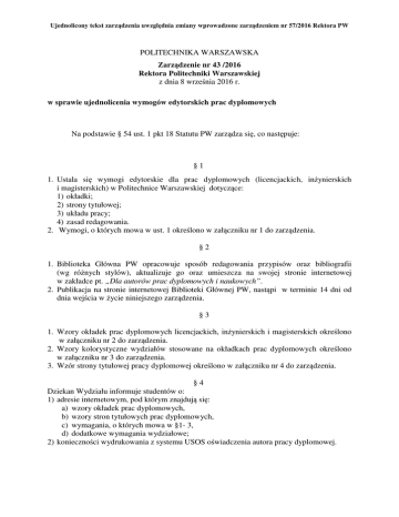 Zarządzenie Rektora Politechniki Warszawskiej nr 43/2016 z dnia
