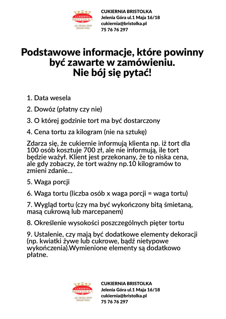 CUKIERNIA BRISTOLKA Jelenia Góra ul.1 Maja 16/18 [email protected] 75 76 76 297 Podstawowe informacje, które powinny być zawarte w zamówieniu. Nie bój się pytać! 1. Data wesela 2. Dowóz (płatny czy nie) 3. O której godzinie tort ma być dostarczony 4. Cena tortu za kilogram (nie na sztukę) Zdarza się, że cukiernie informują klienta np. iż tort dla 100 osób kosztuje 700 zł, ale nie informują, ile tort będzie ważył. Klient jest przekonany, że to niska cena, ale gdy zobaczy, że tort ważny np.10 kilogramów to zmieni zdanie... 5. Waga porcji 6. Waga tortu (liczba osób x waga porcji = waga tortu) 7. Wygląd tortu (czy ma być wykończony bitą śmietaną, masą cukrową lub marcepanem) 8. Określenie wysokości poszczególnych pięter tortu 9. Ustalenie, czy mają być dodatkowe elementy dekoracji (np. kwiatki żywe lub cukrowe, bądź nietypowe wykończenia).Wymienione elementy są dodatkowo płatne. CUKIERNIA BRISTOLKA Jelenia Góra ul.1 Maja 16/18 [email protected] 75 76 76 297