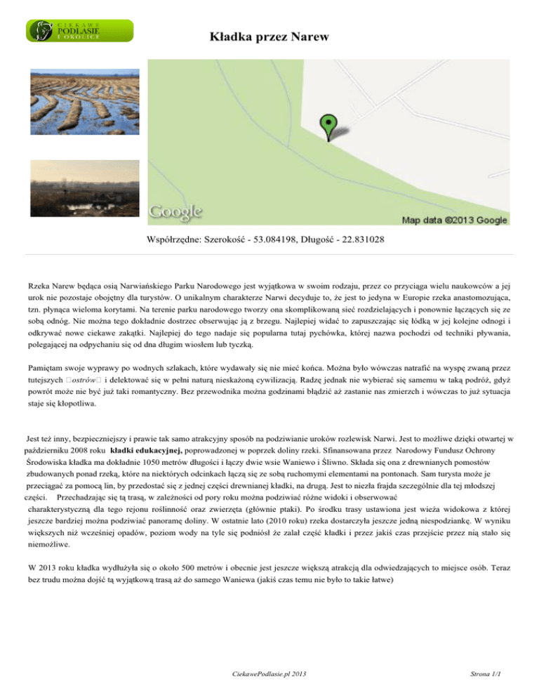 Kładka przez Narew Współrzędne: Szerokość - 53.084198, Długość - 22.831028 Rzeka Narew będąca osią Narwiańskiego Parku Narodowego jest wyjątkowa w swoim rodzaju, przez co przyciąga wielu naukowców a jej urok nie pozostaje obojętny dla turystów. O unikalnym charakterze Narwi decyduje to, że jest to jedyna w Europie rzeka anastomozująca, tzn. płynąca wieloma korytami. Na terenie parku narodowego tworzy ona skomplikowaną sieć rozdzielających i ponownie łączących się ze sobą odnóg. Nie można tego dokładnie dostrzec obserwując ją z brzegu. Najlepiej widać to zapuszczając się łódką w jej kolejne odnogi i odkrywać nowe ciekawe zakątki. Najlepiej do tego nadaje się popularna tutaj pychówka, której nazwa pochodzi od techniki pływania, polegającej na odpychaniu się od dna długim wiosłem lub tyczką. Pamiętam swoje wyprawy po wodnych szlakach, które wydawały się nie mieć końca. Można było wówczas natrafić na wyspę zwaną przez tutejszych ostrów i delektować się w pełni naturą nieskażoną cywilizacją. Radzę jednak nie wybierać się samemu w taką podróż, gdyż powrót może nie być już taki romantyczny. Bez przewodnika można godzinami błądzić aż zastanie nas zmierzch i wówczas to już sytuacja staje się kłopotliwa. Jest też inny, bezpieczniejszy i prawie tak samo atrakcyjny sposób na podziwianie uroków rozlewisk Narwi. Jest to możliwe dzięki otwartej w październiku 2008 roku kładki edukacyjnej, poprowadzonej w poprzek doliny rzeki. Sfinansowana przez Narodowy Fundusz Ochrony Środowiska kładka ma dokładnie 1050 metrów długości i łączy dwie wsie Waniewo i Śliwno. Składa się ona z drewnianych pomostów zbudowanych ponad rzeką, które na niektórych odcinkach łączą się ze sobą ruchomymi elementami na pontonach. Sam turysta może je przeciągać za pomocą lin, by przedostać się z jednej części drewnianej kładki, na drugą. Jest to niezła frajda szczególnie dla tej młodszej części. Przechadzając się tą trasą, w zależności od pory roku można podziwiać różne widoki i obserwować charakterystyczną dla tego rejonu roślinność oraz zwierzęta (głównie ptaki). Po środku trasy ustawiona jest wieża widokowa z której jeszcze bardziej można podziwiać panoramę doliny. W ostatnie lato (2010 roku) rzeka dostarczyła jeszcze jedną niespodziankę. W wyniku większych niż wcześniej opadów, poziom wody na tyle się podniósł że zalał część kładki i przez jakiś czas przejście przez nią stało się niemożliwe. W 2013 roku kładka wydłużyła się o około 500 metrów i obecnie jest jeszcze większą atrakcją dla odwiedzających to miejsce osób. Teraz bez trudu można dojść tą wyjątkową trasą aż do samego Waniewa (jakiś czas temu nie było to takie łatwe) CiekawePodlasie.pl 2013 Strona 1/1