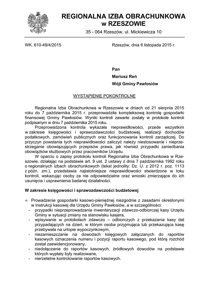 REGIONALNA IZBA OBRACHUNKOWA w RZESZOWIE 35 - 064 Rzeszów, ul. Mickiewicza 10 WK. 610-49/4/2015 Rzeszów, dnia 6 listopada 2015 r. Pan Mariusz Reń Wójt Gminy Pawłosiów WYSTĄPIENIE POKONTROLNE Regionalna Izba Obrachunkowa w Rzeszowie w dniach od 21 sierpnia 2015 roku do 7 października 2015 r. przeprowadziła kompleksową kontrolę gospodarki finansowej Gminy Pawłosiów. Wyniki kontroli zawarte zostały w protokole kontroli podpisanym w dniu 7 października 2015 roku. Przeprowadzona kontrola wykazała nieprawidłowości, przede wszystkim w zakresie księgowości i sprawozdawczości budżetowej, realizacji dochodów podatkowych, zamówień publicznych oraz funkcjonowania kontroli zarządczej. Do przyczyn powstania tych nieprawidłowości zaliczyć należy niestosowanie i nieprzestrzeganie obowiązujących przepisów prawa, jak również przypadki zaniedbania obowiązków służbowych przez pracowników Urzędu. W oparciu o zapisy protokołu kontroli Regionalna Izba Obrachunkowa w Rzeszowie, działając na podstawie art. 9 ust. 2 ustawy z dnia 7 października 1992 roku o regionalnych izbach obrachunkowych (tekst jednolity: Dz. U. z 2012 r. poz. 1113 z późn. zm.), przedstawia najistotniejsze nieprawidłowości stwierdzone w toku kontroli, wskazując osoby za nie odpowiedzialne oraz wnioski zmierzające do ich usunięcia i usprawnienia badanej działalności. W zakresie księgowości i sprawozdawczości budżetowej • - - - Prowadzenie gospodarki kasowo-pieniężnej niezgodnie z zasadami określonymi w Instrukcji kasowej dla Urzędu Gminy Pawłosiów, a w szczególności: przypadki nieprzeprowadzania inwentaryzacji zdawczo-odbiorczej kasy Urzędu Gminy w sytuacji zmiany na stanowisku kasjera, wpisywanie w protokołach zdawczo – odbiorczych z przekazania kasy dat przypadających na dzień, w którym osoba przyjmująca lub przekazująca kasę przebywała na urlopie wypoczynkowym, niezamieszczanie na dowodach księgowych załączanych do raportów kasowych oznaczenia numeru i pozycji raportu kasowego, pod którą rozchód został zaewidencjonowany, niedołączanie do raportów kasowych, źródłowych dowodów na podstawie których wypłaty były realizowane, nierzetelne kontrolowanie raportów kasowych. 2 Odpowiedzialność za nieprawidłowe sporządzanie raportów kasowych ponosi Kasjer Urzędu Gminy Pawłosiów natomiast za nierzetelne kontrolowanie tych raportów Inspektor ds. obsługi finansowo-księgowej i kasowej Urzędu Gminy Pawłosiów. Wniosek nr 1. Wyeliminować należy nieprawidłowości w gospodarce kasowopieniężnej Urzędu, poprzez prowadzenie jej zgodnie z przepisami zarządzenia Nr 43/2013 Wójta Gminy Pawłosiów z dnia 5 kwietnia 2013 r. w sprawie wprowadzenia Instrukcji gospodarki kasowej dla Urzędu Gminy Pawłosiów, a w szczególności: a) inwentaryzację kasy Urzędu Gminy Pawłosiów w sytuacji zmiany kasjera, przeprowadzać zgodnie z § 2 Instrukcji, protokoły z przekazania kasy sporządzać należy w dniu przekazania kasy w obecności osób przekazujących i przyjmujących, b) na dowodach kasowych załączanych do raportu kasowego zamieszczać numer i pozycję raportu kasowego, pod którą dany rozchód został zaewidencjonowany, zgodnie z § 4 „Instrukcji”, c) ewidencję dowodów źródłowych, będących podstawą wypłat w raportach kasowych, prowadzić zgodnie z § 4 ust 4 pkt. „c” „Instrukcji”, d) kontrolę raportów kasowych przeprowadzać rzetelnie i kompleksowo, zgodnie z § 4 ust 4 pkt. „b” „Instrukcji”. Niewpisywanie w ewidencji druków ścisłego zarachowania, danych osobowych pracowników pobierających czeki gotówkowe. Odpowiedzialność za nieprawidłowość ponosi Kasjer Urzędu Gminy Pawłosiów. Wniosek nr 2. Księgę druków ścisłego zarachowania należy prowadzić zgodnie z „Instrukcją ewidencji i kontroli druków ścisłego zarachowania w Urzędzie Gminy Pawłosiów” wprowadzoną zarządzeniem Nr 44/2013 Wójta Gminy Pawłosiów z dnia 5 kwietnia 2013 r. szczególnie poprzez wpisywanie danych osobowych pracowników pobierających druki. • Nieprzeprowadzanie inwentaryzacji druków ścisłego zarachowania w latach 2013 – 2014 metodą spisu z natury, określaną w zarządzeniach Wójta Gminy Pawłosiów w sprawie przeprowadzenia inwentaryzacji rocznych w wym. latach. Odpowiedzialność za nieprawidłowość ponosi Przewodniczący Komisji Inwentaryzacyjnej. Wniosek nr 3. Inwentaryzację druków ścisłego zarachowania przeprowadzać metodą spisu z natury, zgodnie z § 3 ust. 3 załącznika Nr 1 do „Instrukcji inwentaryzacyjnej” wprowadzonej zarządzeniem Nr 89/2011 Wójta Gminy Pawłosiów z dnia 24 października 2011 roku. W sprawozdaniu jednostkowym Urzędu Gminy Pawłosiów, tj. kwartalnym Rb-Z wg stanu na koniec IV kwartału 2013 r., zawyżenie kwoty zobowiązań wymagalnych (ogółem) oraz kwoty zobowiązań wymagalnych z tytułu dostaw towarów i usług o 45,99 zł. Odpowiedzialność za nieprawidłowości ponosi Skarbnik Gminy Pawłosiów Pani Józefa Kalwara. 3 Wniosek nr 4. Zobowiązania wymagalne, rozumiane jako wszystkie bezsporne zobowiązania, których termin płatności dla dłużnika minął a nie zostały przedawnione bądź umorzone, wynikające głównie z dostaw towarów i usług (np. niezapłaconych w terminie faktur), prawomocnych orzeczeń sądu, udzielonych poręczeń i gwarancji, wykazywać należy w kwotach wynikających z ewidencji księgowej, zgodnie z załącznikiem Nr 9 „Instrukcja sporządzania sprawozdań” do rozporządzenia Ministra Finansów z dnia 4 marca 2010 r. w sprawie sprawozdań jednostek sektora finansów publicznych w zakresie operacji finansowych (t. j.: Dz. U. z 2014 r. poz. 1773). • Prowadzenie w 2013 i 2014 roku konta analitycznego 201/291 dla kontrahenta „Generalna Dyrekcja Dróg Krajowych i Autostrad”, bez zachowania ciągłości bilansowej i zamykanie tego konta na koniec danego roku „per saldo”. Odpowiedzialność za nieprawidłowość pono