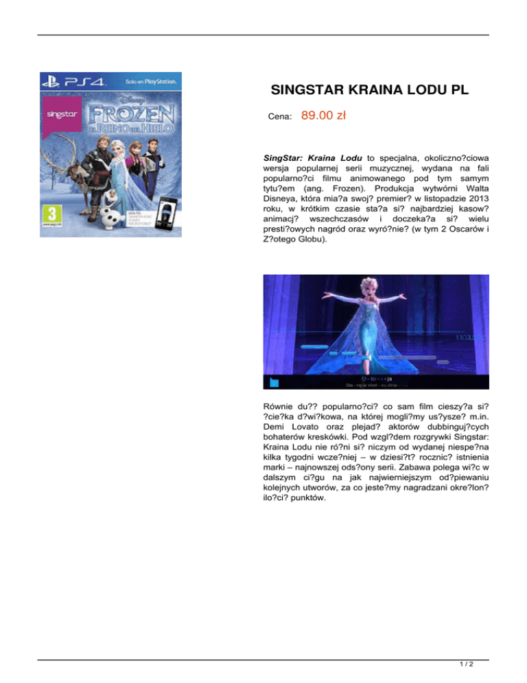 SINGSTAR KRAINA LODU PL Cena: 89.00 zł SingStar: Kraina Lodu to specjalna, okoliczno?ciowa wersja popularnej serii muzycznej, wydana na fali popularno?ci filmu animowanego pod tym samym tytu?em (ang. Frozen). Produkcja wytwórni Walta Disneya, która mia?a swoj? premier? w listopadzie 2013 roku, w krótkim czasie sta?a si? najbardziej kasow? animacj? wszechczasów i doczeka?a si? wielu presti?owych nagród oraz wyró?nie? (w tym 2 Oscarów i Z?otego Globu). Równie du?? popularno?ci? co sam film cieszy?a si? ?cie?ka d?wi?kowa, na której mogli?my us?ysze? m.in. Demi Lovato oraz plejad? aktorów dubbinguj?cych bohaterów kreskówki. Pod wzgl?dem rozgrywki Singstar: Kraina Lodu nie ró?ni si? niczym od wydanej niespe?na kilka tygodni wcze?niej – w dziesi?t? rocznic? istnienia marki – najnowszej ods?ony serii. Zabawa polega wi?c w dalszym ci?gu na jak najwierniejszym od?piewaniu kolejnych utworów, za co jeste?my nagradzani okre?lon? ilo?ci? punktów. 1/2 W porównaniu z poprzednimi cz??ciami cyklu, w grze wprowadzono ca?? mas? usprawnie? takich jak punkty do?wiadczenia i specjalne nagrody za wykonywanie dodatkowych zada?, co dodatkowo urozmaici?o zabaw?. Zgodnie z najnowszymi trendami w grze nie zabrak?o opcji spo?eczno?ciowych, pozwalaj?cych na dzielenie si? zapisanymi fragmentami rozgrywki ze znajomymi z Facebooka i Twittera. Zobacz wideo: Szczegóły wersja językowa POLSKA 2/2 Powered by TCPDF (www.tcpdf.org)