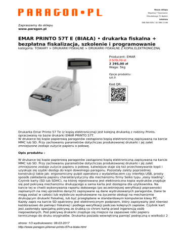 Nasze sklepy Wspólna 7 Sosnowiec Piłsudskiego 71 Będzin Infolinia 508-500-500 / 32 266-11-66 Zapraszamy do sklepu www.paragon.pl EMAR PRINTO 57T E (BIAŁA) • drukarka fiskalna + bezpłatna fiskalizacja, szkolenie i programowanie kategoria: TOWARY > DRUKARKI FISKALNE > DRUKARKI FISKALNE Z KOPIĄ ELEKTRONICZNĄ Producent: EMAR 2 570,70 zł 2 295,00 zł Waga: 5kg Opcje produktu: szt.0 Kod QR: Drukarka Emar Printo 57 Te (z kopią elektroniczną) jest kolejną drukarką z rodziny Printo, opracowaną na bazie drukarki EMAR PRINTO 57T. W drukarce tej kopie papierową paragonów zastąpiono kopią elektroniczną zapisywaną na karcie MMC lub SD. Przy zachowaniu parametrów dotychczas produkowanej drukarki i jej zalet zmniejszone zostaje zużycie papieru o połowę. Opis produktu : W drukarce tej kopie papierową paragonów zastąpiono kopią elektroniczną zapisywaną na karcie MMC lub SD. Przy zachowaniu parametrów dotychczas produkowanej drukarki i jej zalet zmniejszone zostaje zużycie papieru o połowę. Łatwiejsze staje się też przechowywanie kopii i uzyskuje się szybki dostęp do kopii dowolnego paragonu. Pozostały zalety poprzedniej konstrukcji takie jak: ergonomiczny pulpit operatora z wyświetlaczem czy interfejs USB, prosty sposób zakładania papieru charakterystyczny dla mechanizmu firmy Seiko typu „easy loading". Czytnik karty (SD lub SDHC), na której rejestrowana jest elektroniczna kopia wydruków znajduje się pod pokrywą mechanizmu drukującego a sama karta jest dostępna dla użytkownika. Na karcie tej w chwili wykonywania raportu dobowego (po wcześniejszej weryfikacji poprawności zapisanych na niej uprzednio danych) zapisywane są dane wydrukowanych paragonów. Dane te mogą zostać w całości lub wybiórczo wydrukowane na życzenie obsługi na mechanizmie drukującym drukarki fiskalnej, lub być przeglądane w standardowym komputerze klasy PC. Każdy zapis na karcie SD opatrzony jest elektronicznym podpisem, który zapisywany jest również każdorazowo do pamięci fiskalnej i podlega weryfikacji podczas kolejnych zapisów. Czytnik kart jest zasłonięty specjalną pokrywą ze śrubką co chroni kartę przed ingerencją osób niepowołanych. Pod pokrywą drukarki znajduje się miejsce na zapasowe rolki papieru termicznego do druku oryginałów. Drukarka posiada wewnętrzną pamięć podręczną o wielkości 2 strona: 1/3 wydrukowano: 08-03-2017 http://www.paragon.pl/emar-printo-57t-e-biala.html MB co pozwala na zapis ok. 1750 paragonów o ilości 36 linii wydruku w przypadku, gdy karta SD zapełni się, uszkodzi lub zostanie wyjęta. Pozwala to na ciągłość pracy przez 2 dni. Drukarka EMAR PRINTO 57Te posiada możliwość zaprogramowania waluty podstawowej wraz z drukowaniem przelicznika walut bezpośrednio poza paragonem. Do komunikacji z komputerem poprzez złącze RS232 lub USB drukarka wykorzystuje protokół komunikacyjny zgodny z protokołem stosowanym w drukarkach DF-300, DF-301, Thermal. Drukarka fiskalna razem z komputerem tworzy otwarty komputerowy system fiskalny, który może być dowolnie konfigurowany według potrzeb użytkownika. Dzięki swojej elastyczności taki system znajduje zastosowanie w hurtowniach, hotelach, stacjach paliw, dużych marketach i małych punktach sprzedaży detalicznej. Drukarka posiada czytelny i ergonomiczny pulpit operatora oraz dwa podświetlane wyświetlacze dla operatora oraz dla klienta. Istnieje również możliwość podłączenia do drukarki szuflady na pieniądze. W przypadku awarii zasilania zewnętrznego drukarka posiada awaryjne zasilanie akumulatorowe, z funkcją oszczędzania akumulatorów. Dzięki dużej bazie towarowej (100 000 PLU) oraz funkcjom przypominania o obowiązkowym przeglądzie okresowym, rozliczania płatności w walutach, wydruku kodu kreskowego jako numer systemowy paragonu, wydruku potwierdzenia doładowania GSM drukarka EMAR PRINTO 57Te staje się naprawdę przyjazna użytkownikowi. Dane techniczne : Współpraca z komputerem: USB lub RS232 - złącze RJ45 Współpraca z programami sprzedaży: Protokół komunikacyjny zgodny z protokołem: 1. POSNET THERMAL 2.00 2. DUO PRO,TORELL DUO PRO 3.TORELL DUO-PLUS 4.EMAR DUO stawki VAT: 7 stawek podatkowych VAT kontrola stawek dla 100 000 towarów Zasilanie podstawowe: zewnętrzny zasilacz sieciowy: napięcie wejściowe: 100 ÷ 240 V AC / 1,6 A napięcie wyjściowe: 12 V DC / 5,42 A Zasilanie awaryjne: bateria akumulatorów typu Ni-MH 7,2 V; 2,5 Ah Mechanizmy drukujące: mechanizm termiczny typu LTPC 245, firmy Seiko szybkość druku: max. 65 mm/sek Papier termiczny: szerokość: 57 mm, długość: 30 m,42 znaki w linii Polskie znaki: MAZOVIA, ISOLATIN, LATIN, WINDOWS Wyświetlacze: klienta: alfanumeryczny typu LCD 2 x 16 znaków podświetlenie białe operatora : alfanumeryczny typu LCD 2 x 16 znaków podświetlenie białe, zielone Współpraca z dodatkowym wyświetlaczem: podłączenie poprzez komputer Współpraca z szufladą: zasilanie: DC 12 ÷ 24 V programowana szerokość impulsu: od 100 ÷ 250 ms - złącze RJ12 Temperatura pracy: 0° C ÷ 50° C Wymiary: 304 x 194 x 254 mm Waga: 2,7 kg. strona: 2/3 wydrukowano: 08-03-2017 http://www.paragon.pl/emar-printo-57t-e-biala.html Wielkość pamięci podręcznej: 2 MB Możliwość zapisu około 1750 paragonów o ilości linii wydruku 36 Rodzaj nośnika kopii elektronicznej: Karta SD lub SDHC Możliwość tworzenia kopii bezpieczeństwa zawartości karty pamięci SD lub SDHC: Kopia jest tworzona automatycznie na bieżąco poprzez zrzucanie danych jednym z portów COM lub USB na komputer z drugą kartą SD lub SDHC Szybkość sprawdzania poprawności danych na karcie pamięci: Około 272 KB/s Więcej o produkcie Strona producenta strona: 3/3 wydrukowano: 08-03-2017 http://www.paragon.pl/emar-printo-57t-e-biala.html