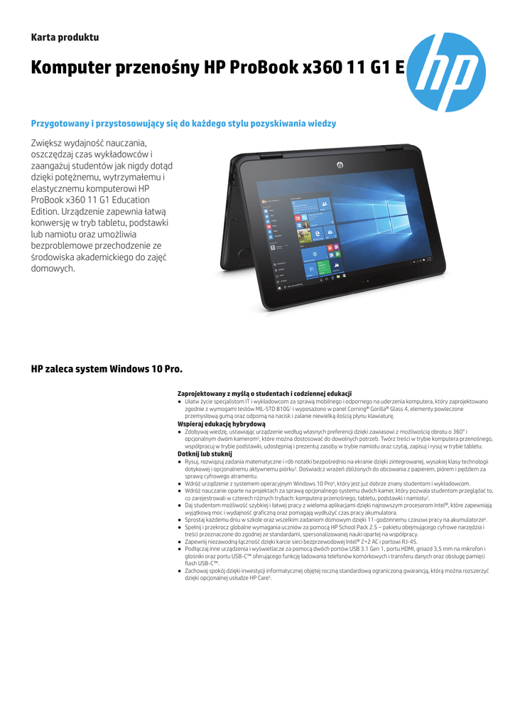 Karta produktu Komputer przenośny HP ProBook x360 11 G1 EE Przygotowany i przystosowujący się do każdego stylu pozyskiwania wiedzy Zwiększ wydajność nauczania, oszczędzaj czas wykładowców i zaangażuj studentów jak nigdy dotąd dzięki potężnemu, wytrzymałemu i elastycznemu komputerowi HP ProBook x360 11 G1 Education Edition. Urządzenie zapewnia łatwą konwersję w tryb tabletu, podstawki lub namiotu oraz umożliwia bezproblemowe przechodzenie ze środowiska akademickiego do zajęć domowych. HP zaleca system Windows 10 Pro. Zaprojektowany z myślą o studentach i codziennej edukacji ● Ułatw życie specjalistom IT i wykładowcom za sprawą mobilnego i odpornego na uderzenia komputera, który zaprojektowano zgodnie z wymogami testów MIL-STD 810G1 i wyposażono w panel Corning® Gorilla® Glass 4, elementy powleczone przemysłową gumą oraz odporną na nacisk i zalanie niewielką ilością płynu klawiaturę. Wspieraj edukację hybrydową ● Zdobywaj wiedzę, ustawiając urządzenie według własnych preferencji dzięki zawiasowi z możliwością obrotu o 360° i opcjonalnym dwóm kamerom2, które można dostosować do dowolnych potrzeb. Twórz treści w trybie komputera przenośnego, współpracuj w trybie podstawki, udostępniaj i prezentuj zasoby w trybie namiotu oraz czytaj, zapisuj i rysuj w trybie tabletu. Dotknij lub stuknij ● Rysuj, rozwiązuj zadania matematyczne i rób notatki bezpośrednio na ekranie dzięki zintegrowanej, wysokiej klasy technologii dotykowej i opcjonalnemu aktywnemu piórku3. Doświadcz wrażeń zbliżonych do obcowania z papierem, piórem i pędzlem za sprawą cyfrowego atramentu. ● Wdróż urządzenie z systemem operacyjnym Windows 10 Pro4, który jest już dobrze znany studentom i wykładowcom. ● Wdróż nauczanie oparte na projektach za sprawą opcjonalnego systemu dwóch kamer, który pozwala studentom przeglądać to, co zarejestrowali w czterech różnych trybach: komputera przenośnego, tabletu, podstawki i namiotu2. ● Daj studentom możliwość szybkiej i łatwej pracy z wieloma aplikacjami dzięki najnowszym procesorom Intel®, które zapewniają wyjątkową moc i wydajność graficzną oraz pomagają wydłużyć czas pracy akumulatora. ● Sprostaj każdemu dniu w szkole oraz wszelkim zadaniom domowym dzięki 11-godzinnemu czasowi pracy na akumulatorze6. ● Spełnij i przekrocz globalne wymagania uczniów za pomocą HP School Pack 2.5 – pakietu obejmującego cyfrowe narzędzia i treści przeznaczone do zgodnej ze standardami, spersonalizowanej nauki opartej na współpracy. ● Zapewnij niezawodną łączność dzięki karcie sieci bezprzewodowej Intel® 2×2 AC i portowi RJ-45. ● Podłączaj inne urządzenia i wyświetlacze za pomocą dwóch portów USB 3.1 Gen 1, portu HDMI, gniazd 3,5 mm na mikrofon i głośniki oraz portu USB-C™ oferującego funkcję ładowania telefonów komórkowych i transferu danych oraz obsługę pamięci flash USB-C™. ● Zachowaj spokój dzięki inwestycji informatycznej objętej roczną standardową ograniczoną gwarancją, którą można rozszerzyć dzięki opcjonalnej usłudze HP Care5. Karta produktu Komputer przenośny HP ProBook x360 11 G1 EE Tabela specyfikacji HP zaleca system Windows 10 Pro. Dostępny system operacyjny Windows 10 Pro 64 – firma HP zaleca system Windows 10 Pro.1 Windows 10 Home 641 Windows 10 Pro (licencja National Academic)22 Rodzaj procesora Procesor Intel® Celeron®; Procesor Intel® Pentium® Dostępne procesory2 Procesor Intel® Celeron® N3350 z kartą graficzną Intel HD Graphics 500 (1,1 GHz, maks. 2,4 GHz, 2 MB pamięci podręcznej, 2 rdzenie); Procesor Intel® Pentium® N4200 z kartą graficzną Intel HD Graphics 505 (1,1 GHz, maks. 2,5 GHz, 2 MB pamięci podręcznej, 4 rdzenie) Zestaw układów Układ zintegrowany z procesorem Maksymalna wielkość pamięci Maksymalnie 8 GB pamięci DDR3L-1600 SDRAM Informacje o standardowej pamięci: Szybkość transmisji do 1600 mln transferów/s Wewnętrzna pamięć masowa 128 GB Maksymalnie 256 GB M.2 SSD3,4 Maksymalnie 64 GB Napęd SSD eMMC3,5 Wyświetlacz Cienki ekran HD SVA eDP o przekątnej 29,46 cm (11,6″), z podświetleniem LED i powłoką antyrefleksyjną (1366 × 768); Cienki ekran dotykowy HD SVA eDP o przekątnej 29,46 cm (11,6″), z podświetleniem LED (1366 × 768)6,11 Dostępna karta graficzna Zintegrowana: Intel® HD Graphics 500; Intel® HD Graphics 5056 Technologie bezprzewodowe 2-zakresowa karta sieci bezprzewodowej Intel® Wireless-AC 7265 802.11a/b/g/n/ac (2 × 2) WiFi z modułem Bluetooth® 4.28 Komunikacja Kontroler Realtek RTL8111HSH Gigabit Ethernet Gniazda rozszerzeń 1 karta pamięci microSD7 (Obsługa kart micro SD, SDHC, SDXC) Porty i złącza 2 porty USB 3.1 Gen 1; 1 port USB 3.1 Type-C™; 1 port HDMI 1.4b; 1 złącze zasilania pr. zm.; 1 port RJ-45; 1 gniazdo combo (słuchawki/mikrofon)10 Urządzenie wejściowe Pełnowymiarowa, odporna na zalanie i nacisk Płytka dotykowa Clickpad z obsługą wielopunktowych gestów Kamera internetowa Kamera 720p skierowana w stronę użytkownika; Dodatkowa kamera 1080p skierowana na zewnątrz (w wybranych modelach)6,9 Dostępne oprogramowanie Należy zakupić pakiet Office; Sterownik HP ePrint + JetAdvantage; Obsługa standardu HP Hotkey; HP JumpStart; HP Support Assistant; HP Noise Cancellation; Wyszukiwarka Bing; Skype; Pakiet HP School Pack (obejmuje aplikacje HP Classroom Manager, HP Adaptive Learning firmy Fishtree, Corinth Classroom, HP Simple Sign-on firmy Classlink i inne)12,13,18 Zarządzanie bezpieczeństwem Moduł TPM 2.0; Gniazdo blokady zabezpieczającej16,17 Zasilanie Zasilacz pr. zm. 45 W Smart; Zasilacz pr. zm. 65 W EM Smart 3-ogniwowy akumulator litowo-jonowy HP Long Life, 41 Wh Do 11 godzin20 (Wbudowany akumulator nie może być wymieniany przez użytkownika. Podlega on serwisowi na podstawie gwarancji.) Wymiary 20,79 × 30,24 × 1,99 cm Waga Od 1,35 kg (ekran niedotykowy); Od 1,45 kg (ekran dotykowy) (Waga zależy od konfig