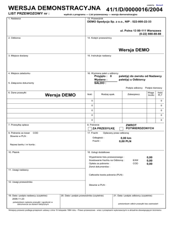 created by Maciosoft WERSJA DEMONSTRACYJNA 41/1/D/0000016/2004 LIST PRZEWOZOWY nr : wydruk z programu --- List przewozowy --- wersja demonstracyjna 1. Nadawca 13. Przewoźnik DEMO Spedycja Sp. z o.o., NIP : 522-000-22-33 ul. Polna 13 00-111 Warszawa (0-22) 888-88-88 2. Odbiorca 14. Kolejni przewoźnicy Wersja DEMO 3. Miejsce dostawy 15. Instrukcje nadawcy 4. Miejsce zaladunku 16. Wymiana palet u odbiorcy Przyjęto : 0 Wydano : SALDO : 5. Załączone dokumenty palet(ę) do zwrotu od Nadawcy palet(ę) u Odbiorcy Podpis odbiorcy 6. Dane przesyłki Wersja DEMO 7. Przesyłkę opłaca Ilość Rodzaj opak. Zabezpiecz. Ilość PLT 0 0 0 0 0 0 0 0 0 8. Pobranie COD Waga brutto 0 ZWROT POTWIERDZONYCH ZA PRZESYŁKĘ 9. Pobranie za towar Słownie w PLN : Podpis kierowcy 17. Fracht Opłacany przez odbiorcę Odległość : Fracht : 0,00 km 0,00 PLN Nazwa banku i nr konta : 10. Płatnik 18. Usługi dodatkowe Wypelnienie Odległość : listu przewozowego : Scedowanie frachtu na Odbiorcę : Opłata za pobranie : Zwrot dokumentów : EXW COD 0,00 0,00 0,00 11. Uwagi nadawcy Całkowita kwota pobrania (PLN) : 12. Uwagi przewoźnika Słownie w PLN : 19. Data i podpis nadawcy (czytelnie) 2006-11-23 potwierdzam nadanie przesyłki i zgodność w dokumencie ze stanem faktycznym 20. Data i podpis przewoźnika (czytelnie) 21. Data i podpis odbiorcy (czytelnie) potwierdzam odbiór przesyłki bez zastrzeŜeń Niniejszy przewóz podlega przepisom ustawy z dnia 15 listopada 1984 roku - Prawo przewozowe - wraz z przepisami wykonawczymi w aktualnie obowiązującym brzmieniu