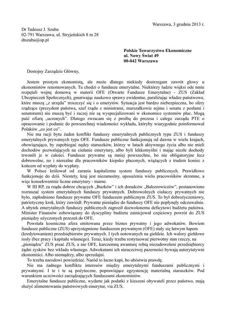 Warszawa, 3 grudnia 2013 r. Dr Tadeusz J. Szuba 02-791 Warszawa, ul. Stryjeńskich 8 m 28 [email protected] Polskie Towarzystwo Ekonomiczne ul. Nowy Świat 49 00-042 Warszawa Dostojny Zarządzie Główny, Jestem prostym ekonomistą, ale może dlatego niekiedy dostrzegam zawrót głowy u ekonomistów renomowanych. Tu chodzi o fundusze emerytalne. Niektórzy ludzie więksi ode mnie rozpętali wojnę domową w materii OFE (Otwarte Fundusze Emerytalne) - ZUS (Zakład Ubezpieczeń Społecznych), gmatwając naukowo sprawy ewidentne, paraliżując władze państwowe, które muszą „z urzędu” troszczyć się i o emerytów. Sytuacja jest bardzo niebezpieczna, bo sfery rządzące (prezydent państwa, szef rządu z ministrami, marszałkowie sejmu i senatu z posłami i senatorami) nie muszą być i raczej nie są wyspecjalizowani w ekonomice systemów płac. Mogą paść ofiarą „uczonych”. Dlatego zwracam się z prośbą do prezesa i całego zarządu PTE o opracowanie i podanie do powszechnej wiadomości wykładu, któryby wiarygodnie poinformował Polaków „co jest co”. Nie ma racji bytu żaden konflikt funduszy emerytalnych publicznych typu ZUS i funduszy emerytalnych prywatnych typu OFE. Fundusze publiczne funkcjonują od dawna w wielu krajach, obowiązująco, by zapobiegać nędzy staruszków, którzy w latach aktywnego życia albo nie mieli dochodów pozwalających na ciułanie emerytury, albo byli lekkomyślni i mając niezłe dochody trwonili je w całości. Fundusze prywatne są mniej powszechne, bo nie obligatoryjne lecz dobrowolne, no i nierealne dla pracowników kiepsko płaconych, wiążących z trudem koniec z końcem od wypłaty do wypłaty. W Polsce królował od zarania kapitalizmu system funduszy publicznych. Prawidłowo funkcjonuje do dziś. Niestety, kraj jest niezamożny, uposażenia wielu pracowników skromne, a więc konsekwentnie liczne emerytury - marne. W III RP, za rządu dobrze chcących „Buzków” i ich doradców „Balcerowiczów”, postanowiono rozruszać system emerytalnych funduszy prywatnych. Dobrowolnych ciułaczy prywatnych nie było, zapłodniono fundusze prywatne OFE funduszem publicznym ZUS. To był dobrożyczeniowy, patriotyczny krok, który zawiódł. Prywatne pieniądze do funduszy OFE nie popłynęły odczuwalnie. A ubytek emerytalnych funduszy publicznych zagroził dozwolonemu deficytowi budżetu państwa. Minister Finansów zobowiązany do dyscypliny budżetu zainicjował częściowy powrót do ZUS pieniędzy użyczonych przezeń do OFE. Powstała kosmiczna afera emitowana przez biznes prywatny i jego adwokatów. Bowiem fundusze publiczne (ZUS) uprzystępnione funduszom prywatnym (OFE) stały się łatwym łupem (kredytowaniem) przedsiębiorstw prywatnych. I tych notowanych na giełdzie. Ich walory giełdowe rosły (bez pracy i kapitału własnego). Teraz, kiedy trzeba restytuować pierwotny stan rzeczy, na „pieniądzu” ZUS pisać ZUS, a nie OFE, karczemną awanturę robią niezadowoleni przedsiębiorcy żądni zysków bez wkładu własnego. Adwokatami ich nieuczciwej pazerności bywają autorytatywni ekonomiści. Albo niemądrzy, albo sprzedajni. To trzeba narodowi powiedzieć. Naród to łacno kupi, bo ubóstwia prawdę. Nie ma żadnego konfliktu interesów między emerytalnymi funduszami publicznymi i prywatnymi. I te i te są pożyteczne, poprawiające egzystencję materialną staruszków. Pod warunkiem uczciwości zarządzających funduszami ekonomistów. Emerytalne fundusze publiczne, wydarte jak podatki z kieszeni obywateli przez państwo, mają służyć alimentowaniu państwowych emerytur, via ZUS. Emerytalne fundusze prywatne, zebrane dobrowolnie przez obywateli dla ich dostatniejszej starości, mają służyć tymże obywatelom w formie prywatnych emerytur, via OFE. I OFE i ZUS niech służą swym podopiecznym emerytom. Ale swoimi funduszami. Pozwolenie funduszom OFE na kupieckie, prywatne gospodarowanie publicznym kapitałem ZUS'u, uprzystępnionym bezpłatnie, jest ekonomicznym paradoksem niewyobrażalnym w krajach ekonomicznie cywilizowanych typu USA, RFN et cetera. ZUS nie tylko nie otrzymuje od OFE procentów od przekazanego im kapitału, ale naraża na straty skarb państwa, który musi płacić procenty za finansowanie deficytu budżetowego. Kpina ze zdrowego rozsądku. Na zakończenie warto naświetlić ułudę, rojenie, miłośników przeniesienia funduszy publicznych z ZUS do OFE i przekształcenia ich w fundusze prywatne, na temat rzekomych z tego korzyści. Oni głoszą prawdę, że procesy demograficzne są smętne, maleje liczba urodzeń, młodzieży, pracowników, rośnie liczba emerytów, średnia emerytura na głowę będzie musiała maleć. Klęska zwłaszcza dla osób z niskimi emeryturami. Miłośnicy zdegenerowanych OFE, opartych nie na kapitale swych emerytów, a ZUS'u, jednocześnie łżą, że OFE będą dla nich zbawienne, że ich uratują przed tą klęską. W niezamożnej Polsce ratunkiem może być emerytalny system funduszy publicznych typu ZUS i mądry rząd wspierany przez światły sejm. Stopa ustawowych obciążeń uposażeń na emerytalny fundusz publiczny nie musi być dogmatycznie stała. Można ją, np. co 10 lat, modyfikować tak, by emeryci zawsze byli zadbani. Ta troska będzie ułatwiana przez prawdopodobny wzrost dochodu narodowego, postęp naukowo-techniczny, rosnące uposażenia osób pracujących. Żadnym ratunkiem nie będzie mógł być emerytalny system funduszy prywatnych typu OFE, bo on istnieje na świecie, z USA na czele, wyłącznie dla ludzi niebiednych, zdolnych do kreowania swej emerytury własnymi pieniędzmi. Mamienie ludzi biednych rzekomym wsparciem ich emerytur funduszami OFE jest wręcz oszustwem. Z poważaniem, Dr farm. i mgr ekon. Tadeusz J. Szuba P.S. Proszę o odrobinę zaufania do mojej wiedzy polityczno-ekonomicznej, tej na styku państwo przedsiębiorstwo - obywatel, która była doceniana w różnych miejscach i czasach, zwłaszcza w gospodarce lekami : 