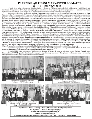IV PRZEGLĄD PIEŚNI MARYJNYCH I O MATCE WIELGOMŁYNY 2016 17 maja 2016 roku w Gminnym Ośrodku Kultury i Sportu w Wielgomłynach odbył się VI Przegląd Pieśni Maryjnych i o Matce - Wielgomłyny 2016. Tym razem przegląd podzielono na dwie części, w pierwszej wysłuchano i oceniono wszystkich wykonawców a w drugiej, która odbyła się 24 maja odbył się koncert laureatów oraz wręczono nagrody. Konkurs oceniało jury w składzie: Michał Chabrzyk - przewodniczący oraz członkowie: Damian Drogosz oraz Ewa Trzonkowska. Po wysłuchaniu 39 wykonawców, wśród których byli nie tylko soliści ale również zespoły i chóry jury postanowiło przyznać następujące nagrody i wyróżnienia: Najmłodszymi uczestnikami były dzieci z przedszkoli. W tej kategorii przyznano I miejsce dla Oddziału Przedszkolnego PSP z Wielgomłyn. W grupie wiekowej dzieci z klas I - III pierwsze miejsca zajęła Nikola Kardas, drugie miejsce zajął Mateusz Śliskowski, a trzecie Małgorzata Majcherek. Wśród zespołów: I miejsce PSP Wielgomłyny - opiekun p. B. Szymczyk, II miejsce PSP Wielgomłyny - opiekun p. M. Banaszczyk oraz PSP Wielgomłyny - opiekun p. U. Urbańska, III miejsce PSP w Zagórzu - opiekun p. A. Jeziorska. W grupie wiekowej dzieci z klas IV - VI wśród solistów pierwsze miejsce zajęła Barbara Moroń, drugie miejsce Anna Łyszczarek, trzecie miejsce Julia Piszczała oraz Magdalena Kierasińska. Jury przyznało wyróżnienie dla Dominiki Dawid oraz Wiktorii Śliskowskiej. Wśród zespołów pierwsze miejsce zajął zespół PSP Krzętów. W grupie wiekowej młodzieży gimnazjalnej przyznano następujące miejsca wśród solistów: I miejsce - Aleksandra Animucka, II miejsce - Natalia Stawiarska oraz Oliwia Sączyńska. Zespoły: I miejsce - Schola Dziecięca - Strzałków, II miejsce - PG w Kobielach. Młodzież ze szkół ponadgimnazjalnych oceniana była w kategorii soliści i zespoły. Wśród solistów I miejsce zdobyła Agata Paździerska , a wśród zespołów pierwsze miejsce zajął zespół ,, Boży Młyn'' - II LO w Radomsku. W kategorii dorosłych wyróżniono solistów, zespoły rodzinne, zespoły śpiewacze/ludowe i chóry. Wśród solistów pierwsze miejsce zdobyła Maria Borowik, drugie Mirosława Urbanik. W kategorii zespoły rodzinne przyznano pierwsze miejsce dla R. Kucała, D. Kucała, J. Podsadna - Wielgomłyny/Radomsko, drugie miejsce - T i Z. Nowak - Dziepółć. Wśród zespołów śpiewaczych/ludowych wyróżniono: I miejsce FZŚ ,, Klepisko” z Kłomnic, II miejsce SKK - Zespół ludowy ,, OD A Do Z” - Kietlin, III miejsce Zespół ,, Dziepółlanki”. W kategorii chóry pierwsze miejsce zdobył Chór ,, Bell Canto” z Dobryszyc, drugie miejsce Chór Klubu Seniora z Kobiel Wielkich, trzecie miejsce Chór ,, Złota nutka” z MDK Radomsko. Nagroda specjalna została przyznana dla Scholi Dziecięcej ze Strzałkowa za wykonanie pieśni o Matce Bolesnej. Najważniejszą i główną nagrodą każdego z Przeglądów Pieśni Maryjnych i o Matce jest GRAND PRIX. W 2016 roku nagrodę Grand Prix zdobył Folklorystyczny Zespół Śpiewaczy ,,Klepisko”. 24 maja 2016 roku wójt gminy Wielgomłyny Bogdan Witaszczyk wraz z sekretarz gminy Bożeną Nowak oraz kierownikiem GOPS Bogumiłą Smolarczyk wręczyli wszystkim nagrodzonym w Przeglądzie puchary, dyplomy i upominki, a następnie w klasztorze odbył się wspaniały koncert laureatów. Grupa wiekowa przedszkolaki I miejsce – PSP Wielgomłyny Grupa wiekowa młodzież gimnazjalna Nagroda specjalna Schola Dziecięca – Strzałków Kategoria zespoły śpiewacze / ludowe I miejsce – FZŚ ,, Klepisko” z Kłomnic Nagroda GRAND PRIX Kategoria Chóry I miejsce – Chór ,, Bell Canto” – Dobryszyce Wydawca: Rada Gminy i Urząd Gminy w Wielgomłynach ul. Rynek 1, 97-525 Wielgomłyny e-mail: [email protected] www.wielgomlyny.pl Redaktor Naczelny: Ewelina Gregorczyk, fot.: Ewelina Gregorczyk