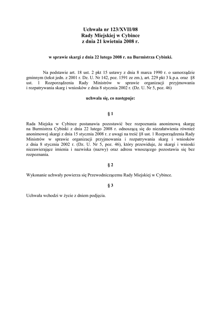 Uchwała nr 123/XVII/08 Rady Miejskiej w Cybince z dnia 21 kwietnia 2008 r. w sprawie skargi z dnia 22 lutego 2008 r. na Burmistrza Cybinki. Na podstawie art. 18 ust. 2 pkt 15 ustawy z dnia 8 marca 1990 r. o samorządzie gminnym (tekst jedn. z 2001 r. Dz. U. Nr 142, poz. 1591 ze zm.), art. 229 pkt 3 k.p.a. oraz §8 ust. 1 Rozporządzenia Rady Ministrów w sprawie organizacji przyjmowania i rozpatrywania skarg i wniosków z dnia 8 stycznia 2002 r. (Dz. U. Nr 5, poz. 46) uchwala się, co następuje: §1 Rada Miejska w Cybince postanawia pozostawić bez rozpoznania anonimową skargę na Burmistrza Cybinki z dnia 22 lutego 2008 r. odnoszącą się do niezałatwienia równieŜ anonimowej skargi z dnia 15 stycznia 2008 r. z uwagi na treść §8 ust. 1 Rozporządzenia Rady Ministrów w sprawie organizacji przyjmowania i rozpatrywania skarg i wniosków z dnia 8 stycznia 2002 r. (Dz. U. Nr 5, poz. 46), który przewiduje, Ŝe skargi i wnioski niezawierające imienia i nazwiska (nazwy) oraz adresu wnoszącego pozostawia się bez rozpoznania. §2 Wykonanie uchwały powierza się Przewodniczącemu Rady Miejskiej w Cybince. §3 Uchwała wchodzi w Ŝycie z dniem podjęcia. Uzasadnienie do uchwały nr 123/XVII/08 w sprawie skargi z dnia 22 lutego 2008 r. na Burmistrza Cybinki. Pismem z dnia 29 lutego 2008 r. Wojewoda Lubuski przekazał zgodnie z właściwością do Rady Miejskiej w Cybince anonimową skargę na brak reakcji Burmistrza Cybinki. Działając na podstawie §8 ust. 1 Rozporządzenia Rady Ministrów w sprawie organizacji przyjmowania i rozpatrywania skarg i wniosków z dnia 8 stycznia 2002 r. (Dz.U. Nr 5, poz. 46), wg którego skargi i wnioski niezawierające imienia i nazwiska (nazwy) oraz adresu wnoszącego, skargę pozostawia się bez rozpoznania. Biorąc powyŜsze pod uwagę rozpatrzenie skargi wydaje się nieuzasadnione.