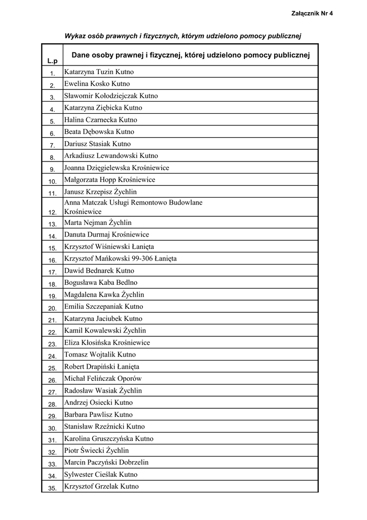 Załącznik Nr 4 Wykaz osób prawnych i fizycznych, którym udzielono pomocy publicznej L.p Dane osoby prawnej i fizycznej, której udzielono pomocy publicznej 1. Katarzyna Tuzin Kutno 2. Ewelina Kosko Kutno 3. Sławomir Kołodziejczak Kutno 4. Katarzyna Ziębicka Kutno 5. Halina Czarnecka Kutno 6. Beata Dębowska Kutno 7. Dariusz Stasiak Kutno 8. Arkadiusz Lewandowski Kutno 9. Joanna Dzięgielewska Krośniewice 10. Małgorzata Hopp Krośniewice Janusz Krzepisz śychlin Anna Matczak Usługi Remontowo Budowlane 12. Krośniewice 13. Marta Nejman śychlin 11. 14. Danuta Durmaj Krośniewice 15. Krzysztof Wiśniewski Łanięta 16. Krzysztof Mańkowski 99-306 Łanięta 17. Dawid Bednarek Kutno 18. Bogusława Kaba Bedlno 19. Magdalena Kawka śychlin 20. Emilia Szczepaniak Kutno 21. Katarzyna Jaciubek Kutno 22. Kamil Kowalewski śychlin 23. Eliza Kłosińska Krośniewice 24. Tomasz Wojtalik Kutno 25. Robert Drapiński Łanięta 26. Michał Felińczak Oporów 27. Radosław Wasiak śychlin 28. Andrzej Osiecki Kutno 29. Barbara Pawlisz Kutno 30. Stanisław Rzeźnicki Kutno 31. Karolina Gruszczyńska Kutno 32. Piotr Świecki śychlin 33. Marcin Paczyński Dobrzelin 34. Sylwester Cieślak Kutno 35. Krzysztof Grzelak Kutno Załącznik Nr 4 Wykaz osób prawnych i fizycznych, którym udzielono pomocy publicznej 36. Mariusz Markiewicz Oporów 37. Arkadiusz Jujka KrzyŜanów 38. Anna Krawczyk Kutno 39. Bogdan Rzeźnicki Pniewo 40. Wacława Wójkowska Kutno 41. Justyna Cabała Kutno 42. Agnieszka Kaniewska Gołębiewek Stary 43. Aneta Dębska Augustopol 44. Robert Woźniak Kutno 45. Elzbieta Miziołek Kutno 46. Sebastian Jaworski Aleksandrówka 47. Sylwia Ozon Krośniewice 48. Marek Paszczyk Rustów 49. Agnieszka Miedzińska BoŜa Wola 50. Marek Grzegory Kutno 51. Tomasz Orzelski Kutno 52. Karolina Donakowska Kutno 53. Juliusz Dąbrowicz Miłonice 54. Wojciech Dipierro Kutno 55. Dawid Dominiak Kutno 56. Bogusława Kacprowicz Krośniewice 57. Marcin Lisiecki Kutno 58. RóŜa Pawlik Budzyń 59. Adam Grochowina Krzesin Parcela 60. Dominik DomŜał Kutno 61. Mariola Balcerak Klonowiec Stary 62. Emilia Tomaszewska Kutno 63. Marcin Witkowski Kutno 64. Joanna Kruczak Nowa Wieś 65. Marek Antczak Kutno 66. Janusz Pluciński Wola Pierowa 67. Beata Ujazda-Kotecka śychlin 68. Kazimierz Weselski Kutno 69. Jakub Kowalewski Kutno 70. Tomasz Kita Kutno 71. Mariusz Kacprzak Nowa Wieś 72. Dominika Łukowczyk Kutno 73. Katarzyna Lewandowska Kutno Załącznik Nr 4 Wykaz osób prawnych i fizycznych, którym udzielono pomocy publicznej 74. Monika Ledzion Kutno 75. Mariusz Dąbrowicz Miłonice 76. Aneta Lubasińska Kręcieszki 77. Paweł Nasalski śychlin 78. Paweł Grams Kutno 79. Tomasz Grabowski Witów 80. Bartosz Lewndowski 81. Tomasz Tokarski Kutno 82. Tomasz Pawłowski Gołebiew Nowy 83. Agnieszka Lewandowska Kutno 84. Konrad Lasecki Podczachy 85. Anna Michalska śychlin 86. Mariusz Kuźnicki Raciborów 87. Jacek Matysiak Kutno 88. Rafał Szczepański Ostrowy Cukrownia 89. Anna Górecka Wola Chruścińska 90. Andrzej Orlikowski śychlin 91. Izabela Furmańczyk Kutno 92. Damian Kwit Kutno 93. Ryszard Igielski śychlin 94. Monika Banachowicz Dobrzelin 95. Renata Wiktorek Kutno 96. Mariusz Jankowski Kutno 97. Mirosław Wojciechowski śychlin 98. Przemysław Leitgeber Kutno 99. Jacek Gabryelczyk Konstantynów 100. Kinga Kisielewska Kutno Bartosz Klembalski Kutno Firma remontowo-budowlana RPB-MICH Robert Pęgowski 102. Byszew Przedsiębiorstwo Handlu Sprzętem Rolniczym AGROMA 103. Kutno Usługi remontowo-budowlane Romuald Kaczmarek 104. Ostrowy 101. 105. 106. 107. 108. 109. Zakład Specjalistyczny Dezynfekcji, Dezynfekcji i Deratyzacji Matusiak Józef Kutno Sklep spoŜywczo-przemysłowy Edyta Karczewska śeronice SPECJALISTA Sp. z.o.o Bierzewice P.P.H.U. AGMAR Mariusz Pomianowaki Radziejów Firma Handlowa CLASSIC Adam Gazda Dęblin Załącznik Nr 4 Wykaz osób prawnych i fizycznych, którym udzielono pomocy publicznej JAMPAJ Jerzy Gal Kutno 111. EEG BIOFEEDBACK Magdalena Welke Kutno 110. 112. P..H.U. MAJCHER Wojciech Majchrzak Pasieka 113. F.H.U. ANNA Anna Kubiak Kutno 114. TĘCZA Edyta Kołodziejczak śychlin 115. AP-Usługi Informatyczne Piotr Zalas Kutno 116. WAśKA Monika Berlińska Gostynin 117. Izabela Kałębasiak Kutno 118. Anna Matych śychlin 119. Zdzisław Kotecki Leszno 120. Ewa Komorowska Kutno 121. Patryk Półtorak Kutno 122. ElŜbieta Szymańska śychlin 123. Marzena Kacprzak Dąbrowice 124. Marcin Chodor Kutno 125. Marzanna Rybak Gołebiew Stary 126. GraŜyna Stachowicz Kutno 127. Józef Furman Wola Popowa 128. Zbigniew Michalak Kutno 129. Justyna Łuczak Krośniewice 130. Marek Borkowski Kutno 131. Izabela Kowalska Kurów Wieś 132. Kamil Pietrzak Józefów 133. Katarzyna Jaskuła śychlin 134. Sylwia Fryt Kutno 135. Lidia Wójkowska Kutno 136. ElŜbieta Tomaszewska 99-320 śychlin 137. Maciej Rogoziński Gołębiew Nowy 138. Łukasz Tomaszewski Kutno 139. Simona Tomasik Kutno 140. Aleksandra Lachowicz Kutno 141. Małgorzata Walczak Kutno 142. Katarzyna Piaszczyńska Kutno 143. Marta Zardzawiecka Kutno 144. Tomasz Radecki Głogowa Krośniewice 145. Przemysław Ozimiński Kutno 146. Ewelina Cieślak śychlin 147. Anna Józefkowicz Krośniewice Załącznik Nr 4 Wykaz osób prawnych i fizycznych, którym udzielono pomocy publicznej 148. Aleksandra Bartczak Gołębiewek Nowy 149. Urszula Rogacka Lipiny 150. Dariusz Szczepański śychlin 151. Zbigniew Kawka Kutno 152. Dariusz Jóźwiak Kutno 153. Walenty śuchowski śychlin 154. Mariusz Rykowski śychlin 155. Monika Twardowska Muchnice Nowe 156. Katarzyna Konarzewska Rustów 157. Marzena Cywińska Kutno 158. ElŜbieta Słowińska Krośniewice 159. Joanna Kaźmierczak Leszczynek 160. Arkadiusz Gawrysiak Kutno 161. Jerzy Krasucki Krośniewice 162. Marzenna Sierakowska Wola Nowska 163. Dariusz Kwiatkowski Krośniewice 164. Mariusz Jaciński Gołębiew Nowy 165. Aneta Wojciechowska Kutno 166. Konrad Świecki Florianów 167. Arkadiusz Turowiecki Kutno 168. Iwona Oko