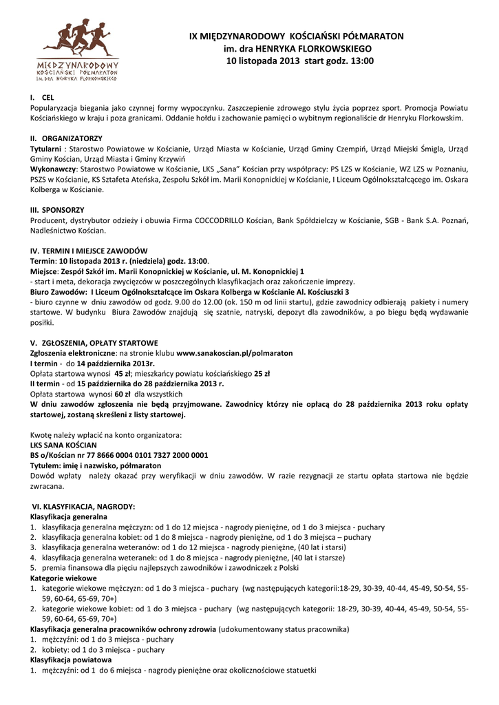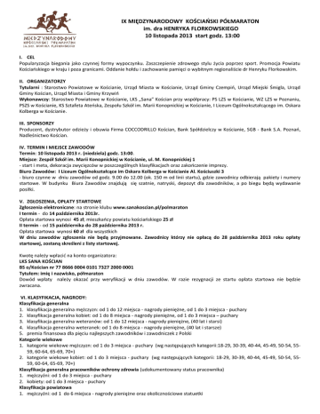 IX MIĘDZYNARODOWY KOŚCIAŃSKI PÓŁMARATON im. dra HENRYKA FLORKOWSKIEGO 10 listopada 2013 start godz. 13:00 I. CEL Popularyzacja biegania jako czynnej formy wypoczynku. Zaszczepienie zdrowego stylu życia poprzez sport. Promocja Powiatu Kościańskiego w kraju i poza granicami. Oddanie hołdu i zachowanie pamięci o wybitnym regionaliście dr Henryku Florkowskim. II. ORGANIZATORZY Tytularni : Starostwo Powiatowe w Kościanie, Urząd Miasta w Kościanie, Urząd Gminy Czempiń, Urząd Miejski Śmigla, Urząd Gminy Kościan, Urząd Miasta i Gminy Krzywiń Wykonawczy: Starostwo Powiatowe w Kościanie, LKS „Sana” Kościan przy współpracy: PS LZS w Kościanie, WZ LZS w Poznaniu, PSZS w Kościanie, KS Sztafeta Ateńska, Zespołu Szkół im. Marii Konopnickiej w Kościanie, I Liceum Ogólnokształcącego im. Oskara Kolberga w Kościanie. III. SPONSORZY Producent, dystrybutor odzieży i obuwia Firma COCCODRILLO Kościan, Bank Spółdzielczy w Kościanie, SGB - Bank S.A. Poznań, Nadleśnictwo Kościan. IV. TERMIN I MIEJSCE ZAWODÓW Termin: 10 listopada 2013 r. (niedziela) godz. 13:00. Miejsce: Zespół Szkół im. Marii Konopnickiej w Kościanie, ul. M. Konopnickiej 1 - start i meta, dekoracja zwycięzców w poszczególnych klasyfikacjach oraz zakończenie imprezy. Biuro Zawodów: I Liceum Ogólnokształcące im Oskara Kolberga w Kościanie Al. Kościuszki 3 - biuro czynne w dniu zawodów od godz. 9.00 do 12.00 (ok. 150 m od linii startu), gdzie zawodnicy odbierają pakiety i numery startowe. W budynku Biura Zawodów znajdują się szatnie, natryski, depozyt dla zawodników, a po biegu będą wydawanie posiłki. V. ZGŁOSZENIA, OPŁATY STARTOWE Zgłoszenia elektroniczne: na stronie klubu www.sanakoscian.pl/polmaraton I termin - do 14 października 2013r. Opłata startowa wynosi 45 zł; mieszkańcy powiatu kościańskiego 25 zł II termin - od 15 października do 28 października 2013 r. Opłata startowa wynosi 60 zł dla wszystkich W dniu zawodów zgłoszenia nie będą przyjmowane. Zawodnicy którzy nie opłacą do 28 października 2013 roku opłaty startowej, zostaną skreśleni z listy startowej. Kwotę należy wpłacić na konto organizatora: LKS SANA KOŚCIAN BS o/Kościan nr 77 8666 0004 0101 7327 2000 0001 Tytułem: imię i nazwisko, półmaraton Dowód wpłaty należy okazać przy weryfikacji w dniu zawodów. W razie rezygnacji ze startu opłata startowa nie będzie zwracana. VI. KLASYFIKACJA, NAGRODY: Klasyfikacja generalna 1. klasyfikacja generalna mężczyzn: od 1 do 12 miejsca - nagrody pieniężne, od 1 do 3 miejsca - puchary 2. klasyfikacja generalna kobiet: od 1 do 8 miejsca - nagrody pieniężne, od 1 do 3 miejsca – puchary 3. klasyfikacja generalna weteranów: od 1 do 12 miejsca - nagrody pieniężne, (40 lat i starsi) 4. klasyfikacja generalna weteranek: od 1 do 8 miejsca - nagrody pieniężne, (40 lat i starsze) 5. premia finansowa dla pięciu najlepszych zawodników i zawodniczek z Polski Kategorie wiekowe 1. kategorie wiekowe mężczyzn: od 1 do 3 miejsca - puchary (wg następujących kategorii:18-29, 30-39, 40-44, 45-49, 50-54, 5559, 60-64, 65-69, 70+) 2. kategorie wiekowe kobiet: od 1 do 3 miejsca - puchary (wg następujących kategorii: 18-29, 30-39, 40-44, 45-49, 50-54, 5559, 60-64, 65-69, 70+) Klasyfikacja generalna pracowników ochrony zdrowia (udokumentowany status pracownika) 1. mężczyźni: od 1 do 3 miejsca - puchary 2. kobiety: od 1 do 3 miejsca - puchary Klasyfikacja powiatowa 1. mężczyźni: od 1 do 6 miejsca - nagrody pieniężne oraz okolicznościowe statuetki 2. kobiety: od 1 do 4 miejsca - nagrody pieniężne oraz okolicznościowe statuetki Lotna premia na pierwszym okrążeniu 1. mężczyźni: 1 miejsce - nagroda finansowa 2. kobiety: 1 miejsce - nagroda finansowa Kategoria „Sprawni Razem” - oddzielna klasyfikacja kobiet i mężczyzn – 0d 1 do 3 miejsca nagrody Od nagród przekraczających 760 zł pobrany będzie podatek. Zawodnik odbierający nagrodę powinien posiadać: PESEL oraz adres właściwego urzędu skarbowego). VII. BIEG TOWARZYSZĄCY Bieg Coccodrillo na dystansie ok. 6,5 km – start godz. 13.00 Klasyfikacja, nagrody Klasyfikacja generalna 1. mężczyźni: od 1 do 3 miejsca - puchary 2. kobiety: od 1 do 3 miejsca - puchary Kategorie wiekowe 1. mężczyźni: od 1 do 3 miejsca - nagrody rzeczowe (16-19, 20-39, 40 +) 2. kobiety: od 1 do 3 miejsca - nagrody rzeczowe (16-19, 20-39, 40+) Zgłoszenia, opłaty startowe Zgłoszenia elektroniczne: na stronie klubu www.sanakoscian.pl/polmaraton I termin - do 14 października 2013 r. Opłata startowa wynosi 25 zł, mieszkańcy powiatu kościańskiego 15 zł II termin - od 15 października do 28 października 2013 r. Opłata startowa 40 zł dla wszystkich Kwotę należy wpłacić na konto organizatora: LKS SANA KOŚCIAN BS o/Kościan nr 77 8666 0004 0101 7327 2000 0001 Tytułem: imię i nazwisko, Bieg Coccodrillo Dowód wpłaty należy okazać przy weryfikacji w dniu zawodów. W razie rezygnacji ze startu opłata startowa nie będzie zwracana W dniu zawodów zgłoszenia nie będą przyjmowane. Zawodnicy którzy nie opłacą do dnia 28 października 2013 r. opłaty startowej zostaną skreśleni z listy startowej. W biegu towarzyszącym prawo startu mają osoby urodzone w roku 1997 i starsi, młodsze osoby mają prawo startu w biegu za pisemną zgodą rodziców lub opiekunów prawnych. VIII. UWAGI KOŃCOWE 1. Limit zgłoszeń na Półmaraton wynosi 1 500 osób, decydować będzie kolejność zgłoszeń z dokonaną opłatą startową w określonym w regulaminie terminie. 2. Pomiar czasu odbywać się będzie przy użyciu chipów elektronicznych ( które należy zwrócić po ukończeniu biegu ) 3. Każdego zawodnika obowiązują badania lekarskie lub w przypadku braku badań, zawodnik podpisuje oświadczenie, iż startuje na własną odpowiedzialność i jest świadomy swojego stanu zdrowia. 4. Do startu w Półmaratonie dopuszczeni zostaną zawodnicy, którzy ukończyli 18 lat. 5. Organizator 