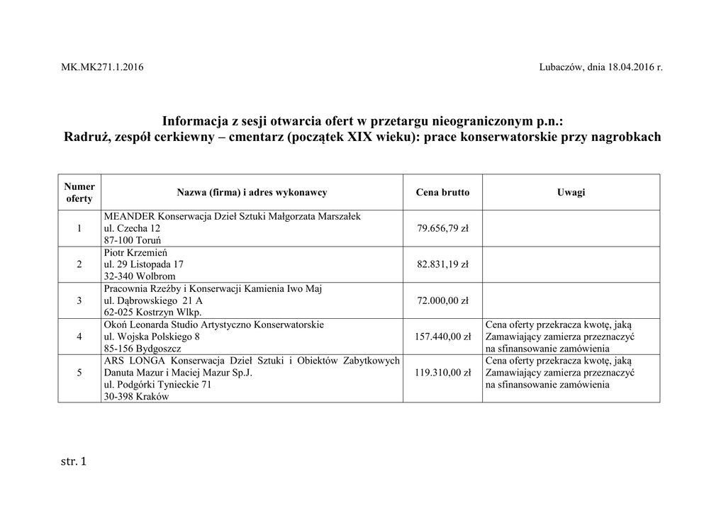 Lubaczów, dnia 18.04.2016 r. MK.MK271.1.2016 Informacja z sesji otwarcia ofert w przetargu nieograniczonym p.n.: Radruż, zespół cerkiewny – cmentarz (początek XIX wieku): prace konserwatorskie przy nagrobkach Numer oferty 1 2 3 4 5 str. 1 Nazwa (firma) i adres wykonawcy MEANDER Konserwacja Dzieł Sztuki Małgorzata Marszałek ul. Czecha 12 87-100 Toruń Piotr Krzemień ul. 29 Listopada 17 32-340 Wolbrom Pracownia Rzeźby i Konserwacji Kamienia Iwo Maj ul. Dąbrowskiego 21 A 62-025 Kostrzyn Wlkp. Okoń Leonarda Studio Artystyczno Konserwatorskie ul. Wojska Polskiego 8 85-156 Bydgoszcz ARS LONGA Konserwacja Dzieł Sztuki i Obiektów Zabytkowych Danuta Mazur i Maciej Mazur Sp.J. ul. Podgórki Tynieckie 71 30-398 Kraków Cena brutto Uwagi 79.656,79 zł 82.831,19 zł 72.000,00 zł 157.440,00 zł 119.310,00 zł Cena oferty przekracza kwotę, jaką Zamawiający zamierza przeznaczyć na sfinansowanie zamówienia Cena oferty przekracza kwotę, jaką Zamawiający zamierza przeznaczyć na sfinansowanie zamówienia 6 7 8 9 Konsorcjum Wykonawców: Grzegorz Lasota Konserwacja Zabytków – lider konsorcjum ul. Solarza 6/16, 35-118 Rzeszów Marek Sawicki Pracownia Dzieł Sztuki Konsart – partner konsorcjum ul. Studencka 7a/6 31-116 Kraków Konserwacja Dzieł Sztuki Prace Budowlane Danuta Majewska ul. Dauna 23 30-566 Kraków MAFORMA Miron Keller ul. Mokotowska 24 lok. 53/54 00-561 Wrszawa ARS – RESTAURO – Roman Dawidziak ul. Nazimka 2/34 35-302 Rzeszów 96.000,00 zł 64.575,00 zł 108.761,47 zł Cena oferty przekracza kwotę, jaką Zamawiający zamierza przeznaczyć na sfinansowanie zamówienia 34.500,00 zł Oferta z najniższą ceną Kwota, jaką Zamawiający zamierza przeznaczyć na sfinansowanie zamówienia: 100.000,00 zł brutto Dyrektor Muzeum Kresów w Lubaczowie mgr Stanisław Piotr Makara str. 2