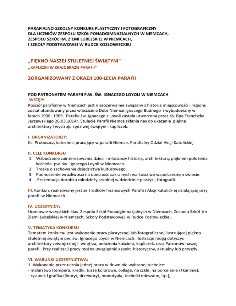 PARAFIALNO-SZKOLNY KONKURS PLASTYCZNY I FOTOGRAFICZNY DLA UCZNIÓW ZESPOŁU SZKÓŁ PONADGIMNAZJALNYCH W NIEMCACH, ZESPOŁU SZKÓŁ IM. ZIEMI LUBELSKIEJ W NIEMCACH, I SZKOŁY PODSTAWOWEJ W RUDCE KOZŁOWIECKIEJ „PIĘKNO NASZEJ STULETNIEJ ŚWIĄTYNI” „KAPLICZKI W KRAJOBRAZIE PARAFII” ZORGANIZOWANY Z OKAZJI 100-LECIA PARAFII POD PATRONATEM PARAFII P.W. ŚW. IGNACEGO LOYOLI W NIEMCACH WSTĘP: Kościół parafialny w Niemcach jest nierozerwalnie związany z historią miejscowości i regionu został ufundowany przez właściciela Dóbr Niemce Ignacego Budnego i wybudowany w latach 1906- 1909. Parafia św. Ignacego z Loyoli zastała utworzona przez Ks. Bpa Franciszka Jaczewskiego 26.03.1014r. Stulecie Parafii Niemce skłania nas do ukazania piękna architektury i wystroju sędziwej świątyni i kapliczek. I. ORGANIZATORZY: Ks. Proboszcz, katecheci pracujący w parafii Niemce, Parafialny Odział Akcji Katolickiej II. CELE KONKURSU 1. Wzbudzanie zainteresowania dzieci i młodzieży historią, architekturą, pięknem położenia kościoła pw. św. Ignacego Loyoli w Niemcach. 2. Troska o zachowanie dziedzictwa kulturowego. 3. Podnoszenie wrażliwości na obecność sakralnych wartości we współczesnym świecie. 4. Prezentacja dorobku młodzieży szkolnej w dziedzinie plastyki, fotografii. III. Konkurs realizowany jest ze środków finansowych Parafii i Akcji Katolickiej działającej przy parafii w Niemcach IV. UCZESTNICY: Uczniowie wszystkich klas Zespołu Szkół Ponadgimnazjalnych w Niemcach, Zespołu Szkół im Ziemi Lubelskiej w Niemcach, Szkoły Podstawowej w Rudce Kozłowieckiej. V. TEMATYKA KONKURSU Tematem konkursu jest wykonanie pracy plastycznej lub fotograficznej ilustrującej piękno stuletniej świątyni pw. św. Ignacego Loyoli w Niemcach. Ilustracje mogą dotyczyć architektury zewnętrznej i wnętrza, położenia kościoła, kapliczek. oraz Patronów naszej parafii. Przy realizacji pracy można uwzględnić aspekt historyczny, aktualny lub przyszły. VI. WARUNKI UCZESTNICTWA: 1. Wykonanie przez ucznia jednej pracy w dowolnie wybranej technice: - malarstwo (tempera, kredki, tusze kolorowe, collage, na szkle, na porcelanie i tkaninie), - rysunek i grafika (linoryt, drzeworyt, monotypia, techniki mieszane, itp.), - tkanina artystyczna (batik, filc, haft, tkactwo…), - rzeźby, płaskorzeźby, - fotografia 2. Wymiary prac dowolne, format prac malarskich nie mniejszy niż A-4 , fotograficznych nie mniejszy niż A-5. 3. Każda praca powinna być na odwrocie opatrzona kartą informacyjną zawierającą: - imię i nazwisko, wiek autora ,klasę, - imię i nazwisko nauczyciela pod którego kierunkiem została wykonana VII. ZASADY OCENIANIA I NAGRADZANIA: Prace będą oceniane i nagradzane z zachowaniem podziału na grupy wiekowe: 1) uczniowie klas 0-3 Szkoły Podstawowej 2) uczniowie klas 4-6 Szkoły Podstawowej 3) uczniowie klas I-III Gimnazjum 4) uczniowie Zespołu Szkół Ponadgimnazjalnych Najciekawsze prace będą nagrodzone i zaprezentowane na wystawie pokonkursowej w kościele w czasie trwania Misji Świętych od dn.30.03.2014r. VIII. TERMINY: Prace na konkurs należy przekazać do kancelarii parafialnej lub katechetom do dnia 15 marca 2014r. VIII. UWAGI KOŃCOWE: 1. Prace niezgodne z regulaminem nie będą brane pod uwagę. 2. Prace nagrodzone i wyróżnione przechodzą na własność organizatora. 3.Wszelkich informacji na temat konkursu udzielają księża i katecheci. ZAPRASZAMY DO UDZIAŁU W KONKURSIE ! www.niemce.kuria.lublin.pl