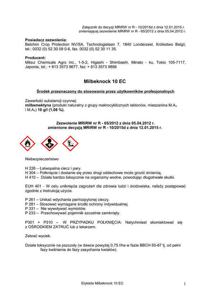 Załącznik do decyzji MRiRW nr R - 10/2015d z dnia 12.01.2015 r. zmieniającej zezwolenie MRiRW nr R - 65/2012 z dnia 05.04.2012 r. Posiadacz zezwolenia: Belchim Crop Protection NV/SA, Technologielaan 7, 1840 Londerzeel, Królestwo Belgii, tel.: 0032 (0) 52 30 09 0-6, fax. 0032 (0) 52 30 11 35. Producent: Mitsui Chemicals Agro Inc., 1-5-2, Higashi - Shimbashi, Minato - ku, Tokio 105-7117, Japonia, tel.: + 813 3573 9677, fax: + 813 3573 9898 Milbeknock 10 EC Środek przeznaczony do stosowania przez użytkowników profesjonalnych Zawartość substancji czynnej: milbemektyna (produkt naturalny z grupy makrocyklicznych laktonów, mieszanina M.A3 i M.A4) 10 g/l (1,08 %). Zezwolenie MRiRW nr R - 65/2012 z dnia 05.04.2012 r. zmienione decyzją MRiRW nr R - 10/2015d z dnia 12.01.2015 r. Niebezpieczeństwo H 226 – Łatwopalna ciecz i pary. H 304 – Połknięcie i dostanie się przez drogi oddechowe może grozić śmiercią. H 410 – Działa bardzo toksycznie na organizmy wodne, powodując długotrwałe skutki. EUH 401 W celu uniknięcia zagrożeń dla zdrowia ludzi i środowiska, należy postępować zgodnie z instrukcją użycia. P 261 – Unikać wdychania par/rozpylonej cieczy. P 281 – Stosować wymagane środki ochrony indywidualnej. P 331 – Nie wywoływać wymiotów. P 233 – Przechowywać pojemnik szczelnie zamknięty. P301 + P310 – W PRZYPADKU POŁKNIĘCIA: Natychmiast skontaktować się z OŚRODKIEM ZATRUĆ lub z lekarzem. Zebrać wyciek. Działa toksycznie na pszczoły (w dawce powyżej 0,75 l/ha w fazie BBCH 65-67 tj. od pełni fazy kwitnienia do fazy zasychania kwiatów). Etykieta Milbeknock 10 EC 1 OPIS DZIAŁANIA Środek z grupy akarycydów w formie koncentratu do sporządzania emulsji wodnej, przeznaczony do zwalczania przędziorków i pordzewiaczy na jabłoni. Zwalcza wszystkie stadia rozwojowe roztoczy. Substancja aktywna działa na system nerwowy roztoczy, powodując ich paraliż. Środek ma działanie kontaktowe i żołądkowe. Na roślinie działa powierzchniowo i wgłębnie. Środek przeznaczony do stosowania przy użyciu opryskiwaczy sadowniczych i ręcznych. STOSOWANIE ŚRODKA ROŚLINY SADOWNICZE Jabłoń przędziorek owocowiec, pordzewiacz jabłoniowy Preparat stosować od końca fazy opadania płatka maksymalnie przez następne 4 tygodnie. Wyższą z zalecanych dawek stosować w przypadku dużej liczebności szkodnika. Zalecana dawka dla jednorazowego stosowania: 0,75 - 1,0 l/ha. Maksymalna dawka dla jednorazowego stosowania: 1,0 l/ha. Maksymalna liczba zabiegów w sezonie: 1. Zalecana ilość wody w uprawach sadowniczych: 500 - 750 l/ha. Zalecane opryskiwanie: średniokropliste. ŚRODKI OSTROŻNOŚCI PRAKTYKĄ ROLNICZĄ I ZALECENIA STOSOWANIA ZWIĄZANE Z DOBRĄ 1. Środek wykazuje wysoką skuteczność niezależnie od temperatury, ale nie zaleca się jego stosowania w temperaturze wyższej niż 300C. 2. Środek stosować, gdy zostanie przekroczony próg ekonomicznej szkodliwości. 3. Środek należy stosować na rośliny nieuszkodzone z dobrze wykształconą warstwą kutikuli. 4. Opryskiwać całe rośliny, zwracając uwagę na dokładne pokrycie cieczą użytkową również dolnej strony liści. 5. Bardziej celowe jest stosowanie najwyższej z zalecanych ilości wody w zabiegach. 6. Środka nie stosować w odmianie jabłoni Golden Delicious. 7. Przy stosowaniu środka w odmianach Gala, Braeburn, Kanzi i Cameo należy zachować odstęp 5-dniowy przed i po wykonaniu zabiegów innymi środkami ochrony roślin. 8. Nie stosować zabiegów ultra drobnokroplistych. 9. Aby zapobiegać zjawisku odporności środek może być stosowany 1 raz w sezonie wegetacyjnym. Pozostałe zabiegi wykonać środkami należącymi do innych grup chemicznych, o odmiennym mechanizmie działania. SPORZĄDZANIE CIECZY UŻYTKOWEJ Przed przystąpieniem do sporządzania cieczy użytkowej dokładnie ustalić potrzebną jej ilość. Odmierzoną ilość preparatu wlać do zbiornika opryskiwacza napełnionego częściowo wodą i uzupełnić wodą do potrzebnej ilości. Opróżnione opakowania przepłukać trzykrotnie wodą, a popłuczyny wlać do zbiornika opryskiwacza z cieczą użytkową, uzupełnić wodą do potrzebnej ilości i dokładnie wymieszać. WARUNKI BEZPIECZNEGO STOSOWANIA ŚRODKA Przed zastosowaniem środka należy poinformować o tym fakcie wszystkie zainteresowane strony, które mogą być narażone na znoszenie cieczy roboczej i które zwróciły się o taką informację. Środki ostrożności dla osób stosujących środek: Etykieta Milbeknock 10 EC 2 Nie jeść, nie pić ani nie palić podczas stosowania środka. Stosować rękawice ochronne oraz odzież ochronną, zabezpieczającą przed oddziaływaniem środków ochrony roślin oraz obuwie ochronne (np. kalosze) w trakcie przygotowywania cieczy roboczej oraz w trakcie wykonywania zabiegu. Środki ostrożności związane z ochroną środowiska naturalnego: Nie zanieczyszczać wód środkiem ochrony roślin lub jego opakowaniem. Nie myć aparatury w pobliżu wód powierzchniowych. Unikać zanieczyszczenia wód poprzez rowy odwadniające z gospodarstw i dróg. W celu ochrony organizmów wodnych konieczne jest zastosowanie strefy ochronnej o szerokości 20 m od zbiorników i cieków wodnych. W celu ochrony roślin oraz stawonogów niebędących celem działania środka konieczne jest wyznaczenie strefy ochronnej o szerokości 3 m od terenów nieużytkowanych rolniczo. W przypadku stosowania dawki powyżej 0,75 l/ha w fazie BBCH 65 - 67 tj. od pełni fazy kwitnienia do fazy zasychania kwiatów: W celu ochrony pszczół i innych owadów zapylających nie stosować na rośliny uprawne w czasie kwitnienia. Nie używać w miejscach, gdzie pszczoły maja pożytek. Można stosować wcześnie rano przed wylotem pszczół na uprawę lub wieczorem po zakończeniu oblotu roślin przez pszczoły i inne gatunki zapylające. Okres od zastosowania środka do dnia, w którym na obszar, na którym zastosowano środek mogą wejść ludzie oraz zo