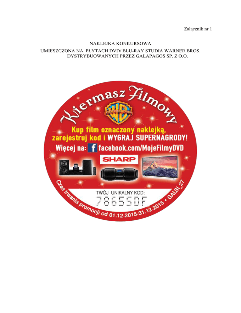 Załącznik nr 1 NAKLEJKA KONKURSOWA UMIESZCZONA NA PŁYTACH DVD/ BLU-RAY STUDIA WARNER BROS. DYSTRYBUOWANYCH PRZEZ GALAPAGOS SP. Z O.O.