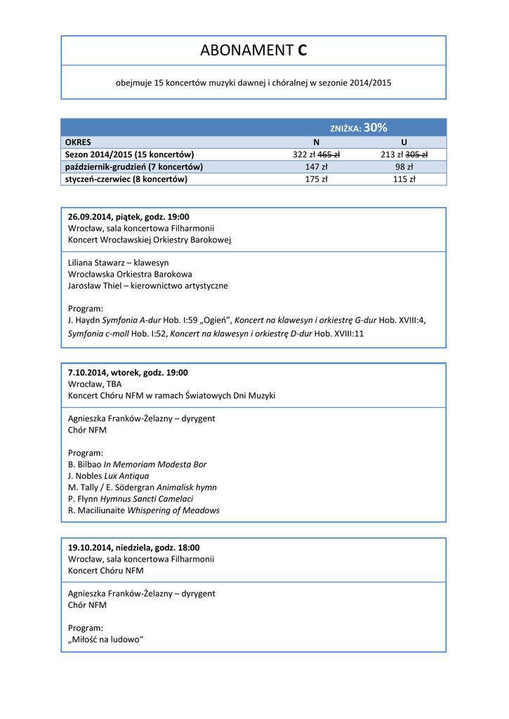 ABONAMENT C obejmuje 15 koncertów muzyki dawnej i chóralnej w sezonie 2014/2015 ZNIŻKA: 30% OKRES Sezon 2014/2015 (15 koncertów) październik-grudzień (7 koncertów) styczeń-czerwiec (8 koncertów) N 322 zł 465 zł 147 zł 175 zł U 213 zł 305 zł 98 zł 115 zł 26.09.2014, piątek, godz. 19:00 Wrocław, sala koncertowa Filharmonii Koncert Wrocławskiej Orkiestry Barokowej Liliana Stawarz – klawesyn Wrocławska Orkiestra Barokowa Jarosław Thiel – kierownictwo artystyczne Program: J. Haydn Symfonia A-dur Hob. I:59 „Ogień”, Koncert na klawesyn i orkiestrę G-dur Hob. XVIII:4, Symfonia c-moll Hob. I:52, Koncert na klawesyn i orkiestrę D-dur Hob. XVIII:11 7.10.2014, wtorek, godz. 19:00 Wrocław, TBA Koncert Chóru NFM w ramach Światowych Dni Muzyki Agnieszka Franków-Żelazny – dyrygent Chór NFM Program: B. Bilbao In Memoriam Modesta Bor J. Nobles Lux Antiqua M. Tally / E. Södergran Animalisk hymn P. Flynn Hymnus Sancti Camelaci R. Maciliunaite Whispering of Meadows 19.10.2014, niedziela, godz. 18:00 Wrocław, sala koncertowa Filharmonii Koncert Chóru NFM Agnieszka Franków-Żelazny – dyrygent Chór NFM Program: „Miłość na ludowo“ 24.10.2014, piątek, godz. 19:00 Wrocław, sala koncertowa Filharmonii Koncert Wrocławskiej Orkiestry Barokowej Marcin Sompoliński – dyrygent Soliści Chór NFM Agnieszka Franków-Żelazny – kierownictwo artystyczne Wrocławska Orkiestra Barokowa Jarosław Thiel – kierownictwo artystyczne Program: W.A. Mozart Requiem d-moll KV 626 9.11.2014, niedziela, godz. 18:00 Wrocław, sala koncertowa Filharmonii Koncert Wrocławskiej Orkiestry Barokowej Jarosław Thiel – dyrygent Soliści Chór NFM Agnieszka Franków-Żelazny – kierownictwo artystyczne Wrocławska Orkiestra Barokowa Program: C.Ph.E. Bach Izraelici na pustyni Wq 238 14.12.2014, niedziela, godz. 18:00 Wrocław, sala koncertowa Filharmonii Koncert Wrocławskiej Orkiestry Barokowej Jarosław Thiel – dyrygent Soliści Wrocławska Orkiestra Barokowa Program: M.J. Żebrowski Rorate coeli, Magnificat J.S. Bach Darzu ist erschienen der Sohn Gottes BWV 40, Unser Mund sei voll Lachens BWV 110 – kantaty na Boże Narodzenie 21.12.2014, niedziela, godz. 18:00 Wrocław, sala koncertowa Filharmonii Koncert Chóru NFM Agnieszka Franków-Żelazny – dyrygent Małgorzata Podzielny – dyrygent Agnieszka Lewandowska-Gryś – fortepian Chór Chłopięcy NFM Chór NFM Program: Kolędy i pastorałki 11.01.2015, niedziela, godz. 18:00 Wrocław, sala koncertowa Filharmonii Koncert Wrocławskiej Orkiestry Barokowej Fabio Bonizzoni – dyrygent Soliści Wrocławska Orkiestra Barokowa Jarosław Thiel – kierownictwo artystyczne Program: A. Scarlatti San Casimiro re di Polonia 22.02.2015, niedziela, godz. 18:00 Wrocław, sala koncertowa Filharmonii Koncert Chóru NFM Anna Szostak – dyrygent Chór NFM Agnieszka Franków-Żelazny – kierownictwo artystyczne Program: A. Panufnik Song to the Virgin Mary W. Kilar Dona nobis pacem z Missa pro pace H.M. Górecki Euntes ibant et flebant A. Pärt Morning Star, Da pacem Domine, The Deer’s Cry, Magnificat K. Penderecki Stabat Mater, O gloriosa virginum 15.03.2015, niedziela, godz. 18:00 Wrocław, sala koncertowa Filharmonii Koncert Wrocławskiej Orkiestry Barokowej Wrocławska Orkiestra Barokowa Jarosław Thiel – kierownictwo artystyczne Program W.A. Mozart Adagio i fuga c-moll KV 546 F. Mendelssohn-Bartholdy XII Symfonia kameralna g-moll E. Grieg Suita w dawnym stylu „Z czasów Holberga” op. 40 O. Respighi Antiche danze ed arie per liuto – III Suita: wiek XVI i XVII H.M. Górecki Trzy utwory w dawnym stylu 1.04.2015, środa, godz. 18:00 Wrocław, sala koncertowa Filharmonii Koncert specjalny Andrzej Kosendiak – dyrygent Soliści Chór Chłopięcy NFM Małgorzata Podzielny – kierownictwo artystyczne Artyści Chóru NFM Wrocławska Orkiestra Barokowa Jarosław Thiel – kierownictwo artystyczne Program: J.S. Bach Pasja wg św. Jana BWV 245 11.04.2015, sobota, godz. 18:00 Wrocław, sala koncertowa Filharmonii Koncert Wrocławskiej Orkiestry Barokowej Jarosław Thiel – dyrygent Soliści Wrocławska Orkiestra Barokowa Program: J.S. Bach Am Abend aber desselbigen Sabbats BWV 42, Ein Herz, das seinen Jesum lebend weiß BWV 134, Ihr werdet weinen und heulen BWV 103, Halt im Gedächtnis Jesum Christ BWV 67 – kantaty wielkanocne 26.04.2015, niedziela, godz. 18:00 Wrocław, sala koncertowa Filharmonii Koncert Chóru Filharmonii Wrocławskiej Paulo Lourenço – dyrygent Chór NFM Agnieszka Franków-Żelazny – kierownictwo artystyczne Program: Muzyka z Portugalii G. Fernandes Pois com tanta graça Anonymus Sã Qui Turo Zente Pleta J.B. Santos 4 Canciones: I De los álamos vengo, II Al alba venid, III Al cantar de las aves, IV Ay luna que reluces M. Cardoso Non mortui D. Lobo Audivi vocem F. Mompou Cantar del alma E. Carrapatoso Algarve F. Lopes-Graça Fui-te ver, ´stavas lavando E. Carrapatoso S. João, Tenebrae factae sunt, Psalm CL L. Tinoco Descubro a voz H. Villa-Lobos Rosa Amarela P. Lourenço Olhó Rojão E. Carrapatoso Poemário de Sophia, Tuendi, Nanguiriche, Vangelo 24.05.2015, niedziela, godz. 18:00 Wrocław, sala koncertowa Filharmonii Koncert Chóru Chłopięcego NFM Andrzej Kosendiak – dyrygent Matthew Venner – kontratenor Chór Chłopięcy NFM Małgorzata Podzielny – kierownictwo artystyczne Chór NFM Agnieszka Franków-Żelazny – kierownictwo artystyczne Zespół Muzyki Dawnej Program: M. Zieleński Motety 7.06.2015, niedziela, godz. 18:00 Wrocław, sala koncertowa Filharmonii Koncert Wrocławskiej Orkiestry Barokowej Andrzej Kosendiak – dyrygent Soliści Wrocławska Orkiestra Barokowa Jarosław Thiel – kierownictwo artystyczne Program: J.S. Bach Laβ Fűrstin, laβ noch einen Strahl BWV 198, Schleicht, spielende Wellen BWV 206, Tönet, ihr Pauken! Erschallet, Trompeten! BWV 214 Narodowe Forum Muzyki zastrzega sobie prawo do wprowadzania zmian w programie.
