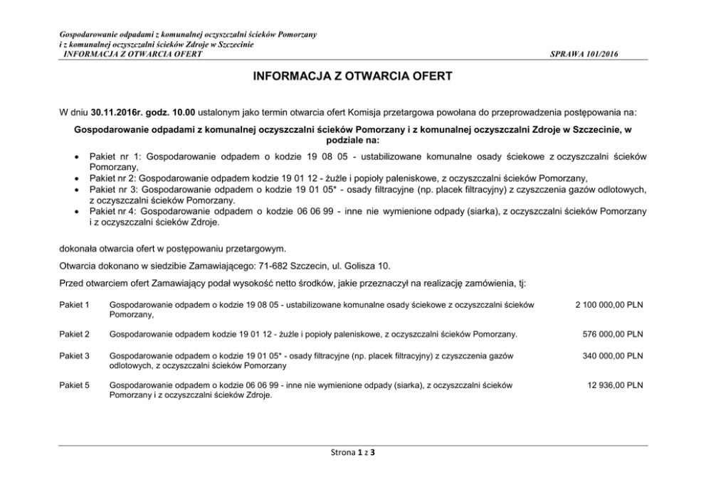 Gospodarowanie odpadami z komunalnej oczyszczalni ścieków Pomorzany i z komunalnej oczyszczalni ścieków Zdroje w Szczecinie INFORMACJA Z OTWARCIA OFERT SPRAWA 101/2016 INFORMACJA Z OTWARCIA OFERT W dniu 30.11.2016r. godz. 10.00 ustalonym jako termin otwarcia ofert Komisja przetargowa powołana do przeprowadzenia postępowania na: Gospodarowanie odpadami z komunalnej oczyszczalni ścieków Pomorzany i z komunalnej oczyszczalni Zdroje w Szczecinie, w podziale na: Pakiet nr 1: Gospodarowanie odpadem o kodzie 19 08 05 - ustabilizowane komunalne osady ściekowe z oczyszczalni ścieków Pomorzany, Pakiet nr 2: Gospodarowanie odpadem kodzie 19 01 12 - żużle i popioły paleniskowe, z oczyszczalni ścieków Pomorzany, Pakiet nr 3: Gospodarowanie odpadem o kodzie 19 01 05* - osady filtracyjne (np. placek filtracyjny) z czyszczenia gazów odlotowych, z oczyszczalni ścieków Pomorzany. Pakiet nr 4: Gospodarowanie odpadem o kodzie 06 06 99 - inne nie wymienione odpady (siarka), z oczyszczalni ścieków Pomorzany i z oczyszczalni ścieków Zdroje. dokonała otwarcia ofert w postępowaniu przetargowym. Otwarcia dokonano w siedzibie Zamawiającego: 71-682 Szczecin, ul. Golisza 10. Przed otwarciem ofert Zamawiający podał wysokość netto środków, jakie przeznaczył na realizację zamówienia, tj: Pakiet 1 Gospodarowanie odpadem o kodzie 19 08 05 - ustabilizowane komunalne osady ściekowe z oczyszczalni ścieków Pomorzany, Pakiet 2 Gospodarowanie odpadem kodzie 19 01 12 - żużle i popioły paleniskowe, z oczyszczalni ścieków Pomorzany. 576 000,00 PLN Pakiet 3 Gospodarowanie odpadem o kodzie 19 01 05* - osady filtracyjne (np. placek filtracyjny) z czyszczenia gazów odlotowych, z oczyszczalni ścieków Pomorzany 340 000,00 PLN Pakiet 5 Gospodarowanie odpadem o kodzie 06 06 99 - inne nie wymienione odpady (siarka), z oczyszczalni ścieków Pomorzany i z oczyszczalni ścieków Zdroje. 12 936,00 PLN Strona 1 z 3 2 100 000,00 PLN Gospodarowanie odpadami z komunalnej oczyszczalni ścieków Pomorzany i z komunalnej oczyszczalni ścieków Zdroje w Szczecinie INFORMACJA Z OTWARCIA OFERT SPRAWA 101/2016 W wyznaczonym terminie do 30.11.2016 r. do godz. 09:50 wpłynęło 5 ofert. Ofert złożonych po terminie nie otrzymano. Zestawienie złożonych ofert : Cena netto za zagospodarowanie 1 Mg odpadu L.p. 1 2 Data i godzina złożenia Oferty Termin płatności Nazwa i adres Wykonawcy 29.11.2016r. P.P.U IMAGO Mirosław Licznerski Godzina 1010 Ul. Polna 11, 74-100 Wełtyń 30.11.2016r. A.S.A. Eko Polska Sp. z o.o. Godzina 0845 ul. Lecha 10, 41-800 Zabrze Pakiet nr 1 Pakiet nr 2 Pakiet nr 3 Pakiet nr 4 19 08 05 19 01 12 19 01 05* 06 06 99 148,00 zł 30 dni 648,00 zł 30 dni 158,90 zł 30.11.2016r. 3 Godzina 0915 Eko Serwis Sp. z o. o. ul. Piotra i Pawła 9, 72-015 Police Strona 2 z 3 30 dni Gospodarowanie odpadami z komunalnej oczyszczalni ścieków Pomorzany i z komunalnej oczyszczalni ścieków Zdroje w Szczecinie INFORMACJA Z OTWARCIA OFERT SPRAWA 101/2016 Cena netto za zagospodarowanie 1 Mg odpadu L.p. Data i godzina złożenia Oferty 30.11.2016r. 4 Godzina 0920 30.11.2016r. 5 Godzina 0930 Termin płatności Nazwa i adres Wykonawcy Pakiet nr 1 Pakiet nr 2 Pakiet nr 3 Pakiet nr 4 19 08 05 19 01 12 19 01 05* 06 06 99 175,00 zł 204,40 zł 30 dni 30 dni 167,00 zł 139,00 zł 30 dni 30 dni Suez Jantra Sp. z o.o. ul. Księżnej Anny 11, 70-671 Szczecin BFK Polska Sp. z o.o. ul. Pełczyk 5/a, 73-260 Pełczyce W terminie trzech dni od dnia zamieszczenia niniejszej informacji na stronie internetowej wykonawcy zobowiązani są do złożenia oświadczenia o przynależności lub braku przynależności do tej samej grupy kapitałowej. Strona 3 z 3