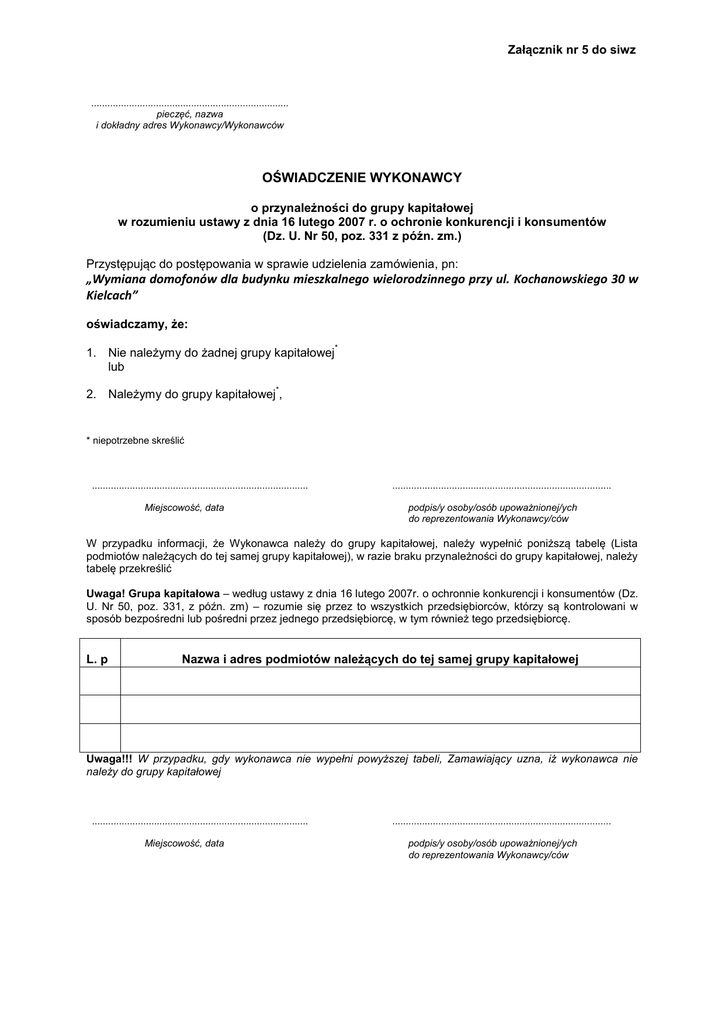 Załącznik nr 5 do siwz ......................................................................... pieczęć, nazwa i dokładny adres Wykonawcy/Wykonawców OŚWIADCZENIE WYKONAWCY o przynależności do grupy kapitałowej w rozumieniu ustawy z dnia 16 lutego 2007 r. o ochronie konkurencji i konsumentów (Dz. U. Nr 50, poz. 331 z późn. zm.) Przystępując do postępowania w sprawie udzielenia zamówienia, pn: „Wymiana domofonów dla budynku mieszkalnego wielorodzinnego przy ul. Kochanowskiego 30 w Kielcach” oświadczamy, że: 1. Nie należymy do żadnej grupy kapitałowej lub * * 2. Należymy do grupy kapitałowej , * niepotrzebne skreślić ................................................................................ Miejscowość, data ................................................................................. podpis/y osoby/osób upoważnionej/ych do reprezentowania Wykonawcy/ców W przypadku informacji, że Wykonawca należy do grupy kapitałowej, należy wypełnić poniższą tabelę (Lista podmiotów należących do tej samej grupy kapitałowej), w razie braku przynależności do grupy kapitałowej, należy tabelę przekreślić Uwaga! Grupa kapitałowa – według ustawy z dnia 16 lutego 2007r. o ochronnie konkurencji i konsumentów (Dz. U. Nr 50, poz. 331, z późn. zm) – rozumie się przez to wszystkich przedsiębiorców, którzy są kontrolowani w sposób bezpośredni lub pośredni przez jednego przedsiębiorcę, w tym również tego przedsiębiorcę. L. p Nazwa i adres podmiotów należących do tej samej grupy kapitałowej Uwaga!!! W przypadku, gdy wykonawca nie wypełni powyższej tabeli, Zamawiający uzna, iż wykonawca nie należy do grupy kapitałowej ................................................................................ Miejscowość, data ................................................................................. podpis/y osoby/osób upoważnionej/ych do reprezentowania Wykonawcy/ców