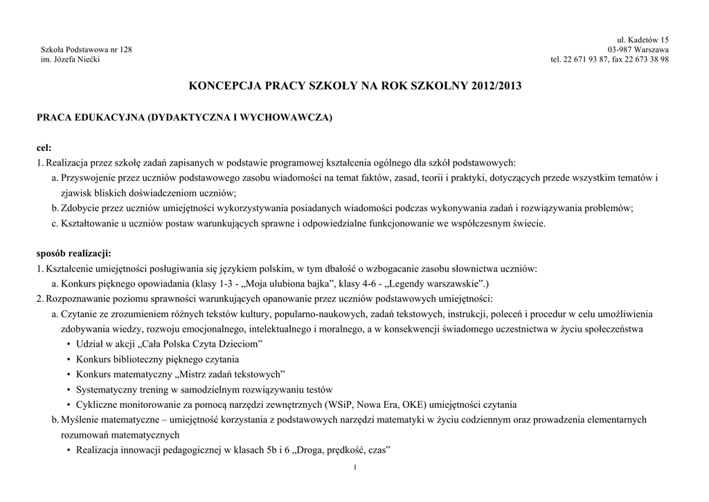 ul. Kadetów 15 03-987 Warszawa tel. 22 671 93 87, fax 22 673 38 98 Szkoła Podstawowa nr 128 im. Józefa Niećki KONCEPCJA PRACY SZKOŁY NA ROK SZKOLNY 2012/2013 PRACA EDUKACYJNA (DYDAKTYCZNA I WYCHOWAWCZA) cel: 1. Realizacja przez szkołę zadań zapisanych w podstawie programowej kształcenia ogólnego dla szkół podstawowych: a. Przyswojenie przez uczniów podstawowego zasobu wiadomości na temat faktów, zasad, teorii i praktyki, dotyczących przede wszystkim tematów i zjawisk bliskich doświadczeniom uczniów; b. Zdobycie przez uczniów umiejętności wykorzystywania posiadanych wiadomości podczas wykonywania zadań i rozwiązywania problemów; c. Kształtowanie u uczniów postaw warunkujących sprawne i odpowiedzialne funkcjonowanie we współczesnym świecie. sposób realizacji: 1. Kształcenie umiejętności posługiwania się językiem polskim, w tym dbałość o wzbogacanie zasobu słownictwa uczniów: a. Konkurs pięknego opowiadania (klasy 1-3 - „Moja ulubiona bajka”, klasy 4-6 - „Legendy warszawskie”.) 2. Rozpoznawanie poziomu sprawności warunkujących opanowanie przez uczniów podstawowych umiejętności: a. Czytanie ze zrozumieniem różnych tekstów kultury, popularno-naukowych, zadań tekstowych, instrukcji, poleceń i procedur w celu umożliwienia zdobywania wiedzy, rozwoju emocjonalnego, intelektualnego i moralnego, a w konsekwencji świadomego uczestnictwa w życiu społeczeństwa • Udział w akcji „Cała Polska Czyta Dzieciom” • Konkurs biblioteczny pięknego czytania • Konkurs matematyczny „Mistrz zadań tekstowych” • Systematyczny trening w samodzielnym rozwiązywaniu testów • Cykliczne monitorowanie za pomocą narzędzi zewnętrznych (WSiP, Nowa Era, OKE) umiejętności czytania b. Myślenie matematyczne – umiejętność korzystania z podstawowych narzędzi matematyki w życiu codziennym oraz prowadzenia elementarnych rozumowań matematycznych • Realizacja innowacji pedagogicznej w klasach 5b i 6 „Droga, prędkość, czas” 1 ul. Kadetów 15 03-987 Warszawa tel. 22 671 93 87, fax 22 673 38 98 Szkoła Podstawowa nr 128 im. Józefa Niećki • Udział uczniów w międzynarodowym konkursie matematycznym „Kangur”, „Kangurek” d. Myślenie naukowe – umiejętność formułowania wniosków opartych na obserwacjach empirycznych dotyczących przyrody i społeczeństwa • Realizacja w klasach edukacji wczesnoszkolnej projektu „Indywidualizacja procesu nauczania i wychowania uczniów klas I-III szkół podstawowych”, • Udział w konkursie Świetlik, • Udział w mazowieckich, kuratoryjnych konkursach przedmiotowych (humanistycznym, matematycznym, przyrodniczym i informatycznym) e. Umiejętność komunikowania się w języku ojczystym i w języku obcym, zarówno w mowie, jak i w piśmie • Realizacja w klasach 4-6 projektu „Nasze wakacyjne podróże” • Realizacja projektu eTwinning „Ja w różnych językach” f. Umiejętność posługiwania się nowoczesnymi technologiami informacyjno-komunikacyjnymi, w tym także dla wyszukiwania i korzystania z informacji • Realizacja zadań i inicjatyw wynikających z udziału w programie Szkoła z klasą 2.0. • Udział uczniów w międzynarodowym konkursie informatycznym „Bóbr” • Realizacja zadań i inicjatyw wynikających z udziału w Ogólnopolskim Programie Edukacyjnym „Twoje dane-twoja sprawa - Skuteczna ochrona danych osobowych - inicjatywa edukacyjna skierowana do uczniów i nauczycieli” g. Umiejętność uczenia się jako sposób zaspokajania naturalnej ciekawości świata, odkrywania swoich zainteresowań i przygotowania do dalszej edukacji • Realizacja konkurów szkolnych i pozaszkolnych • Stworzenie szerokiej oferty kół zainteresowań h. Umiejętność pracy zespołowej • Realizacja projektu „ABC dobrego wychowania” (zachowanie w pracowni komputerowej, zasady netykiety i publikowania materiałów w Internecie, zachowanie przy stole i w stołówce szkolnej, zachowanie w muzeum, w środowisku przyrodniczym, w szkole, podczas wycieczek, w teatrze) 2 ul. Kadetów 15 03-987 Warszawa tel. 22 671 93 87, fax 22 673 38 98 Szkoła Podstawowa nr 128 im. Józefa Niećki 3. Edukacja medialna: a. Stworzenie warunków do nabywania umiejętności wyszukiwania, porządkowania i wykorzystywania informacji z różnych źródeł z zastosowaniem technik informacyjno-komunikacyjnych na zajęciach z różnych przedmiotów • Realizacja w klasach 4-6 projektu „Nasze wakacyjne podróże” b. Wychowanie ucznia do właściwego odbioru i wykorzystywania mediów • Realizacja zadań i inicjatyw wynikających z udziału w programie Szkoła z klasą 2.0. (modyfikacja Kodeksu 2.0.) • Wycieczka do Telewizji • Korzystanie ze zbiorów biblioteki szkolnej - księgozbioru i zasobów multimedialnych, • Lekcje biblioteczne • Konkurs biblioteczny ze znajomości lektur d. Wykorzystywanie zasobów pracowni informatycznych i Szkolnego Multimedialnego Centrum Informacyjnego w celu przygotowania do zajęć uczniów i nauczycieli 4. Zwrócenie uwagi na efektywność kształcenia w zakresie nauk przyrodniczych i ścisłych zgodnie z priorytetami strategii lizbońskiej a. Realizacja innowacji pedagogicznej „Droga, prędkość, czas” b. Udział uczniów w konkursie Świetlik 5. Działanie w zakresie integracji międzyprzedmiotowej: a. opracowanie scenariuszy zajęć b. sprawdzianów c. konkursów szkolnych d. tworzenie banku narzędzi diagnostycznych e. oddziaływanie w zakresie zespołów przedmiotowych 6. Kontynuowanie działań zmierzających do poprawy efektywności kształcenia poprzez analizę wyników egzaminów zewnętrznych i wykorzystanie wniosków z tej analizy a. Cykliczne monitorowanie za pomocą narzędzi zewnętrznych (WSiP, Nowa Era, OKE), diagnoza poziomu umiejętności uczniów, analiza wyników, podjęcie programów naprawczych 3 ul. Kadetów 15 03-987 Warszawa tel. 22 671 93 87, fax 22 673 38 98 Szkoła Podstawowa nr 128 im. Józefa Niećki 7. Kszta