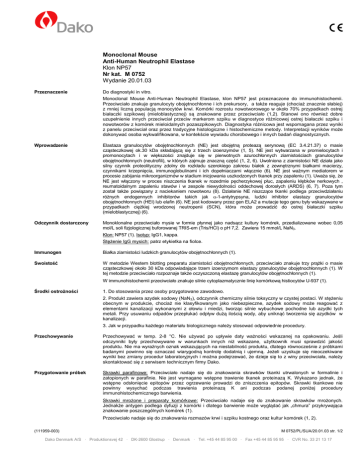 Monoclonal Mouse Anti-Human Neutrophil Elastase Klon NP57 Nr kat. M 0752 Wydanie 20.01.03 Przeznaczenie Do diagnostyki in vitro. Monoclonal Mouse Anti-Human Neutrophil Elastase, klon NP57 jest przeznaczone do immunohistochemii. Przeciwciało znakuje granulocyty obojętnochłonne i ich prekursory, a także reaguje (chociaż znacznie słabiej) z mniej liczną populacją monocytów krwi. Komórki rozrostu nowotworowego w około 70% przypadkach ostrej białaczki szpikowej (mieloblastycznej) są znakowane przez przeciwciało (1,2). Stanowi ono również dobre uzupełnienie innych przeciwciał przeciw markerom szpiku w diagnostyce różnicowej ostrej białaczki szpiku i nowotworów z komórek mieloidalnych pozaszpikowych. Diagnostyka różnicowa jest wspomagana przez wyniki z panelu przeciwciał oraz przez tradycyjne histologiczne i histochemiczne metody. Interpretacji wyników może dokonywać osoba wykwalifikowana, w kontekście wywiadu chorobowego i innych badań diagnostycznych. Wprowadzenie Elastaza granulocytów obojętnochłonnych (NE) jest obojętną proteazą serynową (EC 3.4.21.37) o masie cząsteczkowej ok.30 kDa składającą się z trzech izoenzymów (1, 5). NE jest wytwarzana w promielocytach i promonocytach i w większości znajduje się w pierwotnych azurochłonnych ziarnistościach granulocytów obojętnochłonnych (neutrofili), w których zajmuje znaczną część (1, 2, 6). Uwolniona z ziarnistości NE działa jako silny czynnik proteolityczny zdolny do rozkładu szerokiego zakresu białek z zewnętrznymi białkami macierzy, czynnikami krzepnięcia, immunoglobulinami i ich dopełniaczami włącznie (6). NE jest ważnym mediatorem w procesie zabijania mikroorganizmów w stadium inicjowania uszkodzonych tkanek przy zapaleniu (1). Uważa się, że NE jest włączony w proces niszczenia tkanek w rozedmie pęcherzykowej płuc, zapaleniu kłębków nerkowych , reumatoidalnym zapaleniu stawów i w zespole niewydolności oddechowej dorosłych (ARDS) (6, 7). Poza tym został także powiązany z naciekaniem nowotworu (8). Działanie NE niszczące tkanki podlega przeciwdziałaniu różnych endogennych inhibitorów takich jak -1-antytrypsyna, ludzki inhibitor elastazy granulocytów obojętnochłonnych (HEI) lub elafin (6). NE jest kodowany przez gen ELA2 a mutacje tego genu były wskazywane w przypadkach ciężkiej wrodzonej neutropenii (SCN), która może prowadzić do ostrej białaczki szpiku (mieloblastycznej) (6). Odczynnik dostarczony Monoklonalne przeciwciało mysie w formie płynnej jako nadsącz kultury komórek, przedializowane wobec 0,05 mol/L soli fizjologicznej buforowanej TRIS-em (Tris/HCl) o pH 7,2. Zawiera 15 mmol/L NaN3. Klon: NP57 (1). Isotyp: IgG1, kappa. Stężenie IgG mysich: patrz etykietka na fiolce. Immunogen Białka ziarnistości ludzkich granulocytów obojętnochłonnych (1). Swoistość W metodzie Western blotting preparatu ziarnistości obojętnochłonnych, przeciwciało znakuje trzy prążki o masie cząsteczkowej około 30 kDa odpowiadające trzem izoenzymom elastazy granulocytów obojętnochłonnych (1). W tej metodzie przeciwciało rozpoznaje także oczyszczoną elastazę granulocytów obojętnochłonnych (1). W immunohistochemii przeciwciało znakuje silnie cytoplazmatycznie linię komórkową histiocytów U-937 (1). Środki ostrożności 1. Do stosowania przez osoby przygotowane zawodowo. 2. Produkt zawiera azydek sodowy (NaN3), odczynnik chemiczny silnie toksyczny w czystej postaci. W stężeniu obecnym w produkcie, chociaż nie klasyfikowanym jako niebezpieczne, azydek sodowy może reagować z elementami kanalizacji wykonanymi z ołowiu i miedzi, tworząc silnie wybuchowe pochodne lub azydki tych metali. Przy usuwaniu odpadów przepłukać odpływ dużą ilością wody, aby uniknąć tworzenia się azydków w kanalizacji. 3. Jak w przypadku każdego materiału biologicznego należy stosować odpowiednie procedury. Przechowywanie Przechowywać w temp. 2-8 °C. Nie używać po upływie daty ważności wskazanej na opakowaniu. Jeśli odczynniki były przechowywane w warunkach innych niż wskazane, użytkownik musi sprawdzić jakość produktu. Nie ma wyraźnych oznak wskazujących na niestabilność produktu, dlatego równocześnie z próbkami badanymi powinno się oznaczać wiarygodną kontrolę dodatnią i ujemną. Jeżeli uzyskuje się nieoczekiwane wyniki bez zmiany procedur laboratoryjnych i można podejrzewać, że dzieje się to z winy przeciwciała, należy skontaktować się z serwisem technicznym firmy Dako. Przygotowanie próbek Skrawki parafinowe: Przeciwciało nadaje się do znakowania skrawków tkanki utrwalonych w formalinie i zatopionych w parafinie. Nie jest wymagane wstępne trawienie tkanek proteinazą K. Wykazano jednak, że wstępne odsłonięcie epitopów przez ogrzewanie prowadzi do zniszczenia epitopów. Skrawki tkankowe nie powinny wysychać podczas trawienia proteinazą K ani podczas podanej poniżej procedury immunohistochemicznego barwienia. Skrawki mrożone i preparaty komórkowe: Przeciwciało nadaje się do znakowanie skrawków mrożonych. Jednakże antygen podlega dyfuzji z komórki i dlatego barwienie może wyglądać jak „chmura” przykrywająca znakowanie poszczególnych komórek (1). Przeciwciało nadaje się do znakowania rozmazów krwi i szpiku kostnego oraz kultur komórek (1, 2). (111959-003) M 0752/PL/SUA/20.01.03 str. 1/2 Dako Denmark A/S · Produktionsvej 42 · DK-2600 Glostrup · Denmark · Tel. +45 44 85 95 00 · Fax +45 44 85 95 95 · CVR No. 33 21 13 17 Procedura barwienia Rozcieńczenie: Monoclonal Mouse Anti-Human Neutrophil Elastase, nr kat. M 0752 może być używane w zakresie rozcieńczeń 1:100-1:200, gdy stosuje się go na skrawki migdałków utrwalane formaliną i zatapiane w parafinie, po 30 min. inkubacji z pierwotnym przeciwciałem w temperaturze pokojowej. Optymalne warunki mogą się różnić zależnie od próbki i metod jej przygotowania, i powinny zostać dobrane w każdym laboratorium. Z
