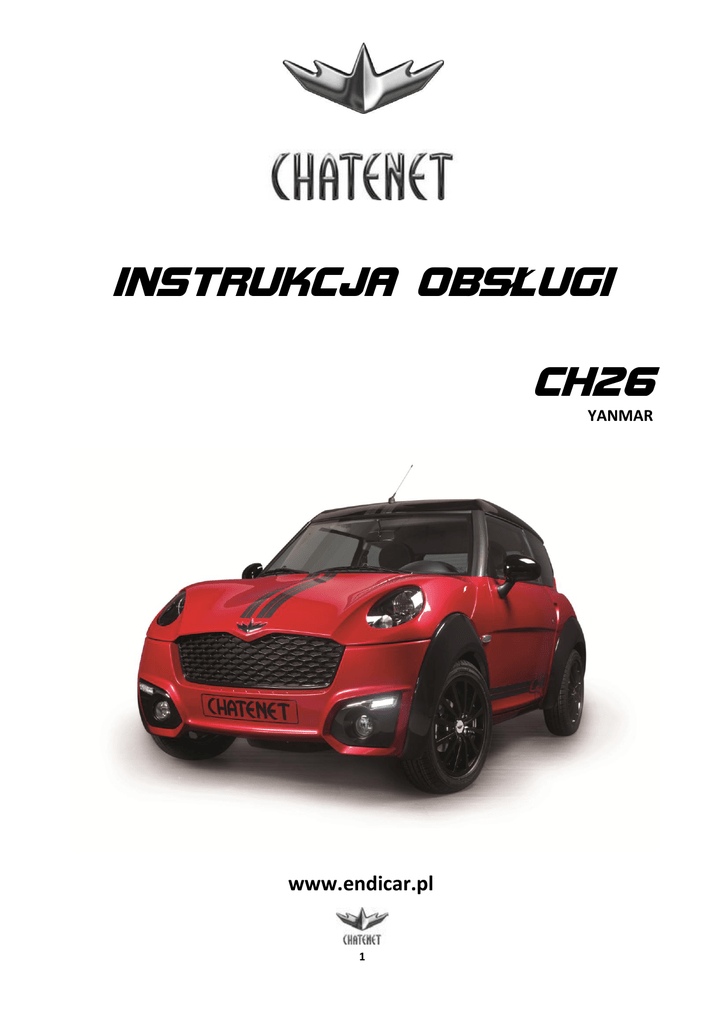 INSTRUKCJA OBSŁUGI CH26 YANMAR www.endicar.pl 1 Wszystkie prawa zastrzeżone. Tekst, rysunki, zdjęcia oraz wszystkie inne informacje opublikowane w niniejszej instrukcji podlegają prawom autorskim firmy APP sp. z o.o. Wszelkie kopiowanie, dystrybucja, elektroniczne przetwarzanie oraz przesyłanie zawartości bez zezwolenia firmy APP sp. z o.o. jest zabronione. 2 Witamy w gronie użytkowników CH26! Dziękujemy za zaufanie, jakim nas Państwo obdarzyliście. Nasz zespół chcąc zapewnić Państwu pełnię satysfakcji dołożył wszelkich starań podczas procesu projektowania i produkcji pojazdu Chatenet CH26. Niniejsza instrukcja obsługi i konserwacji zawiera cenne dla Państwa informacje, dzięki którym poznacie swój nowy pojazd, co umożliwi wykorzystanie w optymalny sposób zastosowanych w nim rozwiązań konstrukcyjnych, a także poprzez przestrzeganie zaleceń dotyczących obsługi, zapewni najlepsze warunki eksploatacji. Prosimy o zapoznanie się z niniejszą instrukcją przed pierwszym uruchomieniem pojazdu i życzymy udanej eksploatacji nowego modelu Chatenet. Model CH26 jest pojazdem klasy homologacyjnej L6e (czterokołowiec lekki) może być prowadzony przez użytkownika, który ukończył 14 lat. Warunkiem jest posiadanie prawa jazdy kategorii AM. Szerokiej drogi... życzy Louis Georges CHATENET oraz Zespół ENDICAR 3 ZALECENIA DOT. BEZPIECZEŃSTWA 4 Wymiany/Naprawy Paliwo/Olej Układ wydechowy Akumulator Identyfikacja pojazdu Docieranie pojazdu Konserwacja nadwozia 20 Sprawdzanie poziomów oleju, płynów i akumulatora olej w silniku płyn hamulcowy akumulator spryskiwacze Bezpieczniki Ogumienie Akumulator 21 21 21 21 22 22 24 Światła 24 Wymiary 24 Dane techniczne 25 Plan obsługi pojazdu 26 Płyny eksploatacyjne 26 WYPOSAŻENIE Otwieranie/Blokowanie/Odblokowywanie Regulacja siedzeń Pasy bezpieczeństwa Miejsce kierowcy Cyfrowa tablica rozdzielcza Regulacja zegara Licznik całkowitego lub częściowego przebiegu pojazdu Wskaźnik przeglądów okresowych Regulacja natężenia oświetlania wskaźników Oświetlenie wnętrza pojazdu Hamowanie awaryjne Lampki kontrolne na tablicy rozdzielczej Oświetlenie i sygnalizacja Wycieraczki, spryskiwacze Konsola środkowa Wentylacja/ogrzewanie/usuwanie zaparowania szyb Ogrzewanie tylnej szyby Uruchamianie pojazdu Dźwignia zmiany biegów Hamulec ręczny Wspomaganie przy parkowaniu 5 7 7 8 9 10 Akcesoria Lusterka wsteczne Lampka sufitowa Osłona przeciwsłoneczna Schowek (z przodu, po stronie pasażera) Schowki w drzwiach Popielniczka Bagażnik 17 10 11 11 11 11 12 13 13 14 15 15 16 16 17 17 4 ZALECENIA DOTYCZĄCE BEZPIECZEŃSTWA WYMIANY/NAPRAWY Wszelkie wymiany lub naprawy (w instalacji elektrycznej, silniku, układzie przeniesienia napędu, układzie hamulcowym, pasach bezpieczeństwa, nadwoziu...) muszą być wykonywane przez autoryzowaną stację obsługi pojazdów (ASO) marki CHATENET. PALIWO/OLEJ Paliwo i olej są substancjami wysoce łatwopalnymi. Nie wolno w ich pobliżu używać otwartego ognia ani stosować źródła silnego ciepła. Nie wolno tankować samochodu w pomieszczeniu zamkniętym. Podczas uzupełniania paliwa, silnik samochodu musi być wyłączony. Należy pamiętać, aby nie napełniać zbiornika „pod korek”. W przypadku rozlania paliwa/oleju w komorze silnika lub na układ wydechowy należy dokładnie wytrzeć wszystkie ślady substancji przed uruchomieniem pojazdu. Przed włączeniem silnika, należy również sprawdzić, czy wszystkie korki od zbiorników powróciły na swoje miejsca. Zaleca się regularne sprawdzanie poziomów (paliwa, oleju silnikowego). UKŁAD WYDECHOWY Spaliny są substancją szkodliwą, a nawet śmiertelną. Nie należy nigdy pozostawiać silnika na biegu w pomieszczeniu o słabej wentylacji. W przypadku, gdy tłumiki przestają pełnić swoją funkcję lub ulegną uszkodzeniu, należy je wymienić. AKUMULATOR Należy zachować ostrożność przy czynnościach związanych z akumulatorem, ponieważ zawiera on kwas. W przypadku wykonywania jakiejkolwiek czynności w elementach instalacji elektrycznej, należy bezwzględnie odłączyć przewód bieguna ujemnego akumulatora (masa). IDENTYFIKACJA POJAZDU Tabliczka znamionowa producenta Znajduje się na przegrodzie czołowej po lewej stronie. Numer podwozia VIN Jest wygrawerowany na aluminiowej ramie kratownicowej pod siedzeniem pasażera. DOCIERANIE POJAZDU Trwałość (żywotność) zakupionego pojazdu będzie zależeć od Państwa sposobu prowadzenia podczas pierwszych kilometrów. Przy pierwszym uruchomieniu pojazdu, należy powoli rozgrzewać silnik, unikając pełnego obciążania zimnego silnika. Podczas jazdy, od czasu do czasu należy zwalniać pedał przyspieszenia, zmniejszając prędkość obrotową silnika. W trakcie pierwszych 500km należy bezwzględnie unikać wciskania do oporu pedału przyśpieszenia przez dłuższy czas, bez przerwy. Konieczne jest wykonanie pierwszego przeglądu po przejechaniu 500 km w serwisie CHATENET (ASO) 5 OTWIERANIE/BLOKOWANIE/ODBLOKOWYWANIE Drzwi Zamek centralny Blokowanie i odblokowywanie drzwi odbywa się za pomocą pilota (patrz rysunek poniżej) lub, w razie potrzeby, od strony kierowcy - za pomocą kluczyka. Umożliwia blokowanie i odblokowywanie zamków drzwi i pokrywy bagażnika. rys. 1 Podczas otwierania drzwi, szyba opuszcza się automatycznie 5 cm, aby odsłonić uszczelkę drzwi. Podczas zamykania – szyba podnosi się z powrotem w górę, żeby zapewnić prawidłową szczelność drzwi. Pokrywa bagażnika Aby otworzyć bagażnik, należy odblokować zamek pokrywy tylnej za pomocą pilota (jeśli samochód jest zamknięty), a następnie wcisnąć stycznik zamka, który znajduje się pod przetłoczeniem po prawej stronie lampki oświetlenia rejestracji. Otwieranie od zewnątrz: aby otworzyć drzwi, należy pociągnąć za klamkę. Otwieranie od wewnątrz: drzwi otwierają się od wewnątrz za pomocą rączek umieszczonych nad podłokietnikami. Zabezpieczenie: gdy samochód osiąg