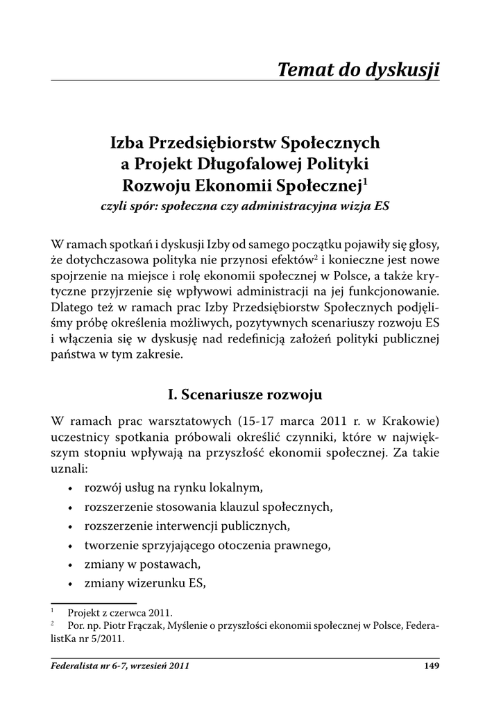 Temat do dyskusji Izba Przedsiębiorstw Społecznych a Projekt Długofalowej Polityki Rozwoju Ekonomii Społecznej1 czyli spór: społeczna czy administracyjna wizja ES W ramach spotkań i dyskusji Izby od samego początku pojawiły się głosy, że dotychczasowa polityka nie przynosi efektów2 i konieczne jest nowe spojrzenie na miejsce i rolę ekonomii społecznej w Polsce, a także krytyczne przyjrzenie się wpływowi administracji na jej funkcjonowanie. Dlatego też w ramach prac Izby Przedsiębiorstw Społecznych podjęliśmy próbę określenia możliwych, pozytywnych scenariuszy rozwoju ES i włączenia się w dyskusję nad redefinicją założeń polityki publicznej państwa w tym zakresie. I. Scenariusze rozwoju W ramach prac warsztatowych (15-17 marca 2011 r. w Krakowie) uczestnicy spotkania próbowali określić czynniki, które w największym stopniu wpływają na przyszłość ekonomii społecznej. Za takie uznali: • rozwój usług na rynku lokalnym, • rozszerzenie stosowania klauzul społecznych, • rozszerzenie interwencji publicznych, • tworzenie sprzyjającego otoczenia prawnego, • zmiany w postawach, • zmiany wizerunku ES, 1 Projekt z czerwca 2011. Por. np. Piotr Frączak, Myślenie o przyszłości ekonomii społecznej w Polsce, FederalistKa nr 5/2011. 2 Federalista nr 6-7, wrzesień 2011 149 • rozwój współpracy z samorządem, • rozwój współpracy wewnątrz sektora ES. Co ciekawe, uczestnicy zgodzili się, że • konsekwencje zmian prawa są w dużej mierze nieprzewidywalne, a proponowana ustawa o przedsiębiorczości społecznej może przynieść tyle pożytku, co szkody. Zgodzono się, że obecne prawo umożliwia działalność ES i że stabilne prawo (a nie ciągłe jego „ulepszania”) sprzyjać będzie rozwojowi przedsiębiorstw społecznych; • zmiany postaw, choć w zasadzie kluczowe, są też trudne do przewidzenia (zależą od wielu zmiennych) i zachodzą w dłuższym horyzoncie czasowowym (liczonym w dekadach). Dlatego też zdecydowano się nie dyskutować o otoczeniu prawnym i o zmianie postaw – jako drugorzędnych wobec tego, co można zrobić dla ekonomii społecznej tu i teraz. Ostatecznie wszystkie pozostałe czynniki zostały zgrupowane w trzy możliwe scenariusze, które wydają się być nadzieją polskiej ekonomii społecznej. Te trzy scenariusze zostały określone jako „lokalnie i społecznie”, „ekonomia społeczna na miarę” i „razem skuteczniej”. 150 Federalista nr 6-7, wrzesień 2011 Lokalnie i społecznie Ekonomia na miarę Razem skuteczniej Oparcie się na działaniach zakorzenionych w społeczności lokalnej i nastawienie na kwestie społeczne/aktywność lokalną/lokalny rynek wewnętrzny Opiarcie się na własnych usługach i produktach, odpowiadających potrzebom nabywców/odbiorców i możliwościom usługodawców/ wytwórców Oparcie się na partnerstwie i solidarności/zaufaniu jako sposobie zdobywania przewag rynkowych Główne czynniki: Rozwój usług na rynku lokalnym; Rozwój klauzul społecznych; Rozwój interwencji publicznych; Rozwój współpracy z samorządem; Rozwój działalności gospodarczej nastawionej na rozwiązywanie problemów (realizację celów społecznych) oraz wykorzystanie potencjału społeczności lokalnej. Główne czynniki: Zmiany wizerunku ES; Samoświadomość PES; Specjalizacja PES w określonych produktach/usługach; Wzmocnienie konkurencyjności świadczonych usług/produkowanych dóbr. Główne czynniki: Rozwój współpracy wewnątrz sektora ES; Umiejetność wykorzystywania „niekomercyjnych przewag rynkowych” i zasady pomocniczości do przejmowania nowych obszarów działania od samorządu i przedsiębiorstw. ES jest zakorzeniona lokalnie i chodzi tu nie tylko o obszar działania, ale przede wszystkim o źródło finansowania. To rozwój lokalnego popytu na usługi PES może się przyczynić do rzeczywistego rozwoju. ES jest zakładnikiem swoich produktów i usług, to od podaży (ilości i jakości) zależeć będzie jej przyszłość. Dobra usługa czy dobre przedmioty wyprodukowane w PES zadecydują o ich miejscu na rynku. ES jest w istocie próbą tworzenia enklaw gospodarki społecznej, gdzie obowiązują inne zasady funkcjonowania. Aby więc takie formy gospodarowania społecznego się rozwijały, potrzebne są wzajemne powiązania, sieci, współpraca. Wymaga to rzeczywistej zmiany podejścia (świadomości) na poziomie władz lokalnych, a nie narzucania rozwiązań. Świadomość instytucjonalnych zleceniodawców3 dokonujących ostatecznego wyboru produktu jest warunkiem rozwoju PES. Wymaga to rzeczywistej zmiany podejścia (świadomości) na poziomie przedsiębiorstw społecznych, a także społecznego odbioru samych przedsiębiorstw, jak i tego, co oferują. Wymaga to z jednej strony ilościowego rozwoju PES, z drugiej odmiennej od dotychczasowej filozofi działania, od mechanizmów konkurencji na rzecz współdziałania. 3 Oczywiście świadomość konsumentów indywidualnych też jest niesłychanie ważna, ale jej zmiana wiąże się w dużej mierze ze zmianami postaw, które prawdopodobnie nie wpłyną wyraźnie w krótkim okresie na rozwój ekonomii społecznej. Federalista nr 6-7, wrzesień 2011 151 Wyraźnie widać, że te trzy scenariusze – choć w zasadzie niesprzeczne – wymagają zmiany podejścia do ekonomii społecznej. Jednak ta zmiana dotyczy w różnych scenariuszach różnych interesariuszy. Konieczna jest zmiana ze strony samorządowców i administracji samorządowej, bo tylko w ten sposób może powstać znaczący popyt na usługi i produkty PES. Potrzebna jest zmiana także ze strony samych zainteresowanych, osób zaangażowanych w działalność przedsiębiorstw społecznych. Tu konieczne jest zwiększenie podaży usług i produktów odpowiadających na istniejące zapotrzebowanie. Możliwa jest także zmiana w całym sektorze ekonomii społecznej, która spowoduje, że podstawą sukcesów będzie nie jednostkowy sukces konkretn