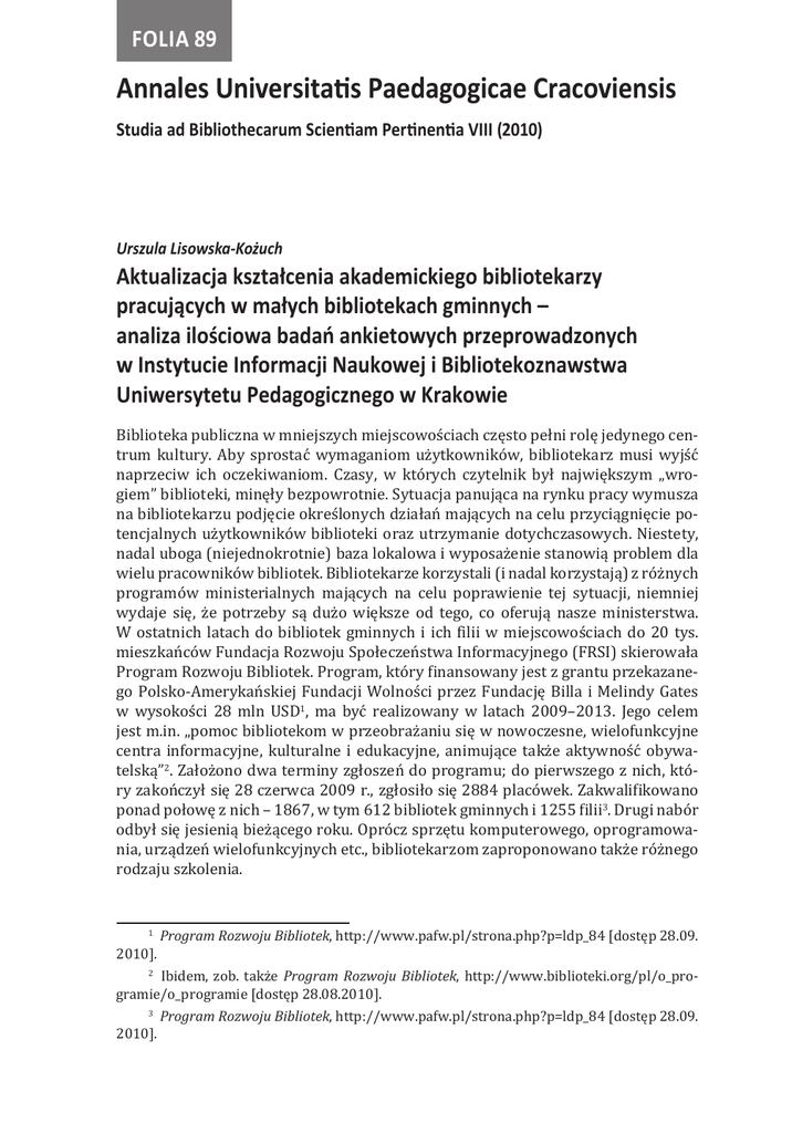 Folia 89 Annales Universitatis Paedagogicae Cracoviensis Studia ad Bibliothecarum Scientiam Pertinentia VIII (2010) Urszula Lisowska-Kożuch Aktualizacja kształcenia akademickiego bibliotekarzy pracujących w małych bibliotekach gminnych – analiza ilościowa badań ankietowych przeprowadzonych w Instytucie Informacji Naukowej i Bibliotekoznawstwa Uniwersytetu Pedagogicznego w Krakowie Biblioteka publiczna w mniejszych miejscowościach często pełni rolę jedynego centrum kultury. Aby sprostać wymaganiom użytkowników, bibliotekarz musi wyjść naprzeciw ich oczekiwaniom. Czasy, w których czytelnik był największym „wrogiem” biblioteki, minęły bezpowrotnie. Sytuacja panująca na rynku pracy wymusza na bibliotekarzu podjęcie określonych działań mających na celu przyciągnięcie potencjalnych użytkowników biblioteki oraz utrzymanie dotychczasowych. Niestety, nadal uboga (niejednokrotnie) baza lokalowa i wyposażenie stanowią problem dla wielu pracowników bibliotek. Bibliotekarze korzystali (i nadal korzystają) z różnych programów ministerialnych mających na celu poprawienie tej sytuacji, niemniej wydaje się, że potrzeby są dużo większe od tego, co oferują nasze ministerstwa. W ostatnich latach do bibliotek gminnych i ich filii w miejscowościach do 20 tys. mieszkańców Fundacja Rozwoju Społeczeństwa Informacyjnego (FRSI) skierowała Program Rozwoju Bibliotek. Program, który finansowany jest z grantu przekazanego Polsko-Amerykańskiej Fundacji Wolności przez Fundację Billa i Melindy Gates w wysokości 28 mln USD1, ma być realizowany w latach 2009–2013. Jego celem jest m.in. „pomoc bibliotekom w przeobrażaniu się w nowoczesne, wielofunkcyjne centra informacyjne, kulturalne i edukacyjne, animujące także aktywność obywatelską”2. Założono dwa terminy zgłoszeń do programu; do pierwszego z nich, który zakończył się 28 czerwca 2009 r., zgłosiło się 2884 placówek. Zakwalifikowano ponad połowę z nich – 1867, w tym 612 bibliotek gminnych i 1255 filii3. Drugi nabór odbył się jesienią bieżącego roku. Oprócz sprzętu komputerowego, oprogramowania, urządzeń wielofunkcyjnych etc., bibliotekarzom zaproponowano także różnego rodzaju szkolenia. 1 2010]. Program Rozwoju Bibliotek, http://www.pafw.pl/strona.php?p=ldp_84 [dostęp 28.09. 2 Ibidem, zob. także Program Rozwoju Bibliotek, http://www.biblioteki.org/pl/o_programie/o_programie [dostęp 28.08.2010]. 3 2010]. Program Rozwoju Bibliotek, http://www.pafw.pl/strona.php?p=ldp_84 [dostęp 28.09. [52] Urszula Lisowska-Kożuch W związku z potrzebą doskonalenia zawodowego tej grupy i organizowanymi przez FRSI szkoleniami nasuwa się pytanie o poziom wykształcenia polskich bibliotekarzy. Według danych Głównego Urzędu Statystycznego za 2009 r., opracowanych przez Instytut Książki i Czytelnictwa Biblioteki Narodowej, obecnie na 18 446 pracowników bibliotek przypada tylko 6793 (36,8%) z wyższym wykształceniem bibliotekarskim. Na wsi sytuacja wygląda o wiele gorzej: jedynie 1491 (22,68%) posiada wykształcenie wyższe bibliotekarskie na 6574 zatrudnionych4. Jest to olbrzymi rynek, który otwiera się przed uczelniami kształcącymi potencjalnych bibliotekarzy. Po podpisaniu w 2009 r. umowy z FRSI, która finansuje całość prac projektowych, z propozycją aktualizacji kształcenia akademickiego bibliotekarzy pracujących w małych bibliotekach gminnych wystąpiło Polskie Towarzystwo Bibliologiczne (PTB) – Oddział Warszawski5. Istotą projektu jest zwrócenie uwagi na potrzeby bibliotekarzy z małych bibliotek publicznych i wprowadzenie pewnych zmian w dydaktyce na poziomie akademickim, tak, aby w programach studiów w większym stopniu uwzględnić problematykę lokalnych bibliotek publicznych6. W styczniu ubiegłego roku program „Aktualizacja kształcenia akademickiego bibliotekarzy pracujących w małych bibliotekach gminnych” został zaprezentowany dyrektorom i przedstawicielom 9 ośrodków kształcących w zakresie informacji naukowej i bibliotekoznawstwa: Instytutu Bibliotekoznawstwa i Informacji Naukowej Uniwersytetu Śląskiego w Katowicach, Instytutu Bibliotekoznawstwa i Dziennikarstwa Uniwersytetu Humanistyczno-Przyrodniczego w Kielcach, Instytutu Informacji Naukowej i Bibliotekoznawstwa Uniwersytetu Jagiellońskiego, Instytutu Informacji Naukowej i Bibliotekoznawstwa Uniwersytetu Pedagogicznego w Krakowie, Instytutu Bibliotekoznawstwa i Informacji Naukowej Uniwersytetu Marii Curie-Skłodowskiej w Lublinie, Katedry Bibliotekoznawstwa i Informacji Naukowej Uniwersytetu Łódzkiego, Instytutu Informacji Naukowej i Bibliologii Uniwersytetu Mikołaja Kopernika w Toruniu, Instytutu Informacji Naukowej i Studiów Bibliologicznych Uniwersytetu Warszawskiego oraz Instytutu Informacji Naukowej i Bibliotekoznawstwa Uniwersytetu Wrocławskiego7. Jednym z etapów projektu było przeprowadzenie badań ankietowych wśród studentów oraz bibliotekarzy zatrudnionych w bibliotekach gminnych. Wspomniane badania przeprowadzono w 9 wyżej wymienionych ośrodkach zajmujących się kształceniem w zakresie informacji naukowej i bibliotekoznawstwa. Kwestionariusz ankiety został opracowany przez członków PTB – Oddziału Warszawskiego. 4 Zestawienie zbiorcze o stanie i działalności sieci bibliotek publicznych w 2009 r., http:// www.bn.org.pl/download/document/1276694463.pdf [dostęp 28.08.2010]. 5 M. Ochmański, Aktualizacja kształcenia akademickiego bibliotekarzy pracujących w małych bibliotekach gminnych: opis projektu, [w:] Aktualizacja kształcenia akademickiego bibliotekarzy pracujących w małych bibliotekach gminnych, red. E. Chuchro, M. Ochmański i M. Zając, Warszawa 2010, s. 99–108. 6 7 Ibidem, s. 99. Ibidem, s. 99–108. Aktualizacja kształcenia akademickiego bibliotekarzy pracujących w małych bibliotekach... [53] Celem autorki niniejszego artykułu jest zaprezentowanie wyników uzyskanych na studiach licencjackich i magisterskich w Instytucie Informacj
