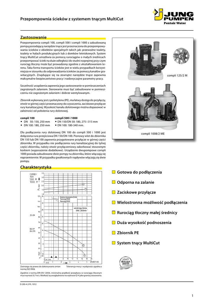 Przepompownia ścieków z systemem tnącym MultiCut Zastosowanie Przepompownia compli 100, compli 500 i compli 1000 z zabudowaną pompą posiadającą narzędzie tnące jest przeznaczona do przepompowywania ścieków z obiektów specjalnych takich jak: przewoźne toalety, toalety w halach produkcyjnych lub z domków letniskowych. System tnący MultiCut umożliwia za pomocą rurociągów o małych średnicach przepompować ścieki na duże odległości do studni rozprężnej przy czym rurociąg tłoczny może być prowadzony zgodnie z ukształtowaniem terenu. Taka forma transportu ścieków jest w wielu przypadkach korzystniejsza w stosunku do odprowadzania ścieków za pomocą kanałów grawitacyjnych. Znajdujące się na zewnątrz narzędzie tnące zapewnia maksymalne bezpieczeństwo pracy i nadzwyczajne parametry pracy. compli 125/2 M Szczelność urządzenia zapewnia jego zastosowanie w pomieszczeniach zagrożonych zalaniem. Sterowanie musi być zabudowane w pomieszczeniu nie zagrożonym zalaniem i dobrze wentylowanym. Zbiornik wykonany jest z polietylenu (PE), ma łatwy dostęp do przyłączy, otwór w górnej części przeznaczony do czyszczenia, zaciskowe przyłącze rury kanalizacyjnej. Wysokość kanału dolotowego można dopasować w zależności od położenia rury dolotowej. compli 100 • DN 50: 150, 250 mm • DN 100: 180, 250 mm compli 500 i 1000 • DN 150/DN 50: 180, 275 i 315 mm • DN 100: 180-340 mm. Dla podłączenia rury dolotowej DN 100 do compli 500 i 1000 jest dołączona rura przejściowa DN 150/DN 100. Pionowy wlot do zbiornika DN 150 lub DN 100 zapewnia przygotowane przyłącze w górnej części zbiornika. W przypadku nie podłączenia rury kanalizacyjnej do tylnej części zbiornika, należy otwór przyłączeniowy zakorkować stosownym korkiem (wyposażenie dodatkowe). Urządzenie dwupompowe compli 1000 posiada zabudowane dwie pompy na zbiorniku, które włączają się naprzemiennie. W przypadku gwałtownych napływów włączają się dwie pompy. Charakterystyka compli 1008/2 ME Gotowa do podłączenia Odporna na zalanie Zaciskowe przyłącze Granica stosowania Q min. Rurociąg DN40 Rurociąg DN50 Wielostronna możliwość podłączenia wirnik typu Vortex 50Hz 2850min -1 Rurociąg tłoczny małej średnicy Duża wysokość podnoszenia Zbiornik PE System tnący MultiCut 25407-05 Zastrzega się prawo do dokonywania zmian normą ISO 9906 Tolerancja mocy i wydajności zgodna z Zgodnie z normą DIN EN 12056, minimalna prędkość przepływu w rurociągu tłocznym musi wynosić 0,7 m/s. Wielkość tą uwzględniono na wykresie Q-H jako granicę stosowania. D 205-4.3 205–4.0-1001 D PL 1012 1 Przepompownia ścieków z systemem tnącym MultiCut Przepompownie ścieków Typ Pojemność Wysokość Przelot zbiornika dopływu compli 108/2 ME compli 108/2 M compli 125/2 M compli 508/2 ME compli 508/2 M compli 525/2 M compli 1008/2 ME compli 1008/2 M compli 1025/2 M 38 38 38 115 115 115 115 115 115 180/250 180/250 180/250 zmienna zmienna zmienna zmienna zmienna zmienna 7 mm 7 mm 7 mm 7 mm 7 mm 7 mm 7 mm 7 mm 7 mm Kołnierz zaciskowy na dolocie DN 100 DN 100 DN 100 DN 150 DN 150 DN 150 DN 150 DN 150 DN 150 Przyłącze Zewnętrzna Wentylacja tłoczne średnica rury Ciężar DN 50 DN 50 DN 50 DN 40 DN 40 DN 40 DN 40 DN 40 DN 40 41,0 kg 35,5 kg 46,5 kg 60,0 kg 60,0 kg 65,0 kg 115,0 kg 115,0 kg 125,0 kg 63 mm 63 mm 63 mm 50 mm 50 mm 50 mm 50 mm 50 mm 50 mm DN 70 DN 70 DN 70 DN 70 DN 70 DN 70 DN 70 DN 70 DN 70 Art.-Nr. JP 09347 JP 09346 JP 09877 JP 43128 JP 43129 JP 43130 JP 43131 JP 43132 JP 43133 Moc Typ compli ...08/2 M E compli ...08/2 M compli ...25/2 M Wysokość tłoczenia H [m] Wydajność Q [m3/h] 2 17 17 4 6 8 10 12 16 14 12 9 7 16 14 12 9 7 16 14 12 14 16 18 20 22 24 26 28 30 4 4 10 8 5 3 32 34 Dane elektryczne Typ Rodzaj prądu Napięcie Volt Moc kW P1 P2 Prąd [A] compli ...08/2 ME compli ...08/2 M compli ...25/2 M W-Strom D-Strom D-Strom 1/N/PE∼230 3/N/PE∼400 3/N/PE∼400 1,70 1,65 2,30 7,5 2,8 3,9 Przepompownie fekaliów należy stosować w systemie odwadniania budynków, zgodnie z normą DIN EN 122050 o pompowaniu fekaliów i ściekow domowych i zgodnie z opisem w normie DIN 1986 T3. Należy je zabudowywać zgodnie z normą DIN EN 12056-4 ze zbiornikiem kolektorowym wewnątrz budynku, zachowując 60 cm odstępu od ścian w celach obsługi i konserwacji. W rurociągu ciśnieniowym, należy zamontować klapę zwrotną, sprawdzoną zgodnie z normą DIN EN 12050-4. Przewód wentylacyjny należy wyprowadzić na dach, zgodnie z normą DIN EN 12056. Dalsze wymogi normy DIN EN 12056-4 ust. 5.1 i 5.2: - studzienka do odwadniania pomieszczenia - zasuwa do wody zanieczyszczonej po stronie tłocznej - zasuwa do wody zanieczyszczonej po stronie dopływu - przepompownie należy montować w sposób zabezpieczający przed siłą wyporu Zastosowanie w ciśnieniowych systemach kanalizacyjnych: W przypadku zastosowania Compli w ciśnieniowych systemach kanalizacyjnych, zgodnie z normą DIN EN 1671, należy w rurociągu tłocznym zamontować dodatkowo klapę zwrotną PN 6 i zasuwę systemową PN 16. 2 1,14 1,24 1,85 Przewód (4 m) Zbiornik sterownik H 07 RN-F-5 G 1,5 H 07 RN-F-5 G 1,5 H 07 RN-F-6 G 1,5 Przewód (1,5 m) Sterownik wtyczka H 05 VV-F-3 G 1,5 H 05 VV-F-5 G 1,5 H 05 VV-F-5 G 1,5 Wtyczka SchukoCEECEE- Przepompownia ścieków z systemem tnącym MultiCut Przykład zabudowy compli 100 Przyłącze ciśnieniowe Rurociąg ciśnieniowy Odpowietrzenie Rurociąg do compli Dodatkowy dopływ 40158-01 Osprzęt compli 100 Nr art. 1 Akumulator do sterownika do instalacji alarmowej niezależnej od sieci JP 07562 2 Urządzenie do kontroli szczelności DKG JP 00252 3 Zasuwa dopływowa PVC (z króćcem rurowym) dla dopływu 4 cale (DN 100), PN 1 4 Mufa redukcyjna 1¼“–2“ 5 Klapa zwrotna R 50 2” (DN 50), PN 4, DIN EN 12050-4 H 150 B 120 D 2“ JP 00326 Zawór zwrotny kulowy K 50 2” (DN 50), PN 16, DIN EN 12050-4 H 185 B 150 D 2” JP 09857 6 Zasuwa odcinająca 2” (DN 50), 