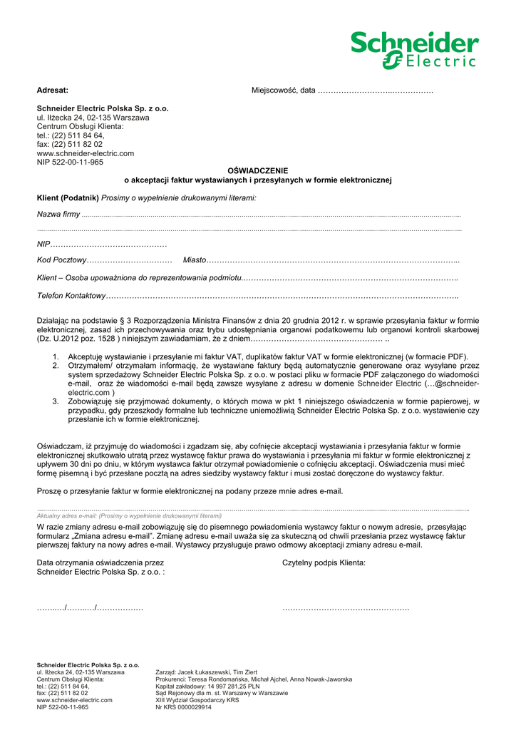 Adresat: Miejscowość, data ………………………..……………. Schneider Electric Polska Sp. z o.o. ul. IłŜecka 24, 02-135 Warszawa Centrum Obsługi Klienta: tel.: (22) 511 84 64, fax: (22) 511 82 02 www.schneider-electric.com NIP 522-00-11-965 OŚWIADCZENIE o akceptacji faktur wystawianych i przesyłanych w formie elektronicznej Klient (Podatnik) Prosimy o wypełnienie drukowanymi literami: Nazwa firmy …………………………………………………………………………………………………………………………………………………………………….. ………………………………………………………………………………………………………………………………………………………………………………………… NIP……………………………………… Kod Pocztowy…………………………… Miasto…………………………………………………………………………………….. Klient – Osoba upowaŜniona do reprezentowania podmiotu..………………………………………………………………………. Telefon Kontaktowy………………………………………………………………………………………………………………………. Działając na podstawie § 3 Rozporządzenia Ministra Finansów z dnia 20 grudnia 2012 r. w sprawie przesyłania faktur w formie elektronicznej, zasad ich przechowywania oraz trybu udostępniania organowi podatkowemu lub organowi kontroli skarbowej (Dz. U.2012 poz. 1528 ) niniejszym zawiadamiam, Ŝe z dniem…………………………………………… .. 1. 2. 3. Akceptuję wystawianie i przesyłanie mi faktur VAT, duplikatów faktur VAT w formie elektronicznej (w formacie PDF). Otrzymałem/ otrzymałam informację, Ŝe wystawiane faktury będą automatycznie generowane oraz wysyłane przez system sprzedaŜowy Schneider Electric Polska Sp. z o.o. w postaci pliku w formacie PDF załączonego do wiadomości e-mail, oraz Ŝe wiadomości e-mail będą zawsze wysyłane z adresu w domenie Schneider Electric (…@schneiderelectric.com ) Zobowiązuję się przyjmować dokumenty, o których mowa w pkt 1 niniejszego oświadczenia w formie papierowej, w przypadku, gdy przeszkody formalne lub techniczne uniemoŜliwią Schneider Electric Polska Sp. z o.o. wystawienie czy przesłanie ich w formie elektronicznej. Oświadczam, iŜ przyjmuję do wiadomości i zgadzam się, aby cofnięcie akceptacji wystawiania i przesyłania faktur w formie elektronicznej skutkowało utratą przez wystawcę faktur prawa do wystawiania i przesyłania mi faktur w formie elektronicznej z upływem 30 dni po dniu, w którym wystawca faktur otrzymał powiadomienie o cofnięciu akceptacji. Oświadczenia musi mieć formę pisemną i być przesłane pocztą na adres siedziby wystawcy faktur i musi zostać doręczone do wystawcy faktur. Proszę o przesyłanie faktur w formie elektronicznej na podany przeze mnie adres e-mail. ……………………………………………………………………………………………………………………………………………………………………………………………. Aktualny adres e-mail: (Prosimy o wypełnienie drukowanymi literami) W razie zmiany adresu e-mail zobowiązuję się do pisemnego powiadomienia wystawcy faktur o nowym adresie, przesyłając formularz „Zmiana adresu e-mail”. Zmianę adresu e-mail uwaŜa się za skuteczną od chwili przesłania przez wystawcę faktur pierwszej faktury na nowy adres e-mail. Wystawcy przysługuje prawo odmowy akceptacji zmiany adresu e-mail. Data otrzymania oświadczenia przez Schneider Electric Polska Sp. z o.o. : Czytelny podpis Klienta: ……..…/……..…/……………… …………………………………………. Schneider Electric Polska Sp. z o.o. ul. IłŜecka 24, 02-135 Warszawa Centrum Obsługi Klienta: tel.: (22) 511 84 64, fax: (22) 511 82 02 www.schneider-electric.com NIP 522-00-11-965 Zarząd: Jacek Łukaszewski, Tim Ziert Prokurenci: Teresa Rondomańska, Michał Ajchel, Anna Nowak-Jaworska Kapitał zakładowy: 14 997 281,25 PLN Sąd Rejonowy dla m. st. Warszawy w Warszawie XIII Wydział Gospodarczy KRS Nr KRS 0000029914