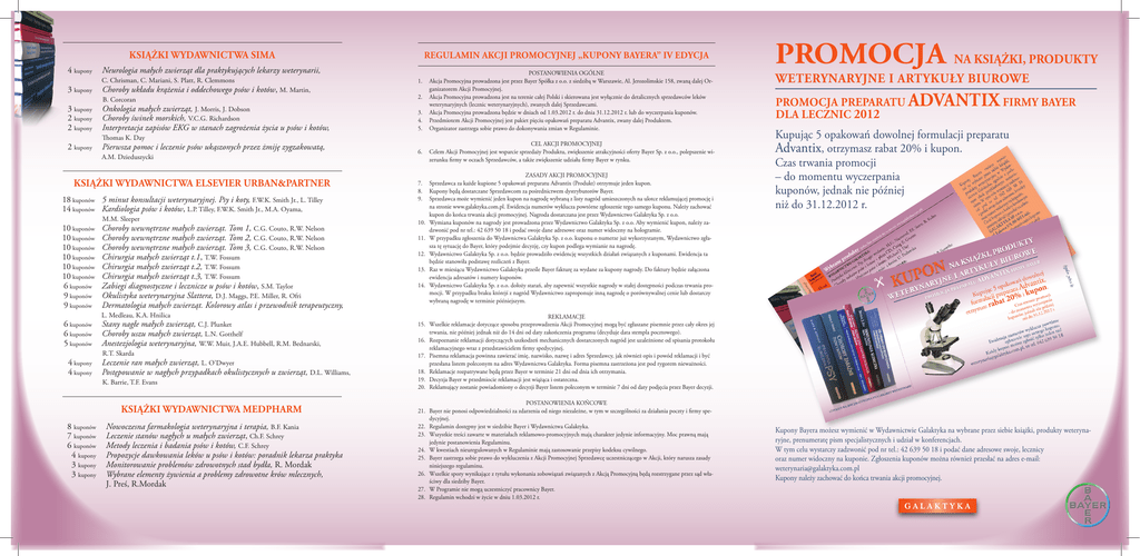 KSIĄŻKI WYDAWNICTWA SIMA 4 kupony Neurologia małych zwierząt dla praktykujących lekarzy weterynarii, C. Chrisman, C. Mariani, S. Platt, R. Clemmons 3 kupony Choroby układu krążenia i oddechowego psów i kotów, M. Martin, B. Corcoran 3 kupony Onkologia małych zwierząt, J. Morris, J. Dobson 2 kupony Choroby świnek morskich, V.C.G. Richardson 2 kupony Interpretacja zapisów EKG w stanach zagrożenia życia u psów i kotów, Thomas K. Day 2 kupony Pierwsza pomoc i leczenie psów ukąszonych przez żmiję zygzakowatą, A.M. Dzieduszycki KSIĄŻKI WYDAWNICTWA ELSEVIER URBAN&PARTNER 18 kuponów 5 minut konsultacji weterynaryjnej. Psy i koty, F.W.K. Smith Jr., L. Tilley 14 kuponów Kardiologia psów i kotów, L.P. Tilley, F.W.K. Smith Jr., M.A. Oyama, M.M. Sleeper 10 kuponów Choroby wewnętrzne małych zwierząt. Tom 1, C.G. Couto, R.W. Nelson wewnętrzne małych zwierząt. Tom 2, C.G. Couto, R.W. Nelson 10 kuponów Choroby wewnętrzne małych zwierząt. Tom 3, C.G. Couto, R.W. Nelson 10 kuponów Chirurgia małych zwierząt t.1, T.W. Fossum 10 kuponów Chirurgia małych zwierząt t.2, T.W. Fossum 10 kuponów Chirurgia małych zwierząt t.3, T.W. Fossum 6 kuponów Zabiegi diagnostyczne i lecznicze u psów i kotów, S.M. Taylor 9 kuponów Okulistyka weterynaryjna Slattera, D.J. Maggs, P.E. Miller, R. Ofri 9 kuponów Dermatologia małych zwierząt. Kolorowy atlas i przewodnik terapeutyczny, 10 kuponów Choroby 6 kuponów L. Medleau, K.A. Hnilica Stany nagłe małych zwierząt, C.J. Plunket 6 kuponów Choroby uszu małych zwierząt, L.N. Gotthelf 5 kuponów Anestezjologia weterynaryjna, W.W. Muir, J.A.E. Hubbell, R.M. Bednarski, R.T. Skarda 4 kupony Leczenie ran małych zwierząt, L. O’Dwyer 4 kupony Postępowanie w nagłych przypadkach okulistycznych u zwierząt, D.L. Williams, K. Barrie, T.F. Evans KSIĄŻKI WYDAWNICTWA MEDPHARM 8 kuponów Nowoczesna farmakologia weterynaryjna i terapia, B.F. Kania 7 kuponów Leczenie stanów nagłych u małych zwierząt, Ch.F. Schrey 6 kuponów Metody leczenia i badania psów i kotów, C.F. Schrey 4 kupony Propozycje dawkowania leków u psów i kotów: poradnik lekarza praktyka 3 kupony Monitorowanie problemów zdrowotnych stad bydła, R. Mordak 3 kupony Wybrane elementy żywienia a problemy zdrowotne krów mlecznych, J. Preś, R.Mordak REGULAMIN AKCJI PROMOCYJNEJ „KUPONY BAYERA” IV EDYCJA POSTANOWIENIA OGÓLNE 1.Akcja Promocyjna prowadzona jest przez Bayer Spółka z o.o. z siedzibą w Warszawie, Al. Jerozolimskie 158, zwaną dalej Organizatorem Akcji Promocyjnej. 2.Akcja Promocyjna prowadzona jest na terenie całej Polski i skierowana jest wyłącznie do detalicznych sprzedawców leków weterynaryjnych (lecznic weterynaryjnych), zwanych dalej Sprzedawcami. 3.Akcja Promocyjna prowadzona będzie w dniach od 1.03.2012 r. do dnia 31.12.2012 r. lub do wyczerpania kuponów. 4. Przedmiotem Akcji Promocyjnej jest pakiet pięciu opakowań preparatu Advantix, zwany dalej Produktem. 5. Organizator zastrzega sobie prawo do dokonywania zmian w Regulaminie. CEL AKCJI PROMOCYJNEJ 6.Celem Akcji Promocyjnej jest wsparcie sprzedaży Produktu, zwiększenie atrakcyjności oferty Bayer Sp. z o.o., polepszenie wizerunku firmy w oczach Sprzedawców, a także zwiększenie udziału firmy Bayer w rynku. ZASADY AKCJI PROMOCYJNEJ 7.Sprzedawca za każde kupione 5 opakowań preparatu Advantix (Produkt) otrzymuje jeden kupon. 8.Kupony będą dostarczane Sprzedawcom za pośrednictwem dystrybutorów Bayer. 9.Sprzedawca może wymienić jeden kupon na nagrodę wybraną z listy nagród umieszczonych na ulotce reklamującej promocję i na stronie www.galaktyka.com.pl. Ewidencja numerów wyklucza powtórne zgłoszenie tego samego kuponu. Należy zachować kupon do końca trwania akcji promocyjnej. Nagroda dostarczana jest przez Wydawnictwo Galaktyka Sp. z o.o. 10.Wymiana kuponów na nagrody jest prowadzona przez Wydawnictwo Galaktyka Sp. z o.o. Aby wymienić kupon, należy zadzwonić pod nr tel.: 42 639 50 18 i podać swoje dane adresowe oraz numer widoczny na hologramie. 11.W przypadku zgłoszenia do Wydawnictwa Galaktyka Sp. z o.o. kuponu o numerze już wykorzystanym, Wydawnictwo zgłasza tę sytuację do Bayer, który podejmie decyzję, czy kupon podlega wymianie na nagrodę. 12.Wydawnictwo Galaktyka Sp. z o.o. będzie prowadziło ewidencję wszystkich działań związanych z kuponami. Ewidencja ta będzie stanowiła podstawę rozliczeń z Bayer. 13.Raz w miesiącu Wydawnictwo Galaktyka prześle Bayer fakturę za wydane za kupony nagrody. Do faktury będzie załączona ewidencja adresatów i numery kuponów. 14.Wydawnictwo Galaktyka Sp. z o.o. dołoży starań, aby zapewnić wszystkie nagrody w stałej dostępności podczas trwania promocji. W przypadku braku którejś z nagród Wydawnictwo zaproponuje inną nagrodę o porównywalnej cenie lub dostarczy wybraną nagrodę w terminie późniejszym. PROMOCJA NA KSIĄŻKI, PRODUKTY WETERYNARYJNE I ARTYKUŁY BIUROWE PROMOCJA PREPARATU ADVANTIX FIRMY BAYER DLA LECZNIC 2012 Kupując 5 opakowań dowolnej formulacji preparatu Advantix, otrzymasz rabat 20% i kupon. Czas trwania promocji – do momentu wyczerpania kuponów, jednak nie później niż do 31.12.2012 r. REKLAMACJE 15.Wszelkie reklamacje dotyczące sposobu przeprowadzenia Akcji Promocyjnej mogą być zgłaszane pisemnie przez cały okres jej trwania, nie później jednak niż do 14 dni od daty zakończenia programu (decyduje data stempla pocztowego). 16.Rozpoznanie reklamacji dotyczących uszkodzeń mechanicznych dostarczonych nagród jest uzależnione od spisania protokołu reklamacyjnego wraz z przedstawicielem firmy spedycyjnej. 17.Pisemna reklamacja powinna zawierać imię, nazwisko, nazwę i adres Sprzedawcy, jak również opis i powód reklamacji i być przesłana listem poleconym na adres Wydawnictwa Galaktyka. Forma pisemna zastrzeżona jest pod rygorem nieważności. 18. Reklamacje rozpatrywane będą przez Bayer w terminie 21 dni od dnia ich otrzymania. 19. Decyzja 
