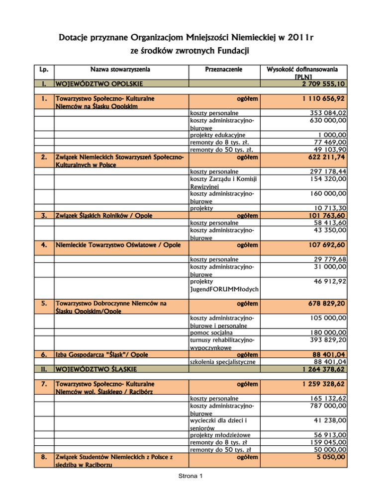 Dotacje przyznane Organizacjom Mniejszości Niemieckiej w 2011r ze środków zwrotnych Fundacji Lp. Nazwa stowarzyszenia I. WOJEWÓDZTWO OPOLSKIE 1. Towarzystwo Społeczno- Kulturalne Niemców na Śląsku Opolskim 2. 3. 4. 5. Wysokość dofinansowania [PLN] 2 709 555,10 ogółem 1 110 656,92 koszty personalne koszty administracyjnobiurowe projekty edukacyjne remonty do 8 tys. zł. remonty do 50 tys. zł. Związek Niemieckich Stowarzyszeń Społecznoogółem Kulturalnych w Polsce koszty personalne koszty Zarządu i Komisji Rewizyjnej koszty administracyjnobiurowe projekty Związek Śląskich Rolników / Opole ogółem koszty personalne koszty administracyjnobiurowe Niemieckie Towarzystwo Oświatowe / Opole ogółem 353 084,02 630 000,00 Izba Gospodarcza "Śląsk"/ Opole II. WOJEWÓDZTWO ŚLĄSKIE 7. Towarzystwo Społeczno- Kulturalne Niemców woj. Śląskiego / Racibórz Związek Studentów Niemieckich z Polsce z siedzibą w Raciborzu 1 000,00 77 469,00 49 103,90 622 211,74 297 178,44 154 320,00 160 000,00 10 713,30 101 763,60 58 413,60 43 350,00 107 692,60 koszty personalne koszty administracyjnobiurowe projekty JugendFORUMMłodych 29 779,68 31 000,00 ogółem 678 829,20 koszty administracyjnobiurowe i personalne pomoc socjalna turnusy rehabilitacyjnowypoczynkowe ogółem szkolenia specjalistyczne 105 000,00 Towarzystwo Dobroczynne Niemców na Śląsku Opolskim/Opole 6. 8. Przeznaczenie 46 912,92 180 000,00 393 829,20 88 401,04 88 401,04 1 264 378,62 ogółem 1 259 328,62 koszty personalne koszty administracyjnobiurowe wycieczki dla dzieci i seniorów projekty młodzieżowe remonty do 8 tys. zł remonty do 50 tys. zł ogółem 165 132,62 787 000,00 Strona 1 41 238,00 56 913,00 159 045,00 50 000,00 5 050,00 projekty młodzieżowe III. WOJEWÓDZTWO DOLNOŚLĄSKIE 9. Niemieckie Towarzystwo KulturalnoSpołeczne we Wrocławiu ogółem koszty personalne koszty administracyjnobiurowe festyny wycieczki dla dzieci i seniorów projekty młodzieżowe remonty do 50 tys. zł IV. POZOSTALE WOJEWÓDZTWA 10. Związek Stowarzyszeń Niemieckich Warmii i Mazur/Olsztyn 11. Olsztyńskie Stowarzyszenie Mniejszości Niemieckiej w Olsztynie 12. Stowarzyszenie Ludności Pochodzenia Niemieckiego z siedzibą w Toruniu 15. Związek Młodzieży Mniejszości Niemieckiej w Rzeczypospolitej Polskiej 16. Niemieckie Towarzystwo KulturalnoSpołeczne w Wałbrzychu 17. Niemieckie Towarzystwo KulturalnoFolklorystyczne "Liczyrzepa" w Kamiennej Górze 18. Niemieckie Towarzystwo SpołecznoKulturalne w Jeleniej Górze 79 461,44 59 000,00 1 200,00 2 700,00 4 800,00 23 062,50 1 125 565,65 222 241,50 koszty personalne koszty administracyjnobiurowe projekty młodzieżowe remonty do 8 tys. zł ogółem 46 020,48 157 571,02 koszty personalne koszty administracyjnobiurowe ogółem 35 158,80 36 000,00 koszty administracyjnobiurowe ogółem 14. Związek Mniejszości Niemieckiej w Gdańsku 170 223,94 ogółem koszty administracyjnobiurowe ogółem 13. Towarzystwo Społeczno-Kulturalne Mniejszości Niemieckiej w Szczecinie 5 050,00 170 223,94 koszty personalne koszty administracyjnobiurowe remonty do 8 tys. zł ogółem koszty personalne koszty administracyjnobiurowe projekty młodzieżowe ogółem koszty administracyjnobiurowe ogółem koszty administracyjnobiurowe ogółem Strona 2 3 600,00 15 050,00 71 158,80 45 000,00 45 000,00 106 700,00 106 700,00 127 533,64 32 453,64 90 000,00 5 080,00 186 750,16 28 499,16 91 000,00 67 251,00 54 000,00 54 000,00 14 402,17 14 402,17 10 000,00 19. Niemieckie Towarzystwo SpołecznoKulturalne w Legnicy 20. Towarzystwo Społeczno- Kulturalne Mniejszości Niemieckiej w Zielonej Górze 21. Niemieckie Towarzystwo SpołecznoKulturalne w Łodzi 22. Niemieckie Towarzystwo SpołecznoKulturalne w Pile 23. Chrześcijański Związek Niemiecki "Karkonosze" w Jeleniej Górze 24. Stowarzyszenie Mazurskie / Olsztyn 25. Towarzystwo Mniejszości Niemieckiej z siedzibą w Bydgoszczy 26. Stowarzyszenie Ludności Pochodzenia Niemieckiego Ziemi Elbląskiej 27. Towarzystwo Ludności Pochodzenia Niemieckiego w Grudziądzu 28. Stowarzyszenie Mniejszości Niemieckiej Miasta Malborka i Okolic 29. Towarzystwo Kulturalne Ludności Niemieckiej "Ojczyzna" w Kwidzynie 30. Stowarzyszenie Społeczno- Kulturalne Mniejszości Niemieckiej w Powiecie 31. Słupski Związek Ludności Pochodzenia Niemieckiego 32. Nidzickie Stowarzyszenie Mniejszości Niemieckiej koszty administracyjnobiurowe ogółem koszty administracyjnobiurowe ogółem koszty administracyjnobiurowe ogółem koszty administracyjnobiurowe ogółem 10 000,00 24 000,00 24 000,00 15 000,00 15 000,00 17 000,00 17 000,00 23 000,00 koszty administracyjnobiurowe ogółem 23 000,00 koszty administracyjnobiurowe ogółem koszty administracyjnobiurowe ogółem 4 500,00 koszty administracyjnobiurowe ogółem koszty administracyjnobiurowe ogółem 4 500,00 4 000,00 4 000,00 16 000,00 16 000,00 17 500,00 17 500,00 15 000,00 koszty administracyjnobiurowe ogółem 15 000,00 koszty administracyjnobiurowe ogółem 8 779,38 koszty administracyjnobiurowe projekty młodzieżowe ogółem koszty administracyjnobiurowe ogółem koszty administracyjnobiurowe ogółem koszty administracyjnobiurowe Strona 3 8 779,38 23 000,00 18 000,00 5 000,00 15 000,00 15 000,00 37 000,00 37 000,00 12 000,00 12 000,00 33. Towarzystwo Społeczno Kulturalne Mniejszości Niemieckiej "Pomerania" w Koszalinie 34. Chojnickie Stowarzyszenie Ludności Pochodzenia Niemieckiego 35. Niemieckie Towarzystwo SpołecznoKulturalne w Kłodzku ogółem 18 000,00 koszty administracyjnobiurowe ogółem 18 000,00 koszty administracyjnobiurowe ogółem koszty administracyjnobiurowe remonty do 8 tys. zł V. INNE 36. Śląskie Stowarzyszenie Samorządowe w Leśnicy 37. Konwersatorium im. J. v. Eichendorffa w Opolu 38. Związek Śląskich Kobiet Wiejskich / Wierzch 15 000,00 23 000,00 15 000,00 8 000,00 510 433,65 ogółem 5 000,00 koszty administracyjnobiurowe ogółem 5 000,00 koszty administracyjnobiurowe ogółem koszty administracyjno