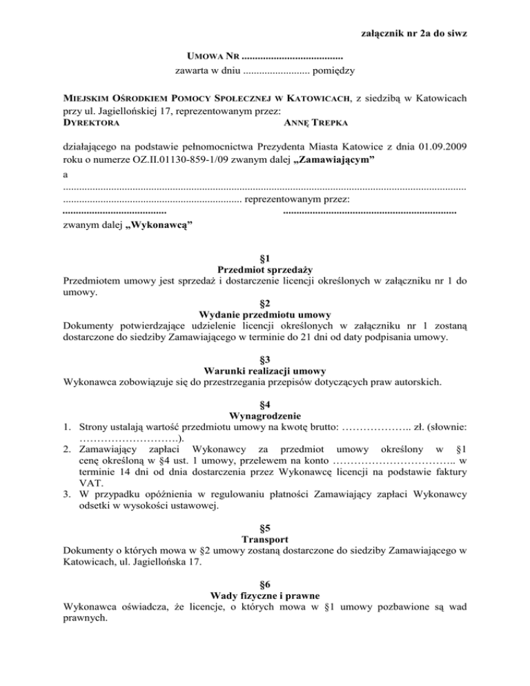 załącznik nr 2a do siwz UMOWA NR ...................................... zawarta w dniu ......................... pomiędzy MIEJSKIM OŚRODKIEM POMOCY SPOŁECZNEJ W KATOWICACH, z siedzibą w Katowicach przy ul. Jagiellońskiej 17, reprezentowanym przez: DYREKTORA ANNĘ TREPKA działającego na podstawie pełnomocnictwa Prezydenta Miasta Katowice z dnia 01.09.2009 roku o numerze OZ.II.01130-859-1/09 zwanym dalej „Zamawiającym” a ....................................................................................................................................................... ................................................................... reprezentowanym przez: ....................................... ................................................................. zwanym dalej „Wykonawcą” §1 Przedmiot sprzedaży Przedmiotem umowy jest sprzedaż i dostarczenie licencji określonych w załączniku nr 1 do umowy. §2 Wydanie przedmiotu umowy Dokumenty potwierdzające udzielenie licencji określonych w załączniku nr 1 zostaną dostarczone do siedziby Zamawiającego w terminie do 21 dni od daty podpisania umowy. §3 Warunki realizacji umowy Wykonawca zobowiązuje się do przestrzegania przepisów dotyczących praw autorskich. §4 Wynagrodzenie 1. Strony ustalają wartość przedmiotu umowy na kwotę brutto: ……………….. zł. (słownie: ……………………….). 2. Zamawiający zapłaci Wykonawcy za przedmiot umowy określony w §1 cenę określoną w §4 ust. 1 umowy, przelewem na konto …………………………….. w terminie 14 dni od dnia dostarczenia przez Wykonawcę licencji na podstawie faktury VAT. 3. W przypadku opóźnienia w regulowaniu płatności Zamawiający zapłaci Wykonawcy odsetki w wysokości ustawowej. §5 Transport Dokumenty o których mowa w §2 umowy zostaną dostarczone do siedziby Zamawiającego w Katowicach, ul. Jagiellońska 17. §6 Wady fizyczne i prawne Wykonawca oświadcza, że licencje, o których mowa w §1 umowy pozbawione są wad prawnych. 1. 2. 3. 4. 5. 1. 2. 1. 2. 3. §7 Kary umowne Wykonawca za niedotrzymanie terminu dostarczenia licencji o których mowa w §1 umowy, zapłaci Zamawiającemu karę umowną w wysokości 0,1% wynagrodzenia brutto, o którym mowa w §4 ust. 1 umowy, za każdy dzień opóźnienia. W przypadku niewykonania umowy z przyczyn leżących po stronie Wykonawcy, Wykonawca zapłaci Zamawiającemu karę umowną w wysokości 20% wynagrodzenia brutto, o którym mowa w §4 ust. 1 umowy. W przypadku dostarczenia przedmiotu zamówienia niespełniającego wymagań określonych w specyfikacji istotnych warunków zamówienia, Wykonawca, po uzgodnieniu z Zamawiającym, wymieni go na własny koszt na nowy, spełniający wymagania jak określone w specyfikacji istotnych warunków zamówienia, w terminie do 14 dni od dnia zgłoszenia przez Zamawiającego. Koszty ewentualnej migracji systemu poniesie Wykonawca. Dodatkowo, wykonawca zapłaci Zamawiającemu karę umowną w wysokości 5% wynagrodzenia brutto, o którym mowa w §4 ust. 1 umowy. Kary umowne podlegają sumowaniu. W przypadku jeżeli kara umowna nie pokryje całości szkody Zamawiający ma prawo do dochodzenia odszkodowania na zasadach ogólnych. §8 Zamówienia publiczne Niniejsza umowa została zawarta w wyniku przeprowadzenia postępowania o udzielenie zamówienia publicznego w trybie przetargu nieograniczonego na podstawie oferty złożonej przez Wykonawcę. Zamawiający może odstąpić od umowy w razie istotnej zmiany okoliczności powodującej, że wykonanie umowy nie leży w interesie publicznym, czego nie można było przewidzieć w chwili zawarcia umowy, w terminie 30 dni od powzięcia wiadomości o tych okolicznościach. §9 Postanowienia końcowe W sprawach nieuregulowanych niniejsza umową mają zastosowanie przepisy kodeksu Cywilnego i ustawy Prawo zamówień publicznych. Ewentualne spory wynikłe ze stosowania niniejszej umowy będą rozstrzygane przez właściwy miejscowo Sąd dla Zamawiającego. Umowę sporządzono w trzech jednobrzmiących egzemplarzach – jeden dla Wykonawcy oraz dwa dla Zamawiającego. projekt ZAMAWIAJĄCY WYKONAWCA Załącznik nr 1 do umowy ………… ………………………………………. Określenie przedmiotu zamówienia Ilość WinRmtDsktpSrvcsCAL SA OLP NL Gov UsrCA WinSvrStd SA OLP NL Gov 2Proc WinSvrCAL SA OLP NL Gov UsrCAL [S] FortiGate-100D UTM Bundle 1 Year WinSrvCAL 2012 OLP NL Gov UsrCAL Rozszerzenie ilości licencji ESET Endpoint Antywirus NOD32 Bundle Commander Professional Edition maintenance Roczne wsparcie dla SEP sesam, obejmujące: SEP sesam Standard Server Linux, software upgrade 12 months 10 SEP sesam Backup Clients, software upgrade 12 months 5 SEP sesam Backup Clients, software upgrade 12 months SEP sesam Backup Client, software upgrade 12 months SEP sesam Database Online Agent for MS-SQL Server, software upgrade 12 months SEP sesam Mail/Groupware Online Agent for Novell GroupWise, software upgrade 12 months Extension of 250 User Licenses for all SEP sesam Mail/Groupware Agents, software upgrade 12 months SEP sesam Autoloader or Library Support 1 Slot, software upgrade 12 months SEP sesam Autoloader or Library Support 20 Slot, software upgrade 12 months SEP Standard Support; Incidents: 5, Reaction time: 8 business hours, Support hours: monday till friday from 09:00 to 17:00 o'clock (CET/CEST), Requirements: valid upgrade contract, Contract period: 12 months 12 2 12 2 306 30 350 Łączna kwota brutto w PLN 1 1 1 1 1 1 1 1 1 1 projekt ZAMAWIAJĄCY WYKONAWCA