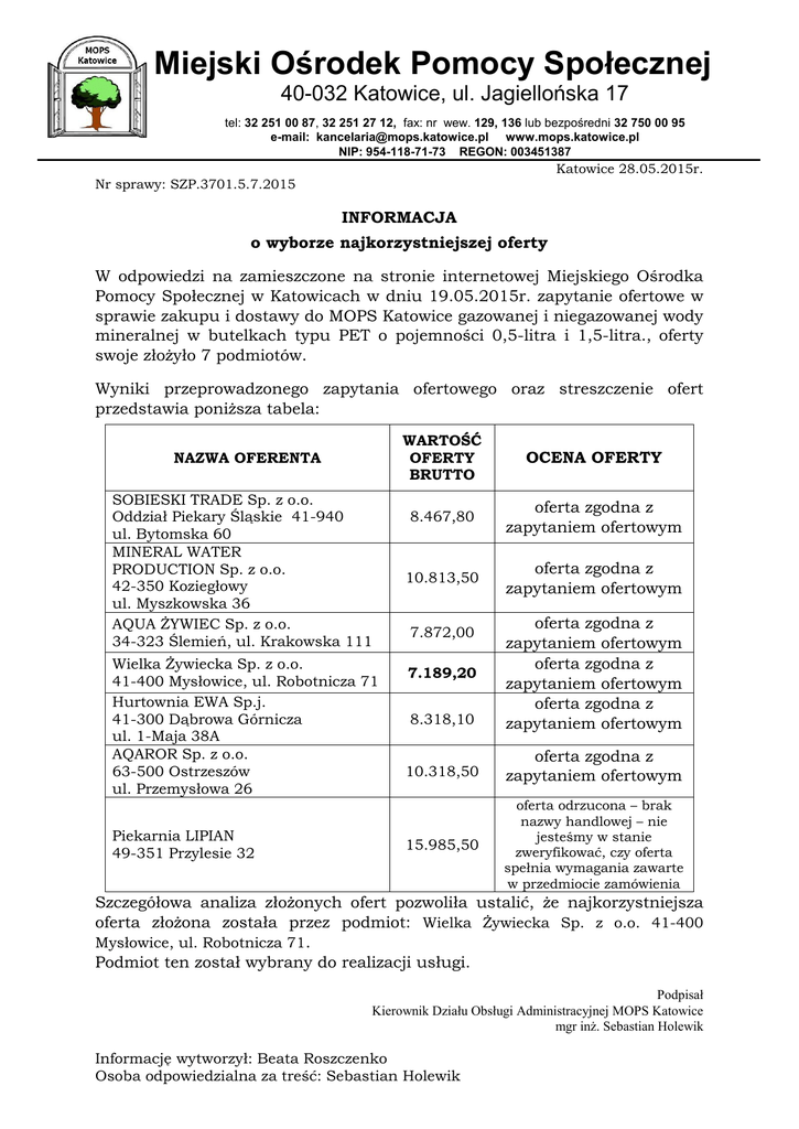 Miejski Ośrodek Pomocy Społecznej 40-032 Katowice, ul. Jagiellońska 17 tel: 32 251 00 87, 32 251 27 12, fax: nr wew. 129, 136 lub bezpośredni 32 750 00 95 e-mail: [email protected] www.mops.katowice.pl NIP: 954-118-71-73 REGON: 003451387 Katowice 28.05.2015r. Nr sprawy: SZP.3701.5.7.2015 INFORMACJA o wyborze najkorzystniejszej oferty W odpowiedzi na zamieszczone na stronie internetowej Miejskiego Ośrodka Pomocy Społecznej w Katowicach w dniu 19.05.2015r. zapytanie ofertowe w sprawie zakupu i dostawy do MOPS Katowice gazowanej i niegazowanej wody mineralnej w butelkach typu PET o pojemności 0,5-litra i 1,5-litra., oferty swoje złożyło 7 podmiotów. Wyniki przeprowadzonego zapytania ofertowego oraz streszczenie ofert przedstawia poniższa tabela: NAZWA OFERENTA SOBIESKI TRADE Sp. z o.o. Oddział Piekary Śląskie 41-940 ul. Bytomska 60 MINERAL WATER PRODUCTION Sp. z o.o. 42-350 Koziegłowy ul. Myszkowska 36 AQUA ŻYWIEC Sp. z o.o. 34-323 Ślemień, ul. Krakowska 111 Wielka Żywiecka Sp. z o.o. 41-400 Mysłowice, ul. Robotnicza 71 Hurtownia EWA Sp.j. 41-300 Dąbrowa Górnicza ul. 1-Maja 38A AQAROR Sp. z o.o. 63-500 Ostrzeszów ul. Przemysłowa 26 Piekarnia LIPIAN 49-351 Przylesie 32 WARTOŚĆ OFERTY BRUTTO OCENA OFERTY 8.467,80 oferta zgodna z zapytaniem ofertowym 10.813,50 oferta zgodna z zapytaniem ofertowym 8.318,10 oferta zgodna z zapytaniem ofertowym oferta zgodna z zapytaniem ofertowym oferta zgodna z zapytaniem ofertowym 10.318,50 oferta zgodna z zapytaniem ofertowym 15.985,50 oferta odrzucona – brak nazwy handlowej – nie jesteśmy w stanie zweryfikować, czy oferta spełnia wymagania zawarte w przedmiocie zamówienia 7.872,00 7.189,20 Szczegółowa analiza złożonych ofert pozwoliła ustalić, że najkorzystniejsza oferta złożona została przez podmiot: Wielka Żywiecka Sp. z o.o. 41-400 Mysłowice, ul. Robotnicza 71. Podmiot ten został wybrany do realizacji usługi. Podpisał Kierownik Działu Obsługi Administracyjnej MOPS Katowice mgr inż. Sebastian Holewik Informację wytworzył: Beata Roszczenko Osoba odpowiedzialna za treść: Sebastian Holewik