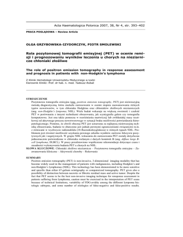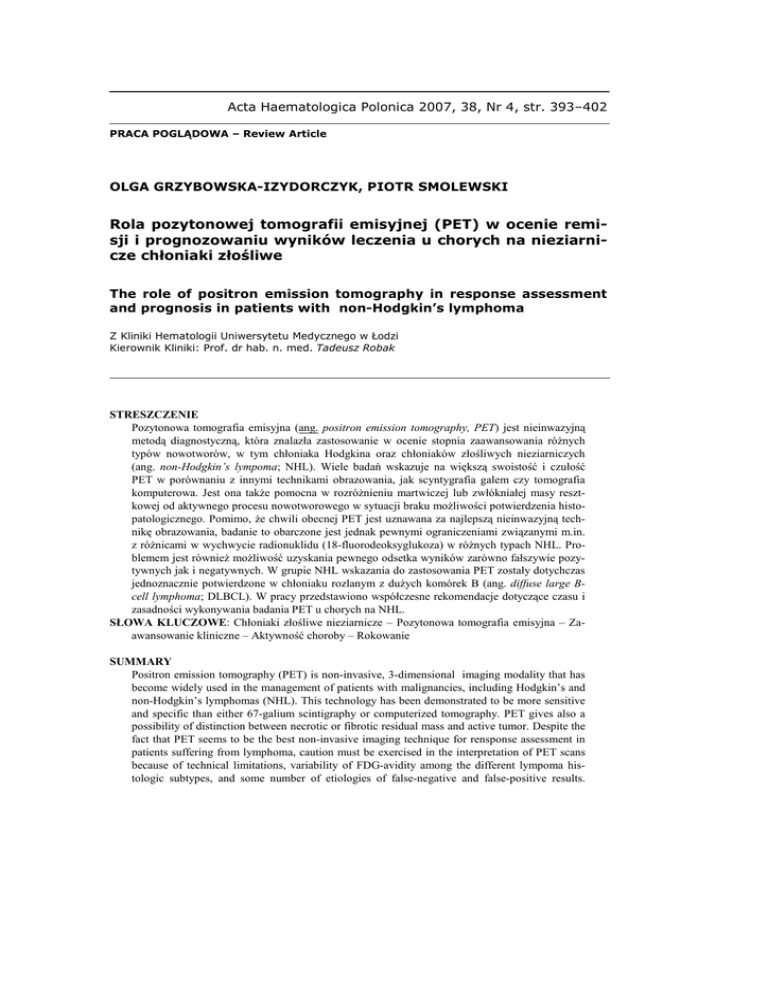 Acta Haematologica Polonica 2007, 38, Nr 4, str. 393–402 PRACA POGLĄDOWA – Review Article OLGA GRZYBOWSKA-IZYDORCZYK, PIOTR SMOLEWSKI Rola pozytonowej tomografii emisyjnej (PET) w ocenie remisji i prognozowaniu wyników leczenia u chorych na nieziarnicze chłoniaki złośliwe The role of positron emission tomography in response assessment and prognosis in patients with non-Hodgkin’s lymphoma Z Kliniki Hematologii Uniwersytetu Medycznego w Łodzi Kierownik Kliniki: Prof. dr hab. n. med. Tadeusz Robak STRESZCZENIE Pozytonowa tomografia emisyjna (ang. positron emission tomography, PET) jest nieinwazyjną metodą diagnostyczną, która znalazła zastosowanie w ocenie stopnia zaawansowania róŜnych typów nowotworów, w tym chłoniaka Hodgkina oraz chłoniaków złośliwych nieziarniczych (ang. non-Hodgkin’s lympoma; NHL). Wiele badań wskazuje na większą swoistość i czułość PET w porównaniu z innymi technikami obrazowania, jak scyntygrafia galem czy tomografia komputerowa. Jest ona takŜe pomocna w rozróŜnieniu martwiczej lub zwłókniałej masy resztkowej od aktywnego procesu nowotworowego w sytuacji braku moŜliwości potwierdzenia histopatologicznego. Pomimo, Ŝe chwili obecnej PET jest uznawana za najlepszą nieinwazyjną technikę obrazowania, badanie to obarczone jest jednak pewnymi ograniczeniami związanymi m.in. z róŜnicami w wychwycie radionuklidu (18-fluorodeoksyglukoza) w róŜnych typach NHL. Problemem jest równieŜ moŜliwość uzyskania pewnego odsetka wyników zarówno fałszywie pozytywnych jak i negatywnych. W grupie NHL wskazania do zastosowania PET zostały dotychczas jednoznacznie potwierdzone w chłoniaku rozlanym z duŜych komórek B (ang. diffuse large Bcell lymphoma; DLBCL). W pracy przedstawiono współczesne rekomendacje dotyczące czasu i zasadności wykonywania badania PET u chorych na NHL. SŁOWA KLUCZOWE: Chłoniaki złośliwe nieziarnicze – Pozytonowa tomografia emisyjna – Zaawansowanie kliniczne – Aktywność choroby – Rokowanie SUMMARY Positron emission tomography (PET) is non-invasive, 3-dimensional imaging modality that has become widely used in the management of patients with malignancies, including Hodgkin’s and non-Hodgkin’s lymphomas (NHL). This technology has been demonstrated to be more sensitive and specific than either 67-galium scintigraphy or computerized tomography. PET gives also a possibility of distinction between necrotic or fibrotic residual mass and active tumor. Despite the fact that PET seems to be the best non-invasive imaging technique for rensponse assessment in patients suffering from lymphoma, caution must be exercised in the interpretation of PET scans because of technical limitations, variability of FDG-avidity among the different lympoma histologic subtypes, and some number of etiologies of false-negative and false-positive results. 394 O. GRZYBOWSKA-IZYDORCZYK, P. SMOLEWSKI Among NHL, the indications for routine implementation of PET have been definitely established only for patients with diffuse large B-cell lymphoma (DLBCL). In this review we describe current recommendations for the use of PET examination in patients with NHL. KEY WORDS: Non-Hodgkin’s lymphoma – Positron emission tomography – Clinical stage – Activity – Prognosis WSTĘP Chłoniaki złośliwe nieziarnicze (ang. Non-Hodgkin’s lympoma; NHL) to grupa układowych chorób nowotworowych, bardzo zróŜnicowana pod względem histopatologicznym i klinicznym. Biorąc pod uwagę częstość występowania a takŜe śmiertelność spowodowaną chorobami nowotworowymi u osób dorosłych zajmują one szóste miejsce wśród nowotworów złośliwych (1). Niestety częstość zachorowań na NHL stale rośnie i wynosi około 3–4% w skali roku (2). Rozpoznanie histopatologiczne, stopień zaawansowania klinicznego (wg klasyfikacji Ann Arbor) oraz inne kliniczne lub laboratoryjne czynniki rokownicze są podstawą przy podejmowaniu decyzji terapeutycznych. Niezwykle istotna jest ocena tych parametrów zarówno na początku choroby jak i po zakończeniu leczenia I linii, celem oceny skuteczności terapii oraz wyboru dalszego sposobu postępowania (3, 4). Tomografia komputerowa (ang. computed tomography; CT) była w ostatnich latach uznawana za najlepszą metodę oceny stopnia zaawansowania choroby. Wykazano jednak, Ŝe o ile ta technika obrazowania charakteryzuje się wysoką czułością i swoistością w ocenie choroby przed leczeniem, to jej swoistość znacznie spada w przypadku oceny odpowiedzi na zastosowaną terapię (5). RównieŜ scyntygrafia galem (67Ga), wykorzystywana często do oceny wyników leczenia pacjentów z NHL o wysokim stopniu złośliwości, nie znalazła powszechnego zastosowania w przypadku chłoniaków przewlekłych (indolent lymphomas) z uwagi na jej niską czułość i swoistość. Badanie to ma ograniczone zastosowanie takŜe w przypadku zmian zlokalizowanych w obrębie jamy brzusznej (fizjologiczne gromadzenie znacznika w jelitach) (6). Obecnie wielkie nadzieje w ocenie zaawansowania oraz efektów leczenia chorób nowotworowych, w tym równieŜ chłoniaków złośliwych (chłoniak Hodgkina, NHL) wiąŜe się z zastosowaniem pozytonowej tomografii emisyjnej (ang. positron emission tomography, PET). Wydaje się, Ŝe jest to metoda wykazująca wysoką czułość i swoistość w przypadku większości podtypów NHL, zwłaszcza w chłoniakach agresywnych. Pozwala równieŜ z większą czułością niŜ scyntygrafia na wykrycie węzłowych i pozawęzłowych lokalizacji choroby, zarówno w chwili rozpoznania jak i w trakcie leczenia (7,8). Nie bez znaczenia jest równieŜ fakt moŜliwości przeprowadzenia badania juŜ po dwóch godzinach od iniekcji radionuklidu (18 fluorodeoksyglukoza;18 FFDG). Metoda PET jest aktualnie uznawana za najlepszy nieinwazyjny sposób oceny chłoniaków, i pomimo pewnych ograniczeń, w połączeniu z dotychczas stosowanymi technikami obrazowania (głównie badaniem tomograficznym) wkr