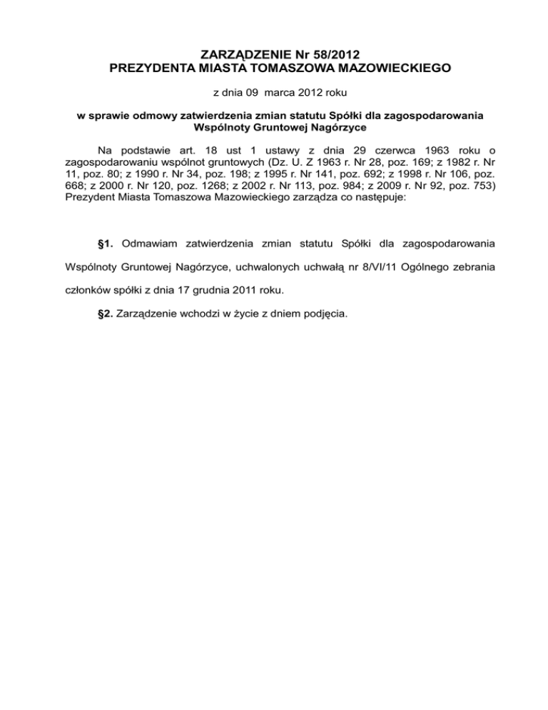 ZARZĄDZENIE Nr 58/2012 PREZYDENTA MIASTA TOMASZOWA MAZOWIECKIEGO z dnia 09 marca 2012 roku w sprawie odmowy zatwierdzenia zmian statutu Spółki dla zagospodarowania Wspólnoty Gruntowej Nagórzyce Na podstawie art. 18 ust 1 ustawy z dnia 29 czerwca 1963 roku o zagospodarowaniu wspólnot gruntowych (Dz. U. Z 1963 r. Nr 28, poz. 169; z 1982 r. Nr 11, poz. 80; z 1990 r. Nr 34, poz. 198; z 1995 r. Nr 141, poz. 692; z 1998 r. Nr 106, poz. 668; z 2000 r. Nr 120, poz. 1268; z 2002 r. Nr 113, poz. 984; z 2009 r. Nr 92, poz. 753) Prezydent Miasta Tomaszowa Mazowieckiego zarządza co następuje: §1. Odmawiam zatwierdzenia zmian statutu Spółki dla zagospodarowania Wspólnoty Gruntowej Nagórzyce, uchwalonych uchwałą nr 8/VI/11 Ogólnego zebrania członków spółki z dnia 17 grudnia 2011 roku. §2. Zarządzenie wchodzi w życie z dniem podjęcia. Uzasadnienie Uchwałą Nr 8/VI/11 z dnia 17 grudnia 2011 roku ogólne zebranie członków Spółki dla zagospodarowania Wspólnoty Gruntowej wsi Nagórzyce podjęło uchwałę w sprawie uchwalenia zmian w statucie Wspólnoty Gruntowej wsi Nagórzyce. Jako załącznik do uchwały wskazano natomiast: „statut spółki dla zagospodarowania Wspólnoty Gruntowej Nagórzyce o treści przyjętej w dniu 17 grudnia 2011 r.”. Z porównania treści załącznika i dotychczasowego brzmienia statutu spółki wynika, iż oprócz zmiany nazwy spółki – wprowadzonej wcześniej podjętą uchwałą nr 6/VI/11 – w załączniku zawarte zostały następujące zmiany: 1. w §2 statutu zmieniono zapisy odnośnie siedziby spółki, 2. w §3 statutu zmianie uległy zapisy dotyczące powierzchni wspólnoty, 3. w §6 statutu usunięto dotychczasową treść ust. 2 i zastąpiono brzmieniem dotychczasowego ust. 3, 4. dodano nowe brzmienie ust. 3 §6 regulującego warunki następstwa prawnego członka spółki, 5. dodanie nowego brzmienia §9 - regulującego utratę członkostwa spółki - oraz związana z tym zmiana numeracji dalszych §§ statutu, 6. wprowadzenie w zapisach statutu w miejsce Wydziału Rolnictwa i Leśnictwa Prezydium Powiatowej Rady Narodowej, Prezydenta Miasta Tomaszowa Mazowieckiego, jako organu sprawującego czynności nadzorcze. Z wnioskiem o zatwierdzenie zmian statutu spółki dla zagospodarowania wspólnoty gruntowej wystąpił zarząd spółki. Zgodnie z treścią art. 18 ust 1 ustawy z 29 czerwca 1963 roku o zagospodarowaniu wspólnot gruntowych (Dz. U. Nr 28, poz. 169, z późn. zm.) zmiany statutu spółki powołanej do sprawowania zarządu nad wspólnotą gruntową i do właściwego zagospodarowania gruntów wchodzących w skład tej wspólnoty wymagają zatwierdzenia przez właściwego wójta (burmistrza lub prezydenta miasta). Dokonując oceny legalności zmian statutu w ramach czynności nadzorczych, prowadzonych w oparciu o ww. przepis, stwierdzić należy iż zachodzą przeszkody do zatwierdzenia wnioskowanych zmian w statucie spółki. Przede wszystkim wskazać należy, iż zgodnie z tytułem, jak również treścią art. 1, uchwała nr 8/VI/11 z 17 grudnia 2011 roku podjęta została: „w sprawie uchwalenia zmian w statucie wspólnoty gruntowej”. Przy tak określonym przedmiocie regulacji tej uchwały trudno mówić o skutecznym wprowadzeniu zmian do statutu spółki dla zagospodarowania wspólnoty. Odróżnić, bowiem należy samą wspólnotę gruntową, na którą składają się określone nieruchomości i która z natury rzeczy nie posiada statutu, od spółki powołanej do sprawowania zarządu nad wspólnotą i do właściwego zagospodarowania gruntów wchodzących w skład tej wspólnoty. Treść analizowanej uchwały nr 8/VI/2011 nie pozwala na przyjęcie, iż ogólne zebranie członków spółki zrealizowało swoją kompetencję przewidzianą w §12 ust 1 pkt 1 statutu spółki, polegającą na uchwaleniu zmian statutu spółki. Oceny tej nie zmienia okoliczność, iż w uchwale - po części dyspozytywnej zawartej w poszczególnych artykułach - wskazano załącznik w postaci statutu spółki z wprowadzonymi zmianami. Treść uchwały, bowiem w żaden sposób nie odwołuje się do rozwiązań zawartych w załączniku, co dodatkowo, przy uwzględnieniu rozbieżności przedmiotu regulacji uchwały i zawartości załącznika, wyklucza możliwość przyjęcia, jakoby ogólne zebranie członków skutecznie uchwaliło zmiany w statucie spółki. Wskazana wadliwość uchwały nr 8/VI/11 stanowi zasadniczą przeszkodę do zatwierdzenia zmian statutu spółki, którego domagał się zarząd spółki. Niezależnie od powyższego uchybienia – mającego charakter proceduralny – zauważyć ponadto należy, iż w załączniku do uchwały pojawiły się zapisy sprzeczne z prawem. Dotyczy to w szczególności §6 ust. 3 oraz §9 załącznika. Zapisy §6 ust 3 odnoszące się do następstwa prawnego członka spółki, w niedopuszczalny sposób modyfikują regulację ustawową zawartą w art. 27-29 ustawy o zagospodarowaniu wspólnot gruntowych i jako takie sprzeczne są z ustawą. Natomiast §9 wprowadza nie przewidziany tą ustawą tryb utraty członkostwa spółki, co wyklucza tego rodzaju zapisy z zakresu dopuszczalnej treści materii statutowej.