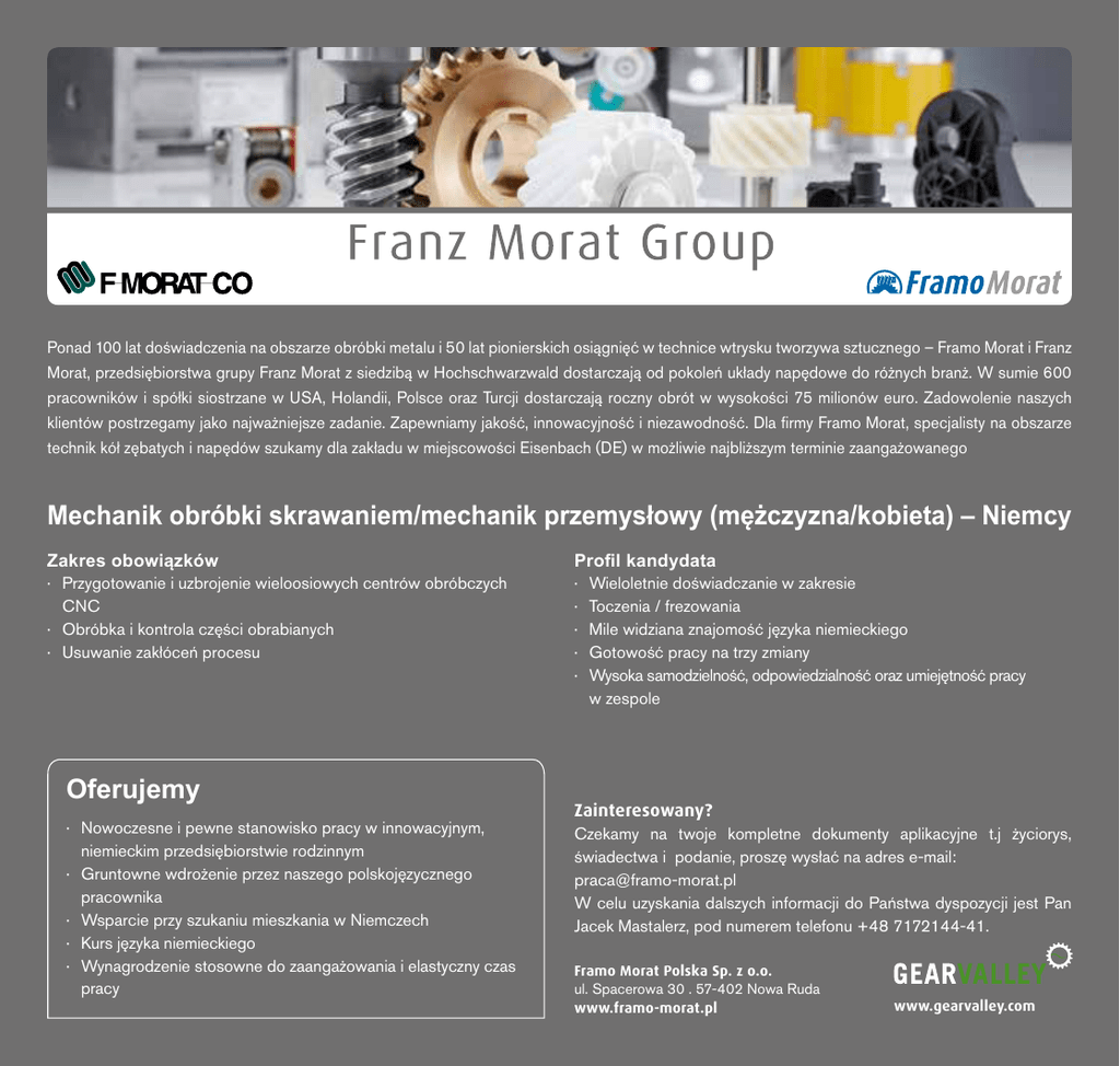 Ponad 100 lat doświadczenia na obszarze obróbki metalu i 50 lat pionierskich osiągnięć w technice wtrysku tworzywa sztucznego – Framo Morat i Franz Morat, przedsiębiorstwa grupy Franz Morat z siedzibą w Hochschwarzwald dostarczają od pokoleń układy napędowe do różnych branż. W sumie 600 pracowników i spółki siostrzane w USA, Holandii, Polsce oraz Turcji dostarczają roczny obrót w wysokości 75 milionów euro. Zadowolenie naszych klientów postrzegamy jako najważniejsze zadanie. Zapewniamy jakość, innowacyjność i niezawodność. Dla firmy Framo Morat, specjalisty na obszarze technik kół zębatych i napędów szukamy dla zakładu w miejscowości Eisenbach (DE) w możliwie najbliższym terminie zaangażowanego Mechanik obróbki skrawaniem/mechanik przemysłowy (mężczyzna/kobieta) – Niemcy Zakres obowiązków ·Przygotowanie i uzbrojenie wieloosiowych centrów obróbczych CNC · Obróbka i kontrola części obrabianych · Usuwanie zakłóceń procesu Oferujemy ·Nowoczesne i pewne stanowisko pracy w innowacyjnym, niemieckim przedsiębiorstwie rodzinnym · Gruntowne wdrożenie przez naszego polskojęzycznego pracownika · Wsparcie przy szukaniu mieszkania w Niemczech ·Kurs języka niemieckiego ·Wynagrodzenie stosowne do zaangażowania i elastyczny czas pracy Profil kandydata ·Wieloletnie doświadczanie w zakresie · Toczenia / frezowania · Mile widziana znajomość języka niemieckiego ·Gotowość pracy na trzy zmiany · Wysoka samodzielność, odpowiedzialność oraz umiejętność pracy w zespole Zainteresowany? Czekamy na twoje kompletne dokumenty aplikacyjne t.j życiorys, świadectwa i podanie, proszę wysłać na adres e-mail: [email protected] W celu uzyskania dalszych informacji do Państwa dyspozycji jest Pan Jacek Mastalerz, pod numerem telefonu +48 7172144-41. Framo Morat Polska Sp. z o.o. ul. Spacerowa 30 . 57-402 Nowa Ruda www.framo-morat.pl www.gearvalley.com