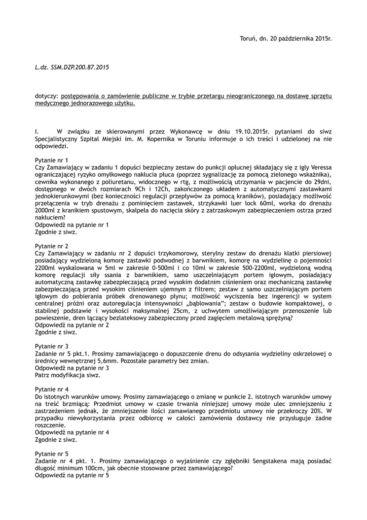 Toruń, dn. 20 października 2015r. L.dz. SSM.DZP.200.87.2015 dotyczy: postępowania o zamówienie publiczne w trybie przetargu nieograniczonego na dostawę sprzętu medycznego jednorazowego użytku. I. W związku ze skierowanymi przez Wykonawcę w dniu 19.10.2015r. pytaniami do siwz Specjalistyczny Szpital Miejski im. M. Kopernika w Toruniu informuje o ich treści i udzielonej na nie odpowiedzi. Pytanie nr 1 Czy Zamawiający w zadaniu 1 dopuści bezpieczny zestaw do punkcji opłucnej składający się z igły Veressa ograniczającej ryzyko omyłkowego nakłucia płuca (poprzez sygnalizację za pomocą zielonego wskaźnika), cewnika wykonanego z poliuretanu, widocznego w rtg, z możliwością utrzymania w pacjencie do 29dni, dostępnego w dwóch rozmiarach 9Ch i 12Ch, zakończonego układem z automatycznymi zastawkami jednokierunkowymi (bez konieczności regulacji przepływów za pomocą kraników), posiadający możliwość przełączenia w tryb drenażu z pominięciem zastawek, strzykawki luer lock 60ml, worka do drenażu 2000ml z kranikiem spustowym, skalpela do nacięcia skóry z zatrzaskowym zabezpieczeniem ostrza przed nakłuciem? Odpowiedź na pytanie nr 1 Zgodnie z siwz. Pytanie nr 2 Czy Zamawiający w zadaniu nr 2 dopuści trzykomorowy, sterylny zestaw do drenażu klatki piersiowej posiadający wydzieloną komorę zastawki podwodnej z barwnikiem, komorę na wydzielinę o pojemności 2200ml wyskalowana w 5ml w zakresie 0-500ml i co 10ml w zakresie 500-2200ml, wydzieloną wodną komorę regulacji siły ssania z barwnikiem, samo uszczelniającym portem igłowym, posiadający automatyczną zastawkę zabezpieczającą przed wysokim dodatnim ciśnieniem oraz mechaniczną zastawkę zabezpieczającą przed wysokim ciśnieniem ujemnym z filtrem; zestaw z samo uszczelniającym portem igłowym do pobierania próbek drenowanego płynu; możliwość wyciszenia bez ingerencji w system centralnej próżni oraz autoregulacja intensywności „bąblowania”; zestaw o budowie kompaktowej, o stabilnej podstawie i wysokości maksymalnej 25cm, z uchwytem umożliwiającym przenoszenie lub powieszenie, dren łączący bezlateksowy zabezpieczony przed zagięciem metalową sprężyną? Odpowiedź na pytanie nr 2 Zgodnie z siwz. Pytanie nr 3 Zadanie nr 5 pkt.1. Prosimy zamawiającego o dopuszczenie drenu do odsysania wydzieliny oskrzelowej o średnicy wewnętrznej 5,6mm. Pozostałe parametry bez zmian. Odpowiedź na pytanie nr 3 Patrz modyfikacja siwz. Pytanie nr 4 Do istotnych warunków umowy. Prosimy zamawiającego o zmianę w punkcie 2. istotnych warunków umowy na treść brzmiącą: Przedmiot umowy w czasie trwania niniejszej umowy może ulec zmniejszeniu z zastrzeżeniem jednak, że zmniejszenie ilości zamawianego przedmiotu umowy nie przekroczy 20%. W przypadku niewykorzystania przez odbiorcę w całości zamówienia dostawcy nie przysługuje żadne roszczenie. Odpowiedź na pytanie nr 4 Zgodnie z siwz. Pytanie nr 5 Zadanie nr 4 pkt. 1. Prosimy zamawiającego o wyjaśnienie czy zgłębniki Sengstakena mają posiadać długość minimum 100cm, jak obecnie stosowane przez zamawiającego? Odpowiedź na pytanie nr 5 Minimalne warunki określono w siwz. Pytanie nr 6 Zadanie nr 4 pkt. 1. Prosimy zamawiającego o wyjaśnienie czy zgłębniki Sengstakena mają posiadać balony pilotowe wykonane z mieszaniny silikonu i lateksu jak obecnie stosowane przez zamawiającego? Odpowiedź na pytanie nr 6 Minimalne warunki określono w siwz. II. Na podstawie art. 38 ust. 4 prawa zamówień publicznych Zamawiający modyfikuje treść siwz w taki sposób, że: 1) w Załączniku nr 1 do siwz, zadaniu nr 5 wykreśla dotychczasowy zapis o następującej treści: „ Zadanie nr 5 – Dreny jednorazowego użytku do odsysania wydzieliny oskrzelowej Lp. Nazwa 1 Dreny do odsysania wydzieliny oskrzelowej. Dreny do przerywanego odsysania końcówka żeńska, nasadka finger-tip, długość minimum 2m i średnica wewn. 6mm. Sterylne. Próbka Ogółem: j.m. Ilość Szt. 3072 Cena jedn. netto Wartość netto Vat % Wartość brutto Producent/ nr katalogowy producenta Podać najmniejsze opakowanie zbiorcze Uwaga: Sprzęt sterylny - opakowanie jednostkowe z listkami ułatwiającymi aseptyczne otwieranie, oryginalne opakowanie zbiorcze. Wymagamy, aby sprzęt sterylny / biologicznie czysty był dostarczany zgodnie z wymogami - tzn. w opakowaniu transportowym typu karton znajduje się oryginalne opakowanie zbiorcze producenta (zgodnie z Ustawą o wyrobach medycznych, Rozp. Ministra Zdrowia z 12 stycznia 2011 r. oraz Dyrektywą 93/43/EWG). W przeciwnym wypadku towar nie zostanie przyjęty do magazynu. Nie dopuszcza się dostawy towaru sterylnego i biologicznie czystego bez w/w opakowań tzw. luzem i innym rodzajem opakowania transportowego. ”, a w miejsce wykreślonego zapisu wprowadza nowy zapis o następującej treści: „ Zadanie nr 5 – Dreny jednorazowego użytku do odsysania wydzieliny oskrzelowej Lp. Nazwa 1 Dreny do odsysania wydzieliny oskrzelowej. Dreny do przerywanego odsysania końcówka żeńska, nasadka finger-tip, długość minimum 2m i średnica wewn. 5,6mm - 6mm. Sterylne. Próbka Ogółem: j.m. Ilość Szt. 3072 Cena jedn. netto Wartość netto Vat % Wartość brutto Producent/ nr katalogowy producenta Podać najmniejsze opakowanie zbiorcze Uwaga: Sprzęt sterylny - opakowanie jednostkowe z listkami ułatwiającymi aseptyczne otwieranie, oryginalne opakowanie zbiorcze. Wymagamy, aby sprzęt sterylny / biologicznie czysty był dostarczany zgodnie z wymogami - tzn. w opakowaniu transportowym typu karton znajduje się oryginalne opakowanie zbiorcze producenta (zgodnie z Ustawą o wyrobach medycznych, Rozp. Ministra Zdrowia z 12 stycznia 2011 r. oraz Dyrektywą 93/43/EWG). W przeciwnym wypadku towar nie zostanie przyjęty do magazynu. Nie dopuszcza się dostawy towaru sterylnego i biologicznie czystego bez w/w opakowań tzw. luzem i innym rodzajem opakowania transportowego. ”. Pozostałe warunki siwz nie ulegają z