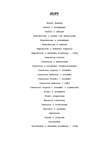 ZUPY Rosół domowy Rosół z Ŝołądkami Rosół z udkiem Pomidorowa z ryŜem lub makaronem Pomidorowa z Ŝołądkami Pomidorowa z udkiem Kapuśniak z kwaśnej kapusty Kapuśniak z wkładką kiełbasy – 100g Czernina czysta Czernina z makaronem Czernina z kluskami ziemniaczanymi Czernina czysta + Ŝołądki Czernina makaron + Ŝołądki Czernina kluski + Ŝołądki Czernina makaron + udko Czernina czysta + Ŝołądki + ziemniaki Flaki z Ŝołądków Flaki wieprzowe Barszcz czerwony Barszcz z krokietem Barszcz z uszkami Ogórkowa śurek z jajkiem Grochówka Grochówka z wkładką kiełbasy – 100g DANIA GORĄCE śołądki z cebulką śołądki w sosie pirackim śołądki w sosie bolonez śołądki w sosie pieczarkowym śołądki w sosie koperkowym Gulasz z Ŝołądków śołądki w potrawce + ryŜ Wątróbka drobiowa Wątróbka wieprzowa Kurczak w potrawce + ryŜ Kurczak po piracku Kurczak pieczony – udko Kurczak gotowany – udko Kaczka pieczona – udko z sosem własnym Gulasz drobiowy „Bolonez” Gulasz drobiowy „Piracki” Gulasz wieprzowy Kotlet mielony Kotlet mielony z jajkiem Stek wieprzowy Stek z polędwicy wieprzowej Zrazy wieprzowe w sosie własnym Zrazy wołowe w sosie własnym Karkówka pieczona + sos Karkówka faszerowana + sos DANIA GORĄCE Kotlet drobiowy Kotlet schabowy Kotlet drobiowy „Bolonez” Kotlet schabowy „Bolonez” Kotlet drobiowy „Słoneczny” Kotlet schabowy „Słoneczny” Kotlet drobiowy „Hawajski” Kotlet schabowy „Hawajski” Dewolay śeberka w sosie pieczeniowym śeberka w sosie pieczarkowym śeberka w sosie pirackim Golonka gotowana Golonka opiekana Gołąbek w sosie pomidorowym Gołąbek w sosie pirackim Kiełbasa smaŜona Bigos domowy Fasolka po bretońsku Jajecznica na maśle ( 3 jajka ) Jajecznica na boczku ( 3 jajka ) Spaghetti Hamburger DANIA MĄCZNE Placek cygański ( gulasz wieprzowy ) Placek ziemniaczany z gulaszem drobiowym w sosie pieczeniowym lub pirackim Placek ziemniaczany po piracku Z Ŝołądkami drobiowymi Naleśniki z serem lub dŜemem( 2 szt. ) Kluski z kwaśną kapustą lub z serem Pierogi z mięsem – 6 szt. Pierogi z kapustą i grzybami – 6 szt. Pierogi z serem – 6 szt. RYBY Filet z dorsza Filet z dorsza „Bolonez” Halibut dzwonko Śledź w śmietanie SURÓWKI Zestaw ( kapusta biała i pekińska, marchewka, por) Surówka z pora Surówka z marchewki Surówka z kapusty białej z porem Kapusta biała Kapusta kwaśna Kapusta pekińska Kapusta kwaśna gotowana Kapusta zasmaŜana Kapusta czerwona zasmaŜana Groszek z marchewką Mizeria Ogórek konserwowy Ogórek kiszony Buraki ćwikłowe Warzywa gotowane na parze ( brokuły, kalafior, fasolka, marchewka ) DODATKI DO DAŃ Ziemniaki Frytki Talarki Ziemniaki opiekane Kasza gryczana Makaron RyŜ Kopytka Bułka Chleb Chrzan Musztarda Ketchup Sos tatarski Sos czosnkowy NAPOJE Kompot wiśniowy lub truskawkowy Maślanka Herbata Lipton - saszetka Kawa parzona Kawa rozpuszczalna Kawa z ekspresu Kawa Latte Machiato Kawa cappuccino Śmietanka do kawy