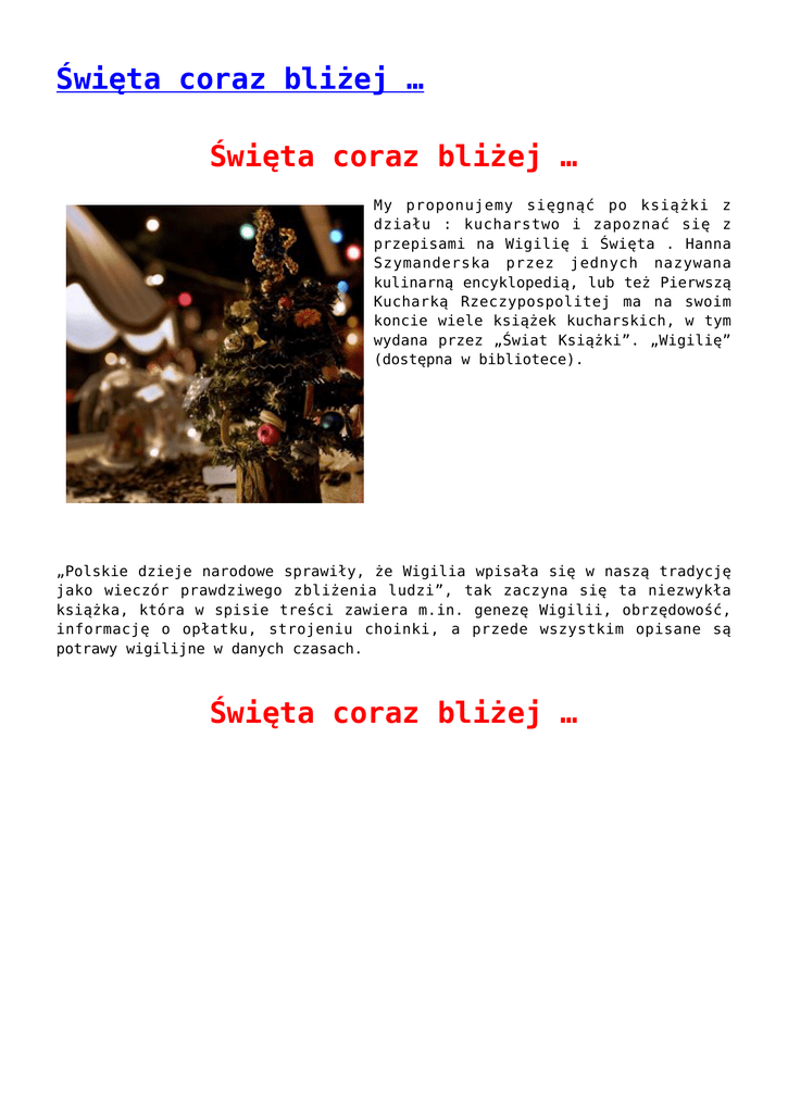 Święta coraz bliżej … Święta coraz bliżej … My proponujemy sięgnąć po książki z działu : kucharstwo i zapoznać się z przepisami na Wigilię i Święta . Hanna Szymanderska przez jednych nazywana kulinarną encyklopedią, lub też Pierwszą Kucharką Rzeczypospolitej ma na swoim koncie wiele książek kucharskich, w tym wydana przez „Świat Książki”. „Wigilię” (dostępna w bibliotece). „Polskie dzieje narodowe sprawiły, że Wigilia wpisała się w naszą tradycję jako wieczór prawdziwego zbliżenia ludzi”, tak zaczyna się ta niezwykła książka, która w spisie treści zawiera m.in. genezę Wigilii, obrzędowość, informację o opłatku, strojeniu choinki, a przede wszystkim opisane są potrawy wigilijne w danych czasach. Święta coraz bliżej … My proponujemy sięgnąć po książki z działu : kucharstwo i zapoznać się z przepisami na Wigilię i Święta . Hanna Szymanderska przez jednych nazywana kulinarną encyklopedią, lub też Pierwszą Kucharką Rzeczypospolitej ma na swoim koncie wiele książek kucharskich, w tym wydana przez „Świat Książki”. „Wigilię” (dostępna w bibliotece). „Polskie dzieje narodowe sprawiły, że Wigilia wpisała się w naszą tradycję jako wieczór prawdziwego zbliżenia ludzi”, tak zaczyna się ta niezwykła książka, która w spisie treści zawiera m.in. genezę Wigilii, obrzędowość, informację o opłatku, strojeniu choinki, a przede wszystkim opisane są potrawy wigilijne w danych czasach. „To przez tradycję wyróżniany jest majestat człowieka” napisał Cyprian Kamil Norwid. Autorka w sposób przystępny opisała ten wyjątkowy wieczór . Nazwę „Wigilia” Kościół katolicki przyjął z terminologii starożytnego Rzymu (łac. Vigiliae – nocne czuwanie) Początkiem wieczerzy wigilijnej były w dawnych wiekach wielogodzinne widowiska kościelne, na które wierni przynosili jedzenie i napoje. Dwa tysiące lat chrześcijaństwa ugruntowały ostatecznie chrześcijańską treść tego święta. Z Wigilią ściśle związane są takie pojęcia jak: gwiazdka, opłatek, kolędy, pastorałki, pasterka, jasełka, szopka, choinka, kutia… Do wieczerzy wigilijnej zasiadano, gdy na niebie ukazała się pierwsza gwiazda. Do wierzeń i obrzędów wigilijnych należały i wierzono, że kto we „wigilię od stołu odejdzie przed zakończeniem, to umrze i drugiej wieczerzy wigilijnej nie doczeka”. Wierzono, że kto w Wigilię kichnie, ten zdrów będzie przez cały rok. Wiele potraw gotowano z rzepy, z nadzieją, że uchroni to przed bólem zębów. Jabłka jedzone podczas wieczerzy wigilijnej miały zapobiec bólowi gardła, orzechy bólowi zębów. Wierzono też, że nieposzanowanie tego wieczoru sprowadzić może wszelkie nieszczęście, dlatego po zachodzie słońca nie należało niczego robić. W Wigilię przed zmrokiem należało przynieść węgla, wody, drewna na całe Boże Narodzenie, wierzono bowiem, że jeśli coś się wniesie do domu po wieczerzy, wszystko myszy zjedzą . W Wigilie niechętnie cokolwiek pożyczano, uważano bowiem, że kto tego dnia coś z domu swojego wydaje, ten niczego się nie dorobi. Należało też uważać, aby pierwszy do domu wszedł mężczyzna, a nie kobieta, bowiem to on wróżył na cały rok zdrowie, a kobieta przynosiła choroby. Wiele jeszcze innych zwyczajów, jest opisanych, zachęcamy do przeczytania, warto, gdyż często zapominamy o tradycji, upraszczamy ją w imię nowoczesności, pośpiechu, dlatego w tę jedną noc warto celebrować obrzędy naszych przodków. Jadłospis wigilijnych potraw był tak ułożony, aby uwzględnić wszystkie płody rolne i leśne z całego roku. Z lasu pochodziły grzyby, orzechy, miód, z pola kasza, rośliny oleiste, zboża, jarzyny, owoce, z rzek i jezior ryby, a typowymi potrawami były: barszcz z buraków, zupa grzybowa, bigos postny, kasza jaglana ze śliwkami suszonymi, groch, fasola, kisiel z owsa, piernik, jabłka, orzechy. Każdy region Polski miał swoją tradycję i swoje potrawy wigilijne. Autorka jest zwolenniczką bezmięsnej wieczerzy wigilijnej opartej na tradycyjnych przepisach. Jak zrobić karpia i nie tylko, ugotować zupę grzybową, barszcz, rybną – radzimy po prostu przyjść do biblioteki i wypożyczyć książkę. Książki które warto przeczytać przed świętami: Bożena Dykiel – Moje sekrety kulinarne i rozdział „Moja Wigilia”