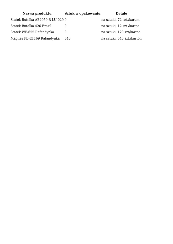 Nazwa produktu Sztuk w opakowaniu Detale Statek Butelka AE2059-B LU-029 0 na sztuki, 72 szt./karton Statek Butelka 426 Brazil 0 na sztuki, 12 szt./karton Statek WF-655 Rafandynka 0 na sztuki, 120 szt/karton Magnes PE-E1169 Rafandynka 540 na sztuki, 540 szt./karton