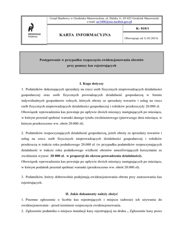 Urząd Skarbowy w Grodzisku Mazowieckim, ul. Daleka 11, 05-825 Grodzisk Mazowiecki e-mail: [email protected] K- 010/1 KARTA INFORMACYJNA Obowiązuje od 11.03.2013r. Postępowanie w przypadku rozpoczęcia ewidencjonowania obrotów przy pomocy kas rejestrujących I. Kogo dotyczy 1. Podatników dokonujących sprzedaży na rzecz osób fizycznych nieprowadzących działalności gospodarczej oraz osób fizycznych prowadzących działalność gospodarczą w formie indywidualnych gospodarstw rolnych, których obroty ze sprzedaży towarów i usług na rzecz osób fizycznych nieprowadzących działalności gospodarczej i rolników przekroczyły 20.000 zł. Obowiązek wprowadzenia kas powstaje po upływie dwóch miesięcy następujących po miesiącu, w którym przestał spełniać warunki danego tytułu zwolnieniowego (pierwszego dnia miesiąca, w którym przekroczono ww. obrót 20.000 zł). 2. Podatników rozpoczynających działalność gospodarczą, jeżeli obroty ze sprzedaży towarów i usług na rzecz osób fizycznych nieprowadzących działalności gospodarczej i rolników przekroczą w trakcie roku podatkowego 20.000 zł. (w przypadku podatników rozpoczynających działalność w trakcie roku podatkowego wielkość obrotów umożliwiających korzystanie ze zwolnienia wynosi 20 000 zł. w proporcji do okresu prowadzenia działalności). Obowiązek wprowadzenia kas powstaje po upływie dwóch miesięcy następujących po miesiącu, w którym podatnik przestał spełniać warunki (przekroczono ww. obrót 20.000 zł). 3. Podatników, którzy dobrowolnie podejmują ewidencjonowania obrotu przy zastosowaniu kas rejestrujących. II. Jakie dokumenty należy złożyć 1. Pisemne zgłoszenie o liczbie kas rejestrujących i miejscu (adresie) ich używania do ewidencjonowania - przed terminem rozpoczęcia ewidencjonowania. 2. Zgłoszenie podatnika o miejscu instalacji kasy rejestrującej na druku „ Zgłoszenie kasy przez podatnika” oraz zgłoszenie o miejscu instalacji kasy przez prowadzącego serwis kasy rejestrującej na druku „Zgłoszenia przez prowadzącego serwis kas fiskalizacji kasy”. III. Gdzie pobrać druki Formularze dotyczące podatnika można pobrać w siedzibie Urzędu w Sali Obsługi Podatnika lub za pomocą Internetu ze strony: www.is.waw.pl/USGgrodziskMaz/ w zakładce “Inne”/Druki do pobrania. IV. Terminy złożenia dokumentów 1. Przed terminem rozpoczęcia ewidencjonowania za pomocą kasy rejestrującej - należy złożyć pisemne zgłoszenie o liczbie kas rejestrujących. 2. Zgłoszenie kasy przez podatnika oraz zgłoszenie przez prowadzącego serwis kas fiskalizacji kasy – należy złożyć w terminie 7 dni od dnia fiskalizacji kasy rejestrującej. V. Tryb składania dokumentów W siedzibie Urzędu w Sali Obsługi Podatnika lub za pośrednictwem poczty. VI. Wymagane opłaty Opłaty nie występują. VII. Termin załatwienia sprawy Załatwienie sprawy wymagającej przeprowadzenia postępowania dowodowego powinno nastąpić bez zbędnej zwłoki, jednak nie później niż w ciągu miesiąca, a sprawy szczególnie skomplikowanej – nie później niż w ciągu 2 miesięcy od dnia wszczęcia postępowania. VIII. Sposób i forma załatwienia sprawy „Zgłoszenie kasy przez podatnika” jest przekazywane celem rozpatrzenia do właściwej merytorycznie komórki organizacyjnej Urzędu, która sprawdza, czy spełnione są wymogi określone przepisami prawa. Jeśli dokumenty są poprawne wydaje się zawiadomienie o nadaniu kasie numeru ewidencyjnego. Jeśli dokumenty posiadają błędy lub wymagają uzupełnienia, wzywa się podatnika do usunięcia braków, a następnie wydaje się zawiadomienie o nadaniu kasie rejestrującej numeru ewidencyjnego. Karta ma charakter informacyjny i nie stanowi wykładni prawa. Karta informacyjna: Postępowanie w przypadku rozpoczęcia ewidencjonowania obrotów przy pomocy kas rejestrujących Wydanie 1 z dnia 11.03.2013r. Karta nr K- 010/1 Strona 2 z 3 IX. Środki odwoławcze Brak środków odwoławczych. X. Dodatkowe informacje O zmianie miejsca użytkowania kasy rejestrującej ( miejsce użytkowania kasy zgodne z pozwoleniem na działalność) należy w formie pisemnej poinformować Naczelnika Urzędu Skarbowego w Grodzisku Mazowieckim. Szczegółowe informacje można uzyskać pod numerem telefonu: 22 77 06 310. XI. Podstawa prawna 1. Ustawa z dnia 29 sierpnia 1997 r. Ordynacja podatkowa ( t.j. Dz. U. z 2012 r., poz. 749 z późn. zm.). 2. Ustawa z dnia 11 marca 2004 r. o podatku od towarów i usług (Dz. U. z 2011 r. Nr 177, poz. 1054 z późn. zm.). 3. Rozporządzenie Ministra Finansów z dnia 28 listopada 2008 r. w sprawie kryteriów i warunków technicznych, którym muszą odpowiadać kasy rejestrujące, oraz warunków ich stosowania ( Dz. U. Nr 212, poz. 1338 z późn. zm.). 4. Rozporządzenie Ministra Finansów z dnia 27 grudnia 2010 r. w sprawie odliczania i zwrotu kwot wydatkowanych na zakup kas rejestrujących (t.j. Dz. U. z 2013r., poz.163). 5. Rozporządzenie Ministra Finansów z dnia 29 listopada 2012 r. w sprawie zwolnień z obowiązku prowadzenia ewidencji przy zastosowaniu kas rejestrujących (Dz. U. z 2012r., poz. 1382). Karta ma charakter informacyjny i nie stanowi wykładni prawa. Karta informacyjna: Postępowanie w przypadku rozpoczęcia ewidencjonowania obrotów przy pomocy kas rejestrujących Wydanie 1 z dnia 11.03.2013r. Karta nr K- 010/1 Strona 3 z 3