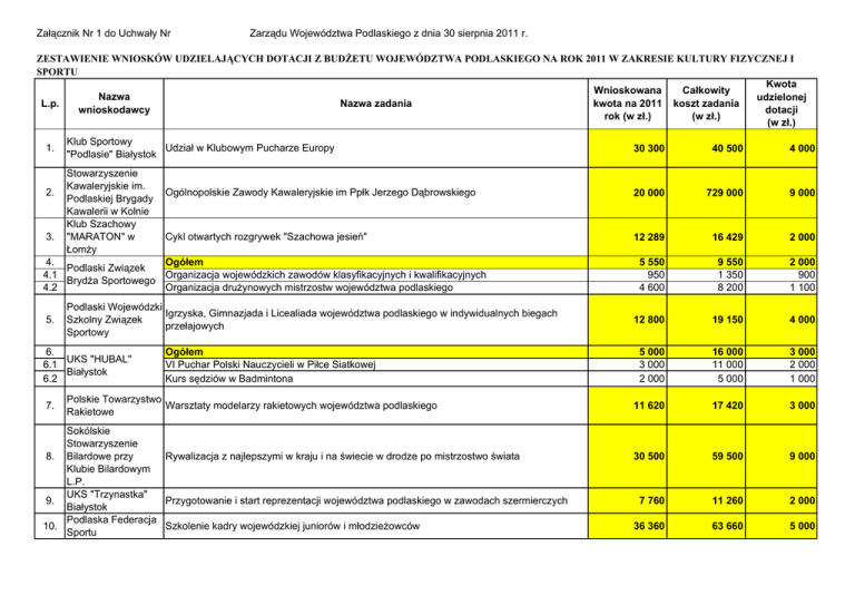 Załącznik Nr 1 do Uchwały Nr Zarządu Województwa Podlaskiego z dnia 30 sierpnia 2011 r. ZESTAWIENIE WNIOSKÓW UDZIELAJĄCYCH DOTACJI Z BUDŻETU WOJEWÓDZTWA PODLASKIEGO NA ROK 2011 W ZAKRESIE KULTURY FIZYCZNEJ I SPORTU Kwota Wnioskowana Całkowity Nazwa udzielonej L.p. Nazwa zadania kwota na 2011 koszt zadania wnioskodawcy dotacji rok (w zł.) (w zł.) (w zł.) 1. Klub Sportowy Udział w Klubowym Pucharze Europy "Podlasie" Białystok 30 300 40 500 4 000 Ogólnopolskie Zawody Kawaleryjskie im Ppłk Jerzego Dąbrowskiego 20 000 729 000 9 000 Cykl otwartych rozgrywek "Szachowa jesień" 12 289 16 429 2 000 Ogółem 4. Podlaski Związek Organizacja wojewódzkich zawodów klasyfikacyjnych i kwalifikacyjnych 4.1 Brydża Sportowego 4.2 Organizacja drużynowych mistrzostw województwa podlaskiego 5 550 950 4 600 9 550 1 350 8 200 2 000 900 1 100 12 800 19 150 4 000 5 000 3 000 2 000 16 000 11 000 5 000 3 000 2 000 1 000 11 620 17 420 3 000 30 500 59 500 9 000 7 760 11 260 2 000 36 360 63 660 5 000 2. 3. 5. Stowarzyszenie Kawaleryjskie im. Podlaskiej Brygady Kawalerii w Kolnie Klub Szachowy "MARATON" w Łomży Podlaski Wojewódzki Igrzyska, Gimnazjada i Licealiada województwa podlaskiego w indywidualnych biegach Szkolny Związek przełajowych Sportowy 6. UKS "HUBAL" 6.1 Białystok 6.2 7. Ogółem VI Puchar Polski Nauczycieli w Piłce Siatkowej Kurs sędziów w Badmintona Polskie Towarzystwo Warsztaty modelarzy rakietowych województwa podlaskiego Rakietowe Sokólskie Stowarzyszenie 8. Bilardowe przy Rywalizacja z najlepszymi w kraju i na świecie w drodze po mistrzostwo świata Klubie Bilardowym L.P. UKS "Trzynastka" Przygotowanie i start reprezentacji województwa podlaskiego w zawodach szermierczych 9. Białystok Podlaska Federacja Szkolenie kadry wojewódzkiej juniorów i młodzieżowców 10. Sportu L.p. Nazwa wnioskodawcy Podlaskie 11. Zrzeszenie Ludowe Zespoły Sportowe Augustowskie 12. Towarzystwo Pływackie UKŻ "GROT" w 13. Suwałkach Białostocki Klub 14. Karate Kyokushin "KANKU" 15. Międzyszkolny Klub 15.1 Sportowy "Juvenia" 15.2 w Białymstoku UKS "Osiedla 16. Bacieczki" w Białymstoku LUKS "Orient 17. Sokółka" Białostocki Klub 18. Sportowy Podlasie 4G 19. Wnioskowana kwota na 2011 rok (w zł.) Nazwa zadania Kwota udzielonej dotacji (w zł.) Organizacja imprez sportowych 13 770 20 650 3 000 I Półmaraton Augustowski 24 850 54 600 7 000 Regaty żeglarskie o "Puchar Karola Jabłońskiego" 5 000 6 770 2 500 Przygotowanie i udział zawodników Białostockiego Klubu Karate Kyokushin "KANKU" w rywalizacji sportowej oraz udział w międzynarodowych obozach sportowo-szkoleniowych 8 000 11 444,70 2 000 Ogółem Organizacja XII Biegu Godzinnego, Coopera i 6 - minutowego Organizacja XXVIII Biegu Sylwestrowego 10 000 5 000 5 000 16 440 8 200 8 240 3 000 1 500 1 500 XI Bieg Niepodległości 12 450 19 430 1 500 II Turniej o Puchar Marszałka Województwa Podlaskiego i Podlaskiego Kuratora Oświaty z okazji Dnia Edukacji Narodowej - szachy dla wszystkich 11 500 26 650 4 000 Strzeleckie Mistrzostwa Województwa Podlaskiego - Uniwersjada Podlaska 41 200 52 500 2 000 Ogółem Przygotowanie i start reprezentacji województwa podlaskiego we współzawodnictwie młodzieżowym 15 000 30 000 2 000 10 000 20 000 1 000 5 000 10 000 1 000 6 200 8 240 4 000 11 640 15 550 2 000 331 789,00 1 244 743,70 76 000,00 19.1 MUKS "STOCZEK 45" Białystok 19.2 Organizacja ogólnopolskich i wojewódzkich zawodów klasyfikacyjnych i kwalifikacyjnych Klub Żeglarski "Zefir" w Łomży Yacht Club "ARCUS" 21. w Łomży Regaty żeglarskie "Zakończenie Sezonu Żeglarskiego 2011" połączone z seminarium; Doskonalenie pracy szkoleniowo-wychowawczej z młodzieżą poprzez żeglarstwo Propagowanie sportu wśród młodzieży akademickiej, wiejskiej i osób niepełnosprawnych poprzez organizowanie imprez żeglarskich i bojerowych 20. Całkowity koszt zadania (w zł.) RAZEM