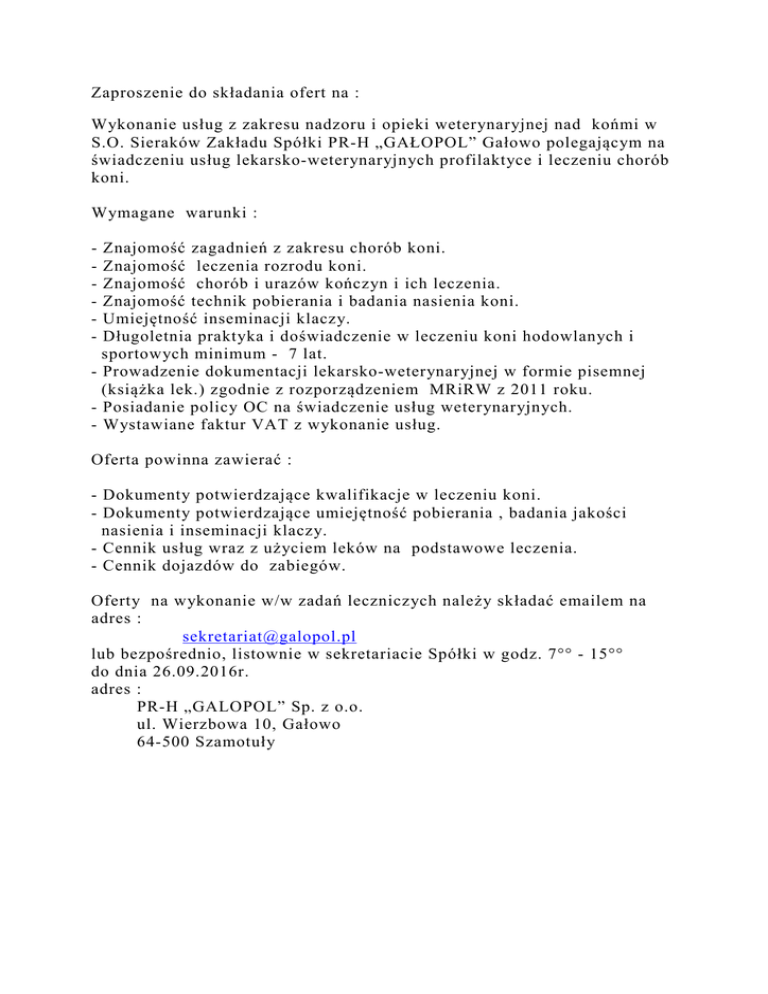Zaproszenie do składania ofert na : Wykonanie usług z zakresu nadzoru i opieki weterynaryjnej nad końmi w S.O. Sieraków Zakładu Spółki PR-H „GAŁOPOL” Gałowo polegającym na świadczeniu usług lekarsko-weterynaryjnych profilaktyce i leczeniu chorób koni. Wymagane warunki : - Znajomość zagadnień z zakresu chorób koni. Znajomość leczenia rozrodu koni. Znajomość chorób i urazów kończyn i ich leczenia. Znajomość technik pobierania i badania nasienia koni. Umiejętność inseminacji klaczy. Długoletnia praktyka i doświadczenie w leczeniu koni hodowlanych i sportowych minimum - 7 lat. - Prowadzenie dokumentacji lekarsko-weterynaryjnej w formie pisemnej (książka lek.) zgodnie z rozporządzeniem MRiRW z 2011 roku. - Posiadanie policy OC na świadczenie usług weterynaryjnych. - Wystawiane faktur VAT z wykonanie usług. Oferta powinna zawierać : - Dokumenty potwierdzające kwalifikacje w leczeniu koni. - Dokumenty potwierdzające umiejętność pobierania , badania jakości nasienia i inseminacji klaczy. - Cennik usług wraz z użyciem leków na podstawowe leczenia. - Cennik dojazdów do zabiegów. Oferty na wykonanie w/w zadań leczniczych należy składać emailem na adres : [email protected] lub bezpośrednio, listownie w sekretariacie Spółki w godz. 7°° - 15°° do dnia 26.09.2016r. adres : PR-H „GALOPOL” Sp. z o.o. ul. Wierzbowa 10, Gałowo 64-500 Szamotuły