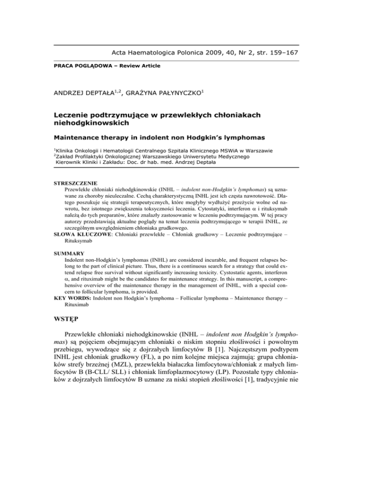 Acta Haematologica Polonica 2009, 40, Nr 2, str. 159–167 PRACA POGLĄDOWA – Review Article ANDRZEJ DEPTAŁA1,2, GRAśYNA PAŁYNYCZKO1 Leczenie podtrzymujące w przewlekłych chłoniakach niehodgkinowskich Maintenance therapy in indolent non Hodgkin’s lymphomas 1 Klinika Onkologii i Hematologii Centralnego Szpitala Klinicznego MSWiA w Warszawie Zakład Profilaktyki Onkologicznej Warszawskiego Uniwersytetu Medycznego Kierownik Kliniki i Zakładu: Doc. dr hab. med. Andrzej Deptała 2 STRESZCZENIE Przewlekłe chłoniaki niehodgkinowskie (INHL – indolent non-Hodgkin’s lymphomas) są uznawane za choroby nieuleczalne. Cechą charakterystyczną INHL jest ich częsta nawrotowość. Dlatego poszukuje się strategii terapeutycznych, które mogłyby wydłuŜyć przeŜycie wolne od nawrotu, bez istotnego zwiększenia toksyczności leczenia. Cytostatyki, interferon α i rituksymab naleŜą do tych preparatów, które znalazły zastosowanie w leczeniu podtrzymującym. W tej pracy autorzy przedstawiają aktualne poglądy na temat leczenia podtrzymującego w terapii INHL, ze szczególnym uwzględnieniem chłoniaka grudkowego. SŁOWA KLUCZOWE: Chłoniaki przewlekłe – Chłoniak grudkowy – Leczenie podtrzymujące – Rituksymab SUMMARY Indolent non-Hodgkin’s lymphomas (INHL) are considered incurable, and frequent relapses belong to the part of clinical picture. Thus, there is a continuous search for a strategy that could extend relapse free survival without significantly increasing toxicity. Cystostatic agents, interferon α, and rituximab might be the candidates for maintenance strategy. In this manuscript, a comprehensive overview of the maintenance therapy in the management of INHL, with a special concern to follicular lymphoma, is provided. KEY WORDS: Indolent non Hodgkin’s lymphoma – Follicular lymphoma – Maintenance therapy – Rituximab WSTĘP Przewlekłe chłoniaki niehodgkinowskie (INHL – indolent non Hodgkin’s lymphomas) są pojęciem obejmującym chłoniaki o niskim stopniu złośliwości i powolnym przebiegu, wywodzące się z dojrzałych limfocytów B [1]. Najczęstszym podtypem INHL jest chłoniak grudkowy (FL), a po nim kolejne miejsca zajmują: grupa chłoniaków strefy brzeŜnej (MZL), przewlekła białaczka limfocytowa/chłoniak z małych limfocytów B (B-CLL/ SLL) i chłoniak limfoplazmocytowy (LP). Pozostałe typy chłoniaków z dojrzałych limfocytów B uznane za niski stopień złośliwości [1], tradycyjnie nie 160 A. DEPTAŁA, G. PAŁYNYCZKO są zaliczane do chłoniaków przewlekłych z uwagi na odmienny przebieg kliniczny i róŜnice w sposobie leczenia. Cechą charakterystyczną INHL są częste nawroty. Znikoma wyleczalność oraz wysoka nawrotowość INHL spowodowały, Ŝe poszukiwano strategii terapeutycznej, która zastosowana u pacjentów odpowiadających na leczenie indukcyjne, poskutkowałaby wydłuŜeniem przeŜycia, przy zachowaniu niskiej toksyczności. Uwaga badaczy skupiła się na leczeniu podtrzymującym. CHEMIOTERAPIA PODTRZYMUJĄCA W randomizowanym badaniu grupy ECOG [2] porównano chemioterapię podtrzymującą BCVP (BCNU + cyklofosfamid + winkrystyna + prednizon) podawaną chorym z CR co 6 tygodni przez 18 miesięcy, z wyłączną obserwacją. Mediana przeŜycia wolnego od progresji (PFS) w ramieniu podtrzymującym była statystycznie znamiennie dłuŜsza (p=0,02) i wyniosła 3,2 lat w porównaniu z 2 latami w ramieniu obserwowanym. Nie uzyskano wydłuŜenia przeŜycia całkowitego (OS). Obserwowano przedłuŜone cytopenie po chemioterapii. W randomizowanym badaniu brytyjskim [3] w ramieniu podtrzymującym stosowano doustnie chlorambucil (w sposób przerywany) przez 2 lata u chorych na INHL, którzy uzyskali CR po chemioterapii CVP. W ramieniu tym mediana przeŜycia wolnego od nawrotu (RFS) wyniosła 41 miesięcy i była statystycznie znamiennie dłuŜsza (p=0,045) niŜ w ramieniu obserwowanym; nie uzyskano wydłuŜenia OS. Tylko 38% pacjentów ukończyło pełne 2-letnie leczenie podtrzymujące chlorambucilem. Przyczyną przedwczesnego zakończenia podtrzymywania były: progresja chłoniaka lub małopłytkowość polekowa. INTERFERON ALFA W LECZENIU PODTRZYMUJĄCYM W 1996 r. meksykańscy badacze [4] udowodnili u chorych na INHL, iŜ podawanie IFNα (3 razy w tygodniu po 5 MU przez 1 rok) powoduje statystycznie znamienne wydłuŜenie czasu trwania CR w porównaniu do obserwacji (po 9 latach 62% CR w ramieniu z vs. 25% w grupie kontrolnej; p<0,001) oraz OS (w ramieniu z IFNα mediana OS nieosiągnięta vs. 74 miesiące w grupie kontrolnej; p<0,001). Badanie Zespołu ds. Chłoniaków grupy EORTC objęło 347 chorych na INHL w III i IV stadium zaawansowania [5]. Interferon alfa 2a zastosowano w leczeniu podtrzymującym, (3 MU 3x w tyg. przez 1 rok) u 122 pacjentów, którzy uzyskali CR, PR lub SD (stable disease) po 8 cyklach chemioterapii CVP. Czas do progresji chłoniaka (TTP) w ramieniu z IFNα2a był dłuŜszy (132 tygodnie) w porównaniu do ramienia obserwowanego (87 tygodni), ale na granicy znamienności statystycznej (p=0,054). Mediany 3-letnich PFS i OS były zbliŜone w obu ramionach (odpowiednio 44% vs. 38% i 85% vs. 90%). Z powodu toksyczności leczenie podtrzymujące IFNα2a przerwało 15% chorych. Objawy niepoŜądane związane z IFNα2a w stopniach G3 i G4 wystąpiły u kilku procent chorych i obejmowały: zespół grypopodobny, zaburzenia czynności wątroby, leukopenię i małopłytkowość. Leczenie podtrzymujące w INHL 161 W badaniu III fazy SWOG, 571 chorych na INHL w III i IV stadium zaawansowania otrzymało w leczeniu indukującym 6–8 cykli chemioterapii wg schematu ProMACE-MOPP, a następnie po uzyskaniu CR lub PR było randomizowanych do leczenia podtrzymującego za pomocą IFNα2b (2 MU/m2 3 × w tyg. przez 2 lata) lub do obserwacji [6]. Po upływie ponad 6 lat od randomizacji mediana PFS w ramieniu z IFNα2b wyniosła 4,1 lat, a w ramieniu obserwowanym 3,2 lat. RóŜnica nie była statystycznie istotna (p=0,25). 