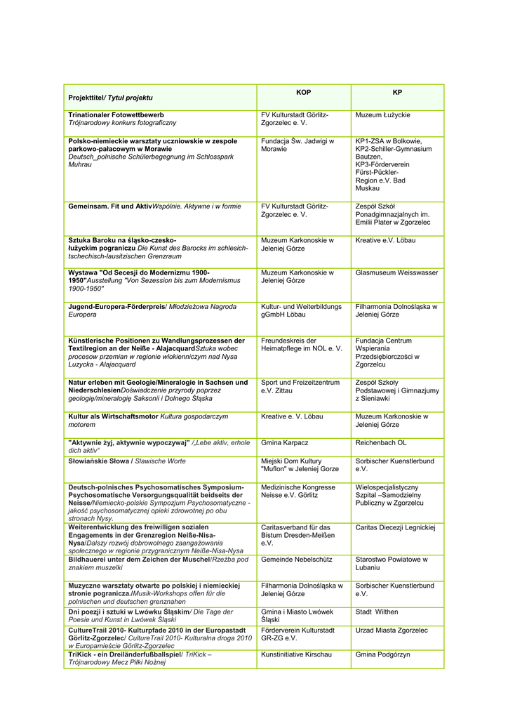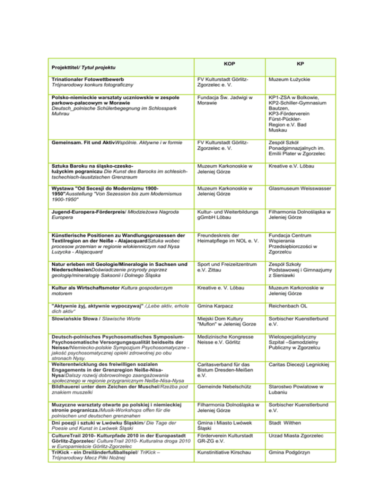 Projekttitel/ Tytuł projektu KOP KP Trinationaler Fotowettbewerb Trójnarodowy konkurs fotograficzny FV Kulturstadt GörlitzZgorzelec e. V. Muzeum Łużyckie Polsko-niemieckie warsztaty uczniowskie w zespole parkowo-pałacowym w Morawie Deutsch_polnische Schülerbegegnung im Schlosspark Muhrau Fundacja Św. Jadwigi w Morawie KP1-ZSA w Bolkowie, KP2-Schiller-Gymnasium Bautzen, KP3-Förderverein Fürst-PücklerRegion e.V. Bad Muskau Gemeinsam. Fit und AktivWspólnie. Aktywne i w formie FV Kulturstadt GörlitzZgorzelec e. V. Zespół Szkół Ponadgimnazjalnych im. Emilii Plater w Zgorzelec Sztuka Baroku na śląsko-czeskołużyckim pograniczu Die Kunst des Barocks im schlesichtschechisch-lausitzischen Grenzraum Muzeum Karkonoskie w Jeleniej Górze Kreative e.V. Löbau Wystawa "Od Secesji do Modernizmu 19001950"Ausstellung "Von Sezession bis zum Modernismus 1900-1950" Muzeum Karkonoskie w Jeleniej Górze Glasmuseum Weisswasser Jugend-Europera-Förderpreis/ Młodzieżowa Nagroda Europera Kultur- und Weiterbildungs gGmbH Löbau Filharmonia Dolnośląska w Jeleniej Górze Künstlerische Positionen zu Wandlungsprozessen der Textilregion an der Neiße - AlajacquardSztuka wobec procesow przemian w regionie wlokienniczym nad Nysa Luzycka - Alajacquard Freundeskreis der Heimatpflege im NOL e. V. Fundacja Centrum Wspierania Przedsiębiorczości w Zgorzelcu Natur erleben mit Geologie/Mineralogie in Sachsen und NiederschlesienDoświadczenie przyrody poprzez geologię/mineralogię Saksonii i Dolnego Śląska Sport und Freizeitzentrum e.V. Zittau Zespół Szkoły Podstawowej i Gimnazjumy z Sieniawki Kultur als Wirtschaftsmotor Kultura gospodarczym motorem Kreative e. V. Löbau Muzeum Karkonoskie w Jeleniej Górze "Aktywnie żyj, aktywnie wypoczywaj" /„Lebe aktiv, erhole dich aktiv“ Gmina Karpacz Reichenbach OL Słowiańskie Słowa / Slawische Worte Miejski Dom Kultury "Muflon" w Jeleniej Gorze Sorbischer Kuenstlerbund e.V. Deutsch-polnisches Psychosomatisches SymposiumPsychosomatische Versorgungsqualität beidseits der Neisse/Niemiecko-polskie Sympozjum Psychosomatyczne jakość psychosomatycznej opieki zdrowotnej po obu stronach Nysy. Weiterentwicklung des freiwilligen sozialen Engagements in der Grenzregion Neiße-NisaNysa/Dalszy rozwój dobrowolnego zaangażowania społecznego w regionie przygranicznym Neiße-Nisa-Nysa Bildhauerei unter dem Zeichen der Muschel/Rzeźba pod znakiem muszelki Medizinische Kongresse Neisse e.V. Görlitz Wielospecjalistyczny Szpital –Samodzielny Publiczny w Zgorzelcu Caritasverband für das Bistum Dresden-Meißen e.V. Caritas Diecezji Legnickiej Gemeinde Nebelschütz Starostwo Powiatowe w Lubaniu Muzyczne warsztaty otwarte po polskiej i niemieckiej stronie pogranicza./Musik-Workshops offen für die polnischen und deutschen grenznahen Filharmonia Dolnośląska w Jeleniej Górze Sorbischer Kuenstlerbund e.V. Dni poezji i sztuki w Lwówku Śląskim/ Die Tage der Poesie und Kunst in Lwówek Śląski Gmina i Miasto Lwówek Śląski Stadt Wilthen CultureTrail 2010- Kulturpfade 2010 in der Europastadt Görlitz-Zgorzelec/ CultureTrail 2010- Kulturalna droga 2010 w Europamieście Görlitz-Zgorzelec TriKick - ein Dreiländerfußballspiel/ TriKick – Trójnarodowy Mecz Piłki Nożnej Förderverein Kulturstadt GR-ZG e.V. Urzad Miasta Zgorzelec Kunstinitiative Kirschau Gmina Podgórzyn 675-lecie partnerstwa przygranicznego Radomierzyce – Nikrisch/ 675 Jahre der grenzübergreifenden Partnerschaft Radomierzyce - Nikrisch Wege zur Natur - Erziehung im Garten für das Leben lernen/ Drogi do natury - ogród jako aspekt wychowawczy życia Gmina Zgorzelec Verein Hagenwerder Förderverein Fürst Pückler Region e.V. Bad Muskau KP1. Fundacja Dominium Łomnica/ KP2. KITA Kinderland Weißwasser Letnia Akademia Filmowa i Fotograficzna/ Sommerakademie für Film und Fotografie Stowarzyszenie Kuźnia Zgorzelec CaTeeDrale e.V. Görlitz Jesteśmy na scenie / Wir sind auf der Bühne Stowarzyszenie Kuźnia Zgorzelec CaTeeDrale e.V. Görlitz 50 PLUS 50 PLUS Zwei Länder, Ein-Klang Dwa państwa, jeden dźwięk Dolnośląski Wojewódzki Urząd Pracy w Wałbrzychu Diakoniewerk Oberlausitz e.V. Großhennersdorf Landratsamt Görlitz Landratsamt Görlitz Umweltbibliothek Großhennersdorf e.V. Fundacja Kultury Ekologicznej Jelenia Góra Fundacja Kultury Ekologicznej Jelenia Góra Girls Culture 2010 - Grenzen überwinden Girls Culture 2010- przełamywanie granic Dreiländereckskontakte Międzypaństwowe kontakty w Trójstyku Strategische Entwicklung des deutsch-polnischen Grenzraumes Strategiczny rozwój polsko-niemieckiego obszaru przygranicznego Współpraca samorządów szansą na rozwój regionu Die Kooperation der Verwaltungen - eine Chance auf die Entwicklung der Region "Oberlausitzer Kartoffeltage" "Górnołużyckie Dni Ziemniaka" Muzyka poważna we współczesnych aranżacjach warsztaty otwarte Klassische Musik im gegenwärtigen Arrangements – Die offene Werkstätte Święto plonów - promocja polskich i niemieckich tradycji Erntefest – Promotion der polnischen und deutschen Traditionen Studie „Analyse der ÖPNV/SPNV-Rahmenbedingungen im Dreiländereck“ „Analiza warunków ramowych publicznego transportu zbiorowego w trójstyku państw” Nasza historia, wspólnota, przyszłość Unsere Geschichte, Gesellschaft, Zukunft "5 Jahre brennende Partnerschaft" "5 lat płonącej współpracy partnerskiej" Nasz Dom Ostatni Unser letztes Haus "Berufsorientierung ohne Grenzen" "Orientacja zawodowa bez granic" Inwentaryzacja zasobów turystycznych Borów Dolnośląskich i Powiatu Görlitz i ich promocja Inventarisierung der touristischen Ressourcen von Bory Dolnośląskie und dem Landkreises Görlitz und deren Werbung Transgraniczna promocja miasta Jelenia Góra oraz gminy Boxberg O.L. Die grenzübergreifende Werbung der Stadt Jelenia Góra und der Gemeinde Boxberg O.L. Die grenzübergreifende Werbung der Gemeinde Boxberg O.L. und der Stadt Jelenia Góra Transgraniczna promocja gminy Boxberg O.L ora