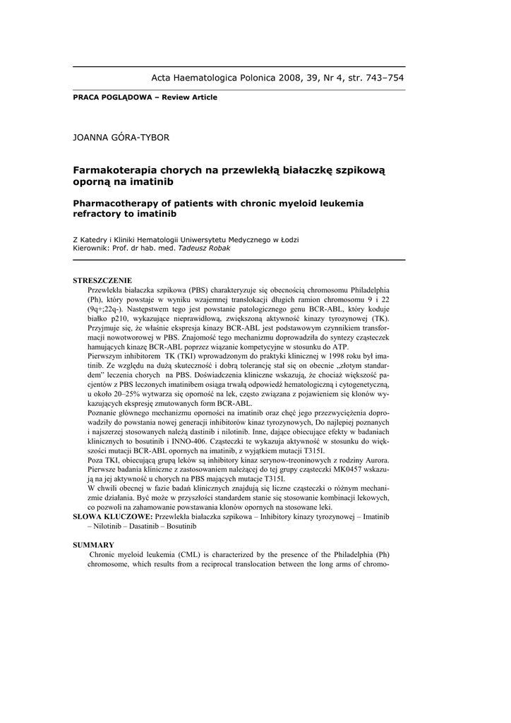 Acta Haematologica Polonica 2008, 39, Nr 4, str. 743–754 PRACA POGLĄDOWA – Review Article JOANNA GÓRA-TYBOR Farmakoterapia chorych na przewlekłą białaczkę szpikową oporną na imatinib Pharmacotherapy of patients with chronic myeloid leukemia refractory to imatinib Z Katedry i Kliniki Hematologii Uniwersytetu Medycznego w Łodzi Kierownik: Prof. dr hab. med. Tadeusz Robak STRESZCZENIE Przewlekła białaczka szpikowa (PBS) charakteryzuje się obecnością chromosomu Philadelphia (Ph), który powstaje w wyniku wzajemnej translokacji długich ramion chromosomu 9 i 22 (9q+;22q-). Następstwem tego jest powstanie patologicznego genu BCR-ABL, który koduje białko p210, wykazujące nieprawidłową, zwiększoną aktywność kinazy tyrozynowej (TK). Przyjmuje się, Ŝe właśnie ekspresja kinazy BCR-ABL jest podstawowym czynnikiem transformacji nowotworowej w PBS. Znajomość tego mechanizmu doprowadziła do syntezy cząsteczek hamujących kinazę BCR-ABL poprzez wiązanie kompetycyjne w stosunku do ATP. Pierwszym inhibitorem TK (TKI) wprowadzonym do praktyki klinicznej w 1998 roku był imatinib. Ze względu na duŜą skuteczność i dobrą tolerancję stał się on obecnie „złotym standardem” leczenia chorych na PBS. Doświadczenia kliniczne wskazują, Ŝe chociaŜ większość pacjentów z PBS leczonych imatinibem osiąga trwałą odpowiedź hematologiczną i cytogenetyczną, u około 20–25% wytwarza się oporność na lek, często związana z pojawieniem się klonów wykazujących ekspresję zmutowanych form BCR-ABL. Poznanie głównego mechanizmu oporności na imatinib oraz chęć jego przezwycięŜenia doprowadziły do powstania nowej generacji inhibitorów kinaz tyrozynowych, Do najlepiej poznanych i najszerzej stosowanych naleŜą dastinib i nilotinib. Inne, dające obiecujące efekty w badaniach klinicznych to bosutinib i INNO-406. Cząsteczki te wykazuja aktywność w stosunku do większości mutacji BCR-ABL opornych na imatinib, z wyjątkiem mutacji T315I. Poza TKI, obiecującą grupą leków są inhibitory kinaz serynow-treoninowych z rodziny Aurora. Pierwsze badania kliniczne z zastosowaniem naleŜącej do tej grupy cząsteczki MK0457 wskazują na jej aktywność u chorych na PBS mających mutacje T315I. W chwili obecnej w fazie badań klinicznych znajdują się liczne cząsteczki o róŜnym mechanizmie działania. Być moŜe w przyszłości standardem stanie się stosowanie kombinacji lekowych, co pozwoli na zahamowanie powstawania klonów opornych na stosowane leki. SŁOWA KLUCZOWE: Przewlekła białaczka szpikowa – Inhibitory kinazy tyrozynowej – Imatinib – Nilotinib – Dasatinib – Bosutinib SUMMARY Chronic myeloid leukemia (CML) is characterized by the presence of the Philadelphia (Ph) chromosome, which results from a reciprocal translocation between the long arms of chromo- 744 J. GÓRA-TYBOR somes 9 and 22 t(9;22)(q34;q11). This translocation creates two new genes, BCR-ABL on the 22q- (Ph chromosome) and the reciprocal ABL-BCR on 9q-. The BCR-ABL gene encodes a 210-kD protein with deregulated tyrosine kinase (TK) activity, which is crucial for malignant transformation in CML. The recognition of this gene and corresponding protein led to synthesis of the small-molecule drugs designed to interfere with BCR-ABL tyrosine kinase activation, by competitive binding at the ATP-binding site. The first tyrosine kinase inhibitor (TKI), introduced into clinical practice in 1998, was imatinib mesylate. In chronic phase CML imatinib became the first choice drug, because of its high efficacy, low toxicity and ability to maintain durable hematological and cytogenetic responses. However, approximately 20–25% of patients initially treated with imatinib, will need alternative therapy, because of unsatisfactory therapeutic results due to drug resistance, which is often caused by appearance of clones expressing mutant forms of BCR-ABL. The availability of second-generation TKIs has provided a new therapeutic option for patient with imatinib resistance. Among them dasatinib and nilotinib are the best known. Others are bosutinib and Inno 406, active in most clinically relevant BCR-ABL mutations, except highly resistant T315I. The promising new group of molecules are inhibitors of aurora family of serine-treonine kinases. One of these molecules, MK0457 has entered the clinical trials and initial reports indicate that this compound could be active in disease associated with T315I mutation. Overall, many of new agents, with different mode of action, are in clinical development for CML. The best therapeutic option in future could be a combination therapy. KEY WORDS: Chronic myeloid leukemia – Tyrosine kinase inhibitors – Imatinib – Nilotinib – Dasatinib – Bosutinib Przewlekła białaczka szpikowa (PBS) jest chorobą nowotworową, w przypadku której po raz pierwszy udowodniono związek z obecnością mutacji genetycznej. U ponad 90% chorych na PBS stwierdza się swoiste zaburzenie chromosomalne w postaci translokacji fragmentu długiego ramienia jednego z chromosomów 22 pary na długie ramię chromosomu pary 9 (t/9q+;22q-) (1, 2). W następstwie przemieszczenia powstaje krótki chromosom 22, tzw. chromosom Philadelphia (Ph) oraz wydłuŜony chromosom 9. Efektem translokacji jest przeniesienie onkogenu ABL (umiejscowionego na chromosomie 9) w ściśle określone miejsce złamań (breakpoint cluster region-BCR) na chromosomie 22 i powstanie fuzyjnego genu BCR-ABL, Gen ten koduje białko wykazujące nieprawidłową, zwiększoną aktywność receptorowej kinazy tyrozynowej (TK) (3, 4). UwaŜa się, Ŝe ekspresja TK BCR-ABL jest podstawowym czynnikiem transformacji nowotworowej w PBS. Mechanizm tej transformacji nie jest w pełni poznany. Stwierdzono, Ŝe BCR-ABL uczestniczy w licznych szlakach transmisji sygnałów w komórce. Dimeryzacja cząsteczki białka BCR-ABL (podstawowa dla jego aktywacji) prowadzi do krzyŜowej fosforylacji reszt tyrozynowych, co umoŜliwia prz