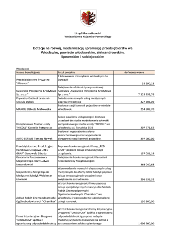 Urząd Marszałkowski Województwa Kujawsko-Pomorskiego Dotacje na rozwój, modernizację i promocję przedsiębiorstw we Włocławku, powiecie włocławskim, aleksandrowskim, lipnowskim i radziejowskim Włocławek Nazwa beneficjenta Przedsiębiorstwo Prywatne "Altravox" Kujawskie Poręczenia Kredytowe Sp. z o.o.” Prywatny Gabinet Lekarski Urszula Dąbek MAXOIL Elżbieta Małkowska Kompleksowe Studio Urody "NICOLL" Kornelia Potrzebska AUTO SERWIS Tomasz Nowak Przedsiębiorstwo Produkcyjno Handlowo Usługowe „RED GRAF” Genowefa Zdrada Kancelaria Rzeczoznawcy Majątkowego Jerzy Ludwik Lewandowski Tytuł projektu Z Altravoxem z koszykiem wirtualnym do Europy dofinansowanie 35 290,13 Zwiększenie zdolności poręczeniowej funduszu „Kujawskie Poręczenia Kredytowe Sp. z o.o.” Świadczenie nowych usług medycznych poprzez inwestycje Budowa stacji kontroli pojazdów w mieście Włocławek. 7 225 953,76 227 505,09 254 882,70 Zakup pawilonu usługowego i dostawa urzadzeń do studia modelowania sylwetki kompleksowego studia urody "NICOLL" we Włocławku ul. Toruńska 55 B Budowa i wyposażenie salonu samochodowego oraz wyposażenie okręgowej stacji kontroli pojazdów. 207 771,62 Poprawa konkurencyjności firmy „RED GRAF” poprzez zakup innowacyjnego urządzenia. Zwiększenie konkurencyjności Kancelarii Rzeczoznawcy Majątkowego 157 081,19 Wprowadzenie nowych i ulepszonych usług Niepubliczny Zakłąd Opieki medycznych do oferty NZOZ Medyk poprzez Medycznej Medyk Waldemar zakup innowacyjnych urządzeń oraz Litwiński zwiększenie zatrudnienia Wzrost konkurencyjności firmy poprzez zakup specjalistycznych maszyn dla Zakładu Robót Chemoodpornych i Ogólnobudowlanych 'Chemikor" we Zakład Robót Chemoodpornych i Włocławku i wprowadzenie udoskonalonej Ogólnobudowlanych "Chemikor" usługi na rynek. Wzrost konkurencyjności Firmy Inżynieryjno Drogowej "DROGTOM" Spółka z ograniczoną Firma Inżynieryjno - Drogowa odpowiedzialnością poprzez nabycie "DROGTOM" Spółka z mobilnej wytwórni mieszanek na zimno z ograniczoną odpowiedzialnością zastosowaniem asfaltu spienionego 297 500,00 264 040,68 296 933,32 130 900,00 1 606 500,00 Wzmocnienie pozycji i wzrost konkurencyjności NZOZ "WITA" Jabłońska Krystyna dzięki zakupowi urządzeń rehabilitacyjnych. Uruchomienie produkcji elementów do ANWIS Polska Spółka z systemów osłon zewnętrznych wraz z ograniczoną odpowiedzialnością budową budynku produkcyjnego. Niepubliczny Zakład Opieki Zdrowotnej "WITA "Jabłońska Krystyna Przedsiębiorstwo Handlowo Usługowe HERN Maciej Maciak Telewizja informacyjna dla Włocławka – CW24 tv Zakup innowacyjnej maszyny poligraficznej sposobem podniesienia konkurencyjności Radio Hit-Marfix ZPCHR Wiesław firmy Radio Hit-Marfix ZPCHR Wiesław Rafalski Rafalski Rozbudowa i modernizacja parku maszynowego w celu jakościowych i ilościowych zmian w ofercie firmy KAR-POL Kar-Pol-karol Górczyński Karol Górczyński Wzrost konkurencyjności firmy CUKIERNIAPIEKARNIA JAN SZYLING, w związku z Cukiernia Szyling Jadwiga Szyling rozszerzeniem działalności o nowe produkty "Społem" Powszechna Spółdzielnia Spożywców Modernizacja Piekarni nr 1 we Włocławku 301 345,14 3 395 784,79 285 496,98 638 823,73 565 691,26 199 750,00 215 030,16 Reality spółka z ograniczoną odpowiedzialnością Poprawa konkurencyjności przedsiebiorstwa poprzez wprowadzenie zmian w procesie pracy na magazynie i wprowadzenie nowych produktów 128 550,60 Przedsiębiorstwo Wielobranżowe Tele-Max Przemysław Wasilewski, Urszula Wasilewska,Piotr Smardzewski Spółka Jawna Wzrost konkurencyjności przedsiębiorstwa poprzez zakup i uruchomienie maszyn wraz z oprzyrządowaniem w celu powiększenia gamy produktów o nowe wyroby do energooszczędnych opraw świetlnych. 332 702,75 METALIK Przemysław Wasielewski Wzmocnienie konkurencyjności przedsiębiorstwa poprzez zakup nowoczesnych maszyn do obróbki metalu i uruchomieniu produkcji nowych detali 103 212,52 Przedsiębiorstwo Techniczne NOMINAL Spółka z ograniczoną odpowiedzialnością Wzrost konkurencyjności Przedsiębiorstwa Technicznego NOMINAL Sp. z o.o. we Włocławku poprzez wdrożenie innowacyjnej technologii zautomatyzowanego spawania łukiem krytym. 807 500,00 Detal-Met Spółka z ograniczoną Zwiększenie i unowocześnienie zdolności odpowiedzialnością produkcyjnych w firmie Detal-Met sp. z o.o. Zakup urządzeń i uruchomienie nowych linii wytwórczych do produkcji azotanów (wapnia i magnezu) oraz do produkcji saletry Zakłady Wytwórcze "CHEKO" Sp. amonowej porowatej w ZW "CHEKO" Sp. z z o.o. o.o. we Włocławku. 3 123 750,00 1 027 106,78 Dostosowanie "OPAKOFARB" Zakład Zakład Produkcji Opakowań Produkcji Opakowań Sp. z o. o. z siedzibą we "OPAKOFARB" Spółka z Włocławku do wymogów środowiska ograniczoną odpowiedzialnością poprzez inwestycje na Wydziale Litografii Udział Przedsiębiorstwa Odzieżowego Przedsiębiorstwo Odzieżowe DRWAL w XXI Międzynarodowych Targach Drwal Adam Zieliński Adam Hohe Jagd & Fischerei & Off-Road w Zieliński Zakład Pracy Chronionej Salzburgu Reality Spółka z Ograniczoną Odpowiedzialnością 35 004,42 22 546 759,93 Tytuł projektu Pobudowanie myjni bezdotykowej w miejscowości Brześć Kujawski przez Firmę Weld-Amet Dawid Szwankowski Weld-Amet Dawid Szwankowski Zwiększenie konkurencyjności Zakładu Usług Motoryzacyjno – Diagnostycznych Okręgowa Zakład Usług Motoryzacyjno – Stacja Kontroli Pojazdów Bednarek i S-ka w Diagnostycznych Okręgowa Lubieniu Kujawskim poprzez zakup Stacja Kontroli Pojazdów nowoczesnych urządzeń kontrolno – Bednarek i S-ka diagnostycznych i usługowych. Zmiana sposobu świadczenia usług w Firma Handlowo-Usługowa "J&E" przedsiębiorstwie poprzez zakup - Jakub Girczyc nowoczesnych urządzeń. Wzrost konkurencyjności przedsiębiorstwa przez realizację inwestycji oraz wzrost FIRMA TIMES zatrudnienia Wzrost konkurencyjności PPUH Świat Wody poprzez remont i adaptację 