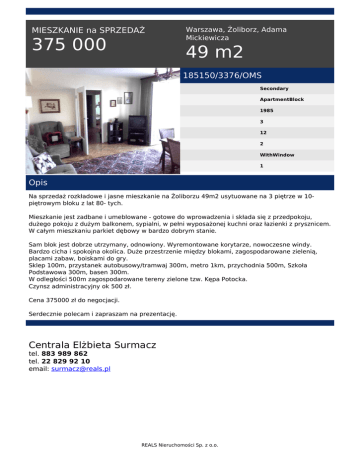 MIESZKANIE na SPRZEDAŻ 375 000 Warszawa, Żoliborz, Adama Mickiewicza 49 m2 185150/3376/OMS Secondary ApartmentBlock 1985 3 12 2 WithWindow 1 Opis Na sprzedaż rozkładowe i jasne mieszkanie na Żoliborzu 49m2 usytuowane na 3 piętrze w 10piętrowym bloku z lat 80- tych. Mieszkanie jest zadbane i umeblowane - gotowe do wprowadzenia i składa się z przedpokoju, dużego pokoju z dużym balkonem, sypialni, w pełni wyposażonej kuchni oraz łazienki z prysznicem. W całym mieszkaniu parkiet dębowy w bardzo dobrym stanie. Sam blok jest dobrze utrzymany, odnowiony. Wyremontowane korytarze, nowoczesne windy. Bardzo cicha i spokojna okolica. Duże przestrzenie między blokami, zagospodarowane zielenią, placami zabaw, boiskami do gry. Sklep 100m, przystanek autobusowy/tramwaj 300m, metro 1km, przychodnia 500m, Szkoła Podstawowa 300m, basen 300m. W odległości 500m zagospodarowane tereny zielone tzw. Kępa Potocka. Czynsz administracyjny ok 500 zł. Cena 375000 zł do negocjacji. Serdecznie polecam i zapraszam na prezentację. Centrala Elżbieta Surmacz tel. 883 989 862 tel. 22 829 92 10 email: [email protected] REALS Nieruchomości Sp. z o.o. Powered by TCPDF (www.tcpdf.org)