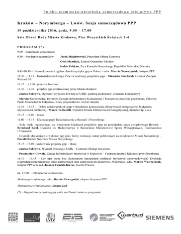 Polsko-niemiecko-ukraińska samorządowa inicjatywa PPP Kraków – Norymberga – Lwów. Sesja samorządowa PPP 19 października 2016, godz. 9.00 – 17.00 Sala Obrad Rady Miasta Krakow a, Plac Wszystkich Św iętych 3 -4 PROGRAM (*) 9.00 – Rejestracja uczestników 9.30 – Powitanie uczestników: Jacek Majchrowski, Prezydent Miasta Krakowa Oleh Mandiuk, Konsul Generalny Ukrainy Isolde Felskau, Z-ca Konsula Generalnego Republiki Federalnej Niemiec 9.45-10.30 – Uwarunkowania i ogólna charakterystyka ppp w Polsce – adw. Marcin Wawrzyniak, Instytut PPP 10.30 – 11.15 – Doświadczenia Grupy Vinci w realizacji projektów ppp – Mirosław Józefczuk, Członek Zarządu Warbud SA 11.15 – 11.30 - przerwa kawowa 11.30 – 12.30 – projekty ppp zrealizowane przez Miasto Kraków: - Janina Pokrywa, Dyrektor Wydziału Inwestycji UMK: parking podziemny, cmentarz komunalny) - Marcin Korusiewicz, Dyrektor Zarządu Infrastruktury Komunalnej i Transportu: przejścia podziemne, Zbiorczy Punkt Gromadzenia Odpadów, wiaty przystankowe i rower miejski 12.30 – 13.15 – Dobre polskie praktyki ppp w dziedzinie podnoszenia efektywności energetycznej budynków użyteczności publicznej– Marek Tobiacelli, Dyrektor Działu Efektywności Energetycznej, Siemens Sp. z o.o 13.15 – 14.00 – lunch 14.00 – 15:15 – Dlaczego ppp? Doświadczenia z Bawarii i Norymbergi: - Rola rządu regionalnego we wspieraniu lokalnych projektów ppp na przykładzie kraju związkowego Bawarii – Bernhard Kohl, Dyrektor ds. Budownictwa w Bawarskim Ministerstwie Spraw Wewnętrznych, Budownictwa i Transportu - Czynniki decydujące o wyborze ppp jako formy realizacji zadań publicznych na przykładzie Miasta Norymbergi – Harald Riedel, Skarbnik Miasta Norymbergi. 15.15 – 16.00 - krakowskie projekty ppp – plany - Janina Pokrywa, Wydział Inwestycji UMK – Centrum Obsługi Inwestora - Przemysław Chwała, Zarząd Infrastruktury Sportowej w Krakowie – Centrum Sportu i Rekreacji przy Eisenberga 16.10 – 16.45 – Czy ppp może być skutecznym narzędziem realizacji inwestycji samorządowych? Dyskusja z udziałem reprezentantów miast partnerskich oraz zaproszonych ekspertów. Moderacja : adw. Marcin Wawrzyniak, Instytut PPP oraz red. Jolanta Czudak-Kiersz, Gazeta Prawna ok. 17.00 – zakończenie seminarium. Moderacja konferencji: adw. Marcin Wawrzyniak, ekspert Instytutu PPP Tłumaczenie symultaniczne: Lingua Lab (*) – Organizatorzy zastrzegają sobie możliwość zmian w programie