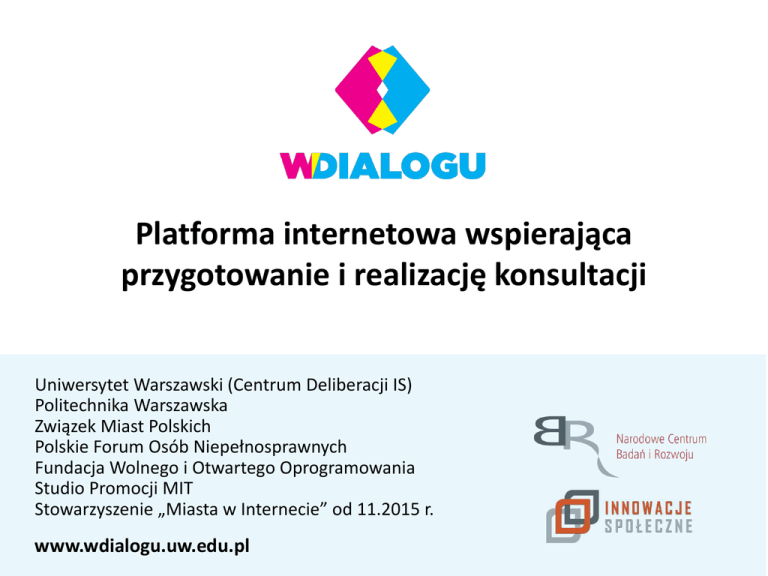 Platforma internetowa wspierająca przygotowanie i realizację konsultacji Uniwersytet Warszawski (Centrum Deliberacji IS) Politechnika Warszawska Związek Miast Polskich Polskie Forum Osób Niepełnosprawnych Fundacja Wolnego i Otwartego Oprogramowania Studio Promocji MIT Stowarzyszenie „Miasta w Internecie” od 11.2015 r. www.wdialogu.uw.edu.pl W Dialogu wspiera działania urzędnika Krok 1: Przygotowuje plan i konsultuje go wew. um -> wypełnia formatkę: cel, pytania; wybiera narzędzia -> prosi o komentarz innych urzędników Krok 2: Opracowuje materiały informacyjne Krok 3: Uruchamia proces rekrutacji Krok 4: Prowadzi debaty (tekstowe lub głosowe) lub ankiety Krok 5: Analizuje materiał z użyciem mapy argumentów Krok 6: Raportuje wyniki ze spotkań bezpośrednich i online W Dialogu wspiera działania mieszkańca Krok 1: Współtworzy materiały informacyjne, Krok 2: Proponuje alternatywne rozwiązania problemu, Krok 3: Uczestniczy w wybranej formie uargumentowanej debaty (spotkania online i offline), Krok 4: Wybiera rozwiązania dla miasta w odwołaniu do mapy argumentów (konsens/głosowanie), Krok 5: Uzgadnia treść raportów z konsultacji. Zgodność W Dialogu z ramami interoperacyjności i wytycznymi WCAG2.0 Platforma jest dostępna dla: • osób niewidomych współpraca z czytnikami ekranu, audiodeskrypcja, opis schematów i map • osób słabowidzących powiększenie, kontrast obrazu • osób niesłyszących tłumaczenie na język migowy, transkrypcja, uproszczony język dotyczy: funkcji pomocy w oprogramowaniu, treści konsultacji • osób niepełnosprawnych intelektualnie uproszczony język dotyczy: funkcji pomocy w oprogramowaniu, treści konsultacji • osób niepełnosprawnych ruchowo zapewnienie odpowiedniej ilości czasu na reakcję